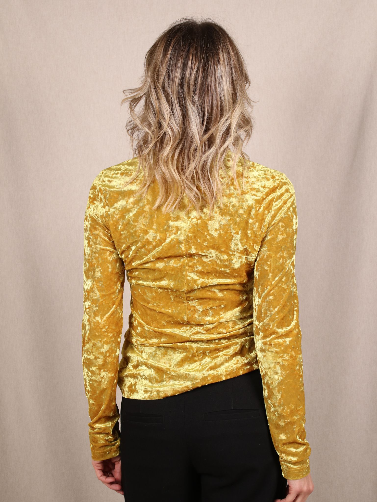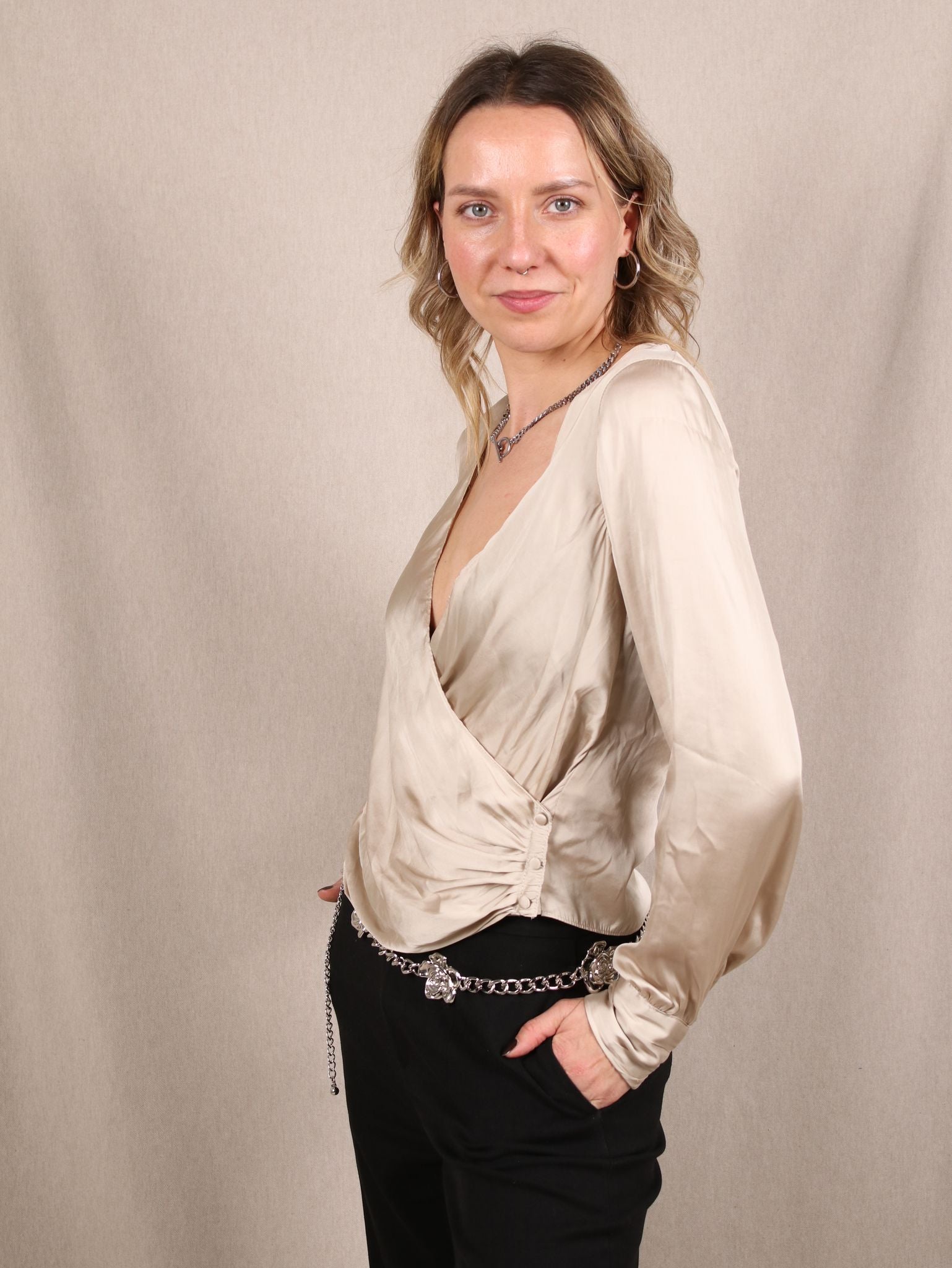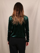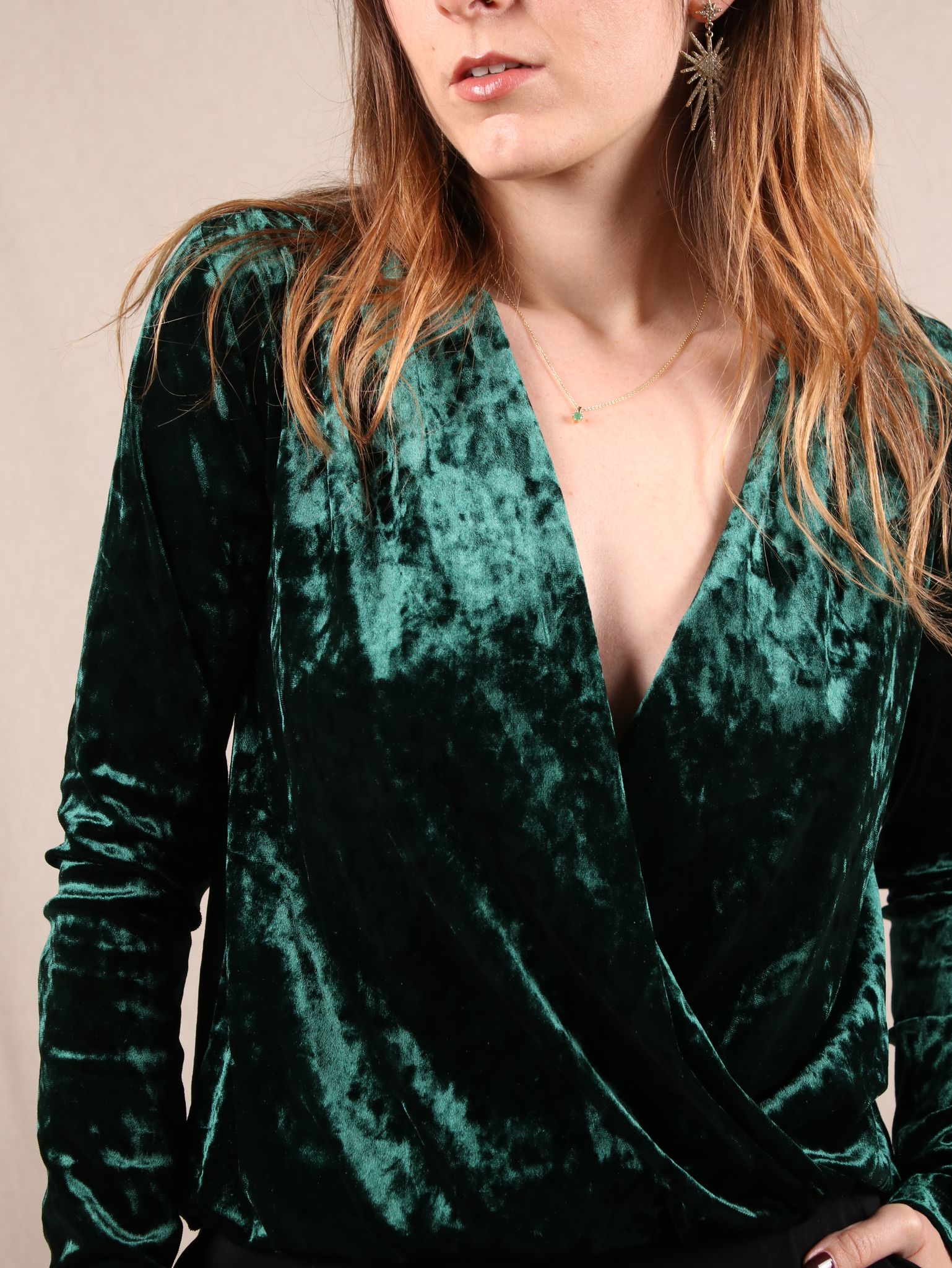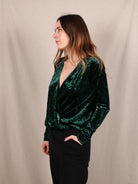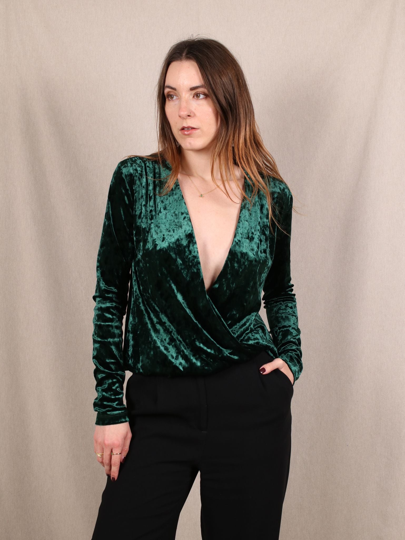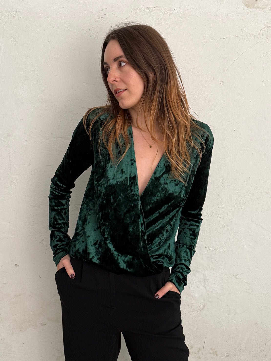 Maria trägt eine dunkelgrüne Wickelbluse - wir fotografieren an echten Menschen