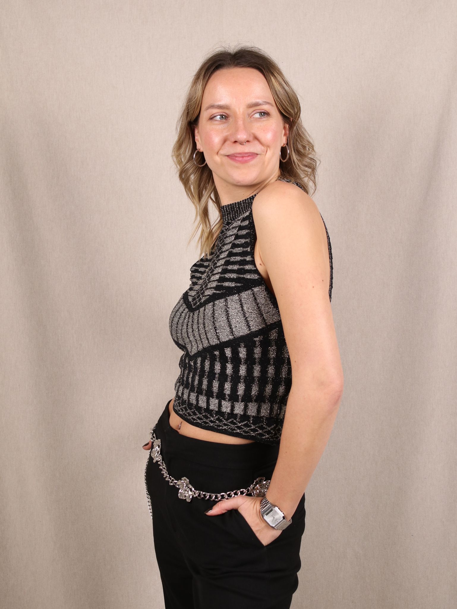 Dieses Secondhand Top von H&M Gold Lable bringt dir Gold-Glitzer-Power, die wirkt, als würdest du gleich in einem futuristischen Clubhit-Video auftauchen. Der auffällige Print und die eng anliegende Passform sorgen dafür, dass dein Party-Look definitiv nicht in der Menge untergeht. Ein Piece für Nächte, in denen du lieber der Soundtrack bist als nur die Background-Story.
