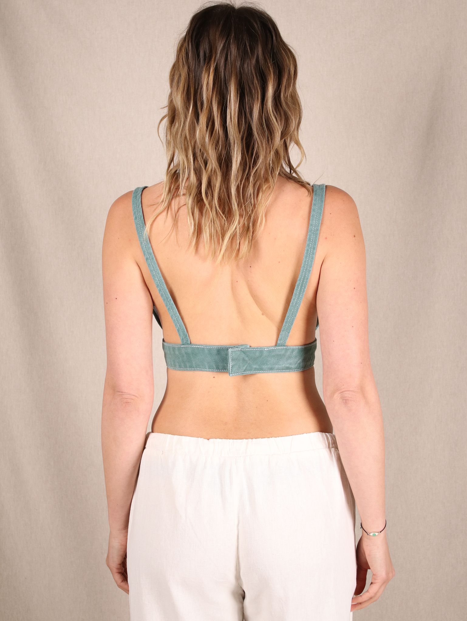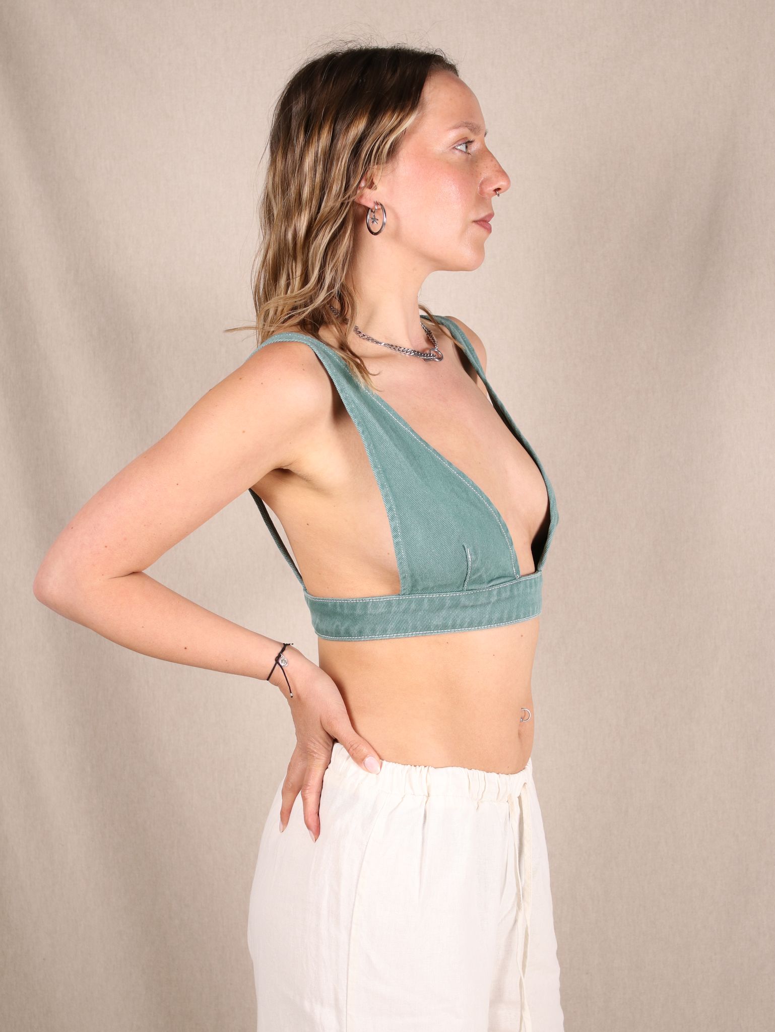 Grüner Denim, tiefer V-Ausschnitt und ein Schnitt, der Selbstbewusstsein schreit – dieses Bustier von Lioness ist gemacht für Statement-Looks. Ob mit weiter Leinenhose (wie hier) oder unter einem offenen Hemd – das Piece bringt Y2K-Energie mit einem Hauch Streetstyle-Coolness. Ideal für Festivals, heiße City-Days oder einfach, wenn dein Outfit Haltung zeigen soll.