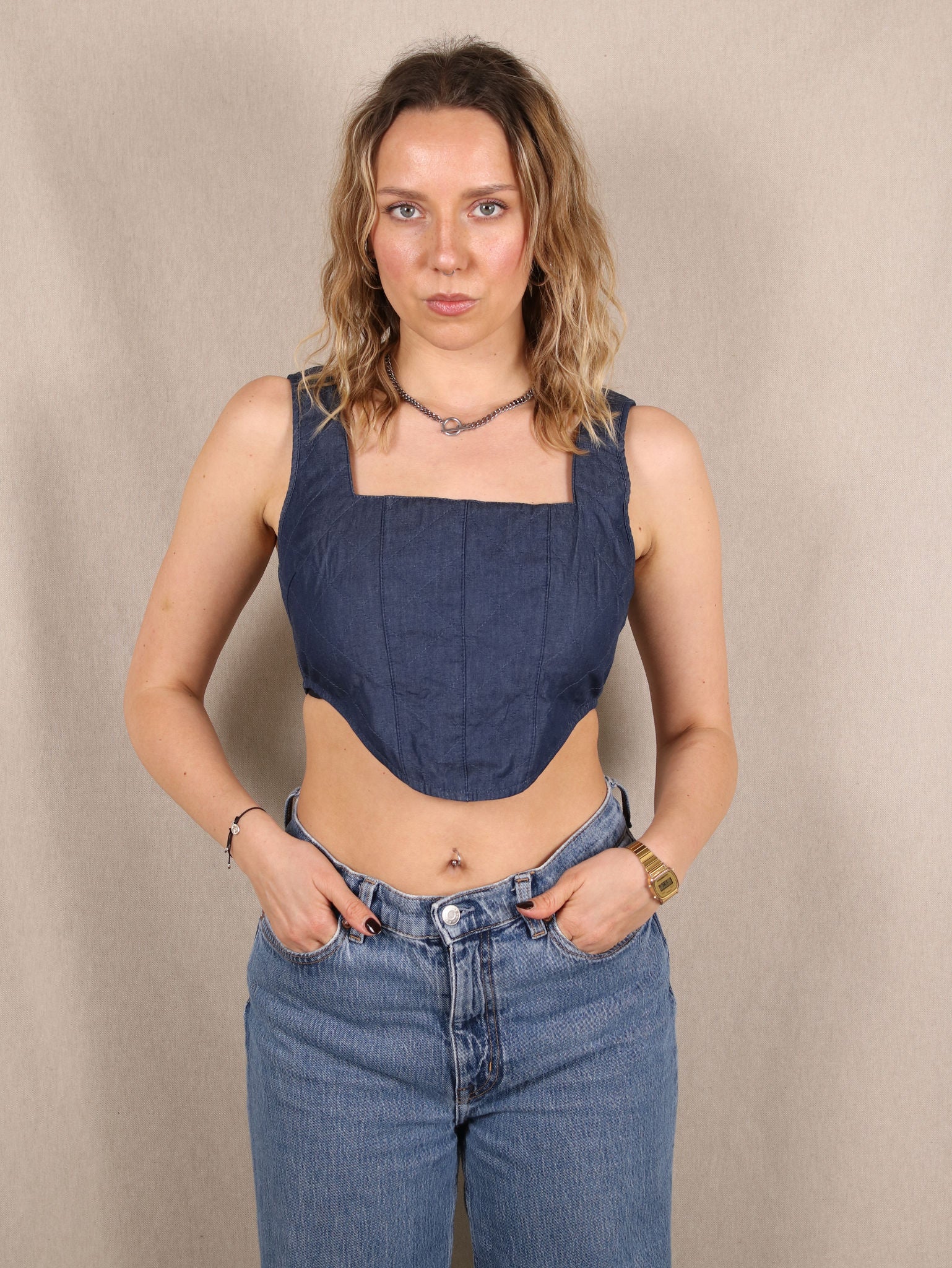 Diese Denim-Corsage von Lioness ist der Inbegriff des Cool-Girl-Vibes! Der gesteppte Baumwollstoff sorgt für eine edgy Struktur, während der Cropped-Schnitt deine Taille perfekt in Szene setzt. Kombiniere sie mit einer lässigen Jeans für den ultimativen Denim-on-Denim-Look oder mit einer weiten Hose für einen Stilbruch mit Attitude. Secondhand-Schatz mit maximalem Style-Faktor!