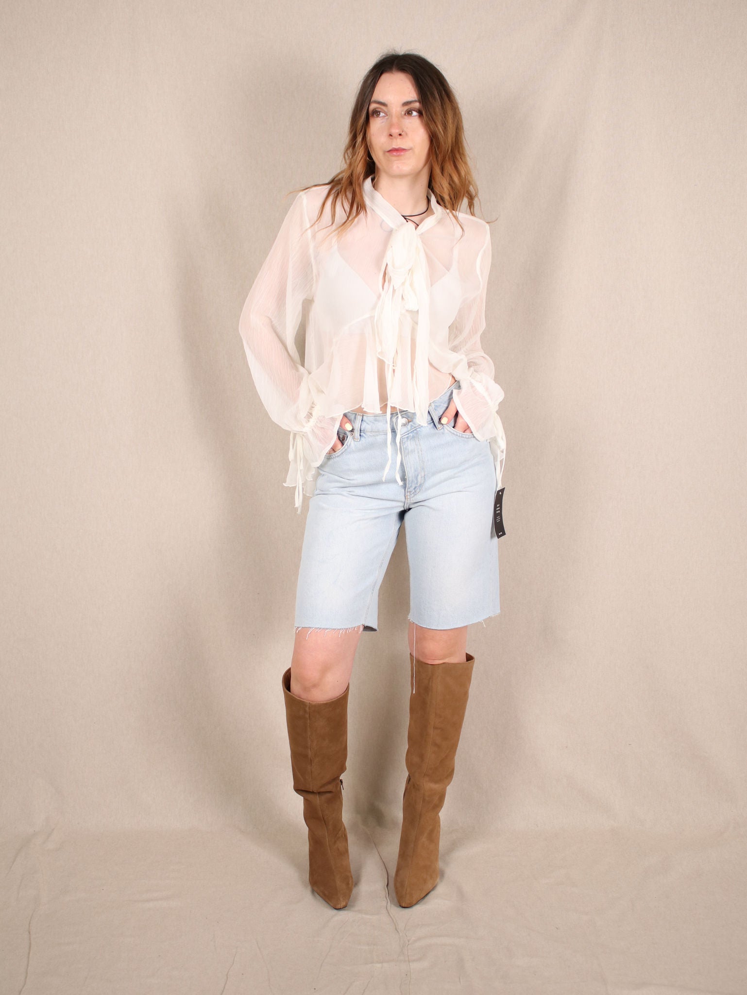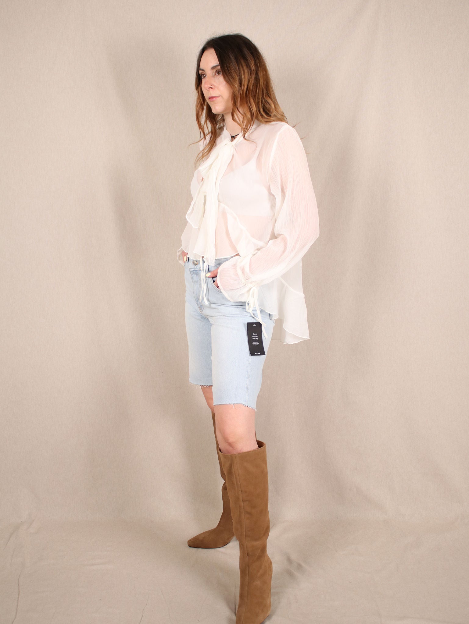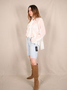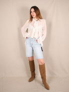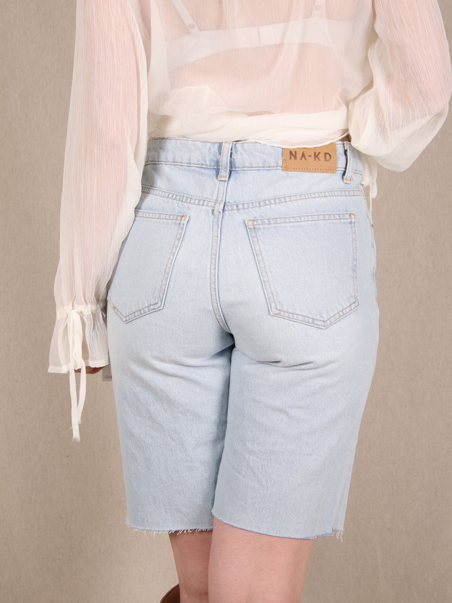 Lässig, aber mit Style - diese neuwertige NA-KD Jeans-Shorts im Bermuda Fit bringen den perfekten Mix aus Vintage-Vibes und modernem Fit. Der hochwertige Baumwoll-Denim sitzt bequem, während der kniellange Schnitt mit ausgefranstem Saum für den extra coolen Touch sorgt. Perfekt für einen easy Look mit Sneakern oder edgy mit Boots - Secondhand, aber 100 % on point!