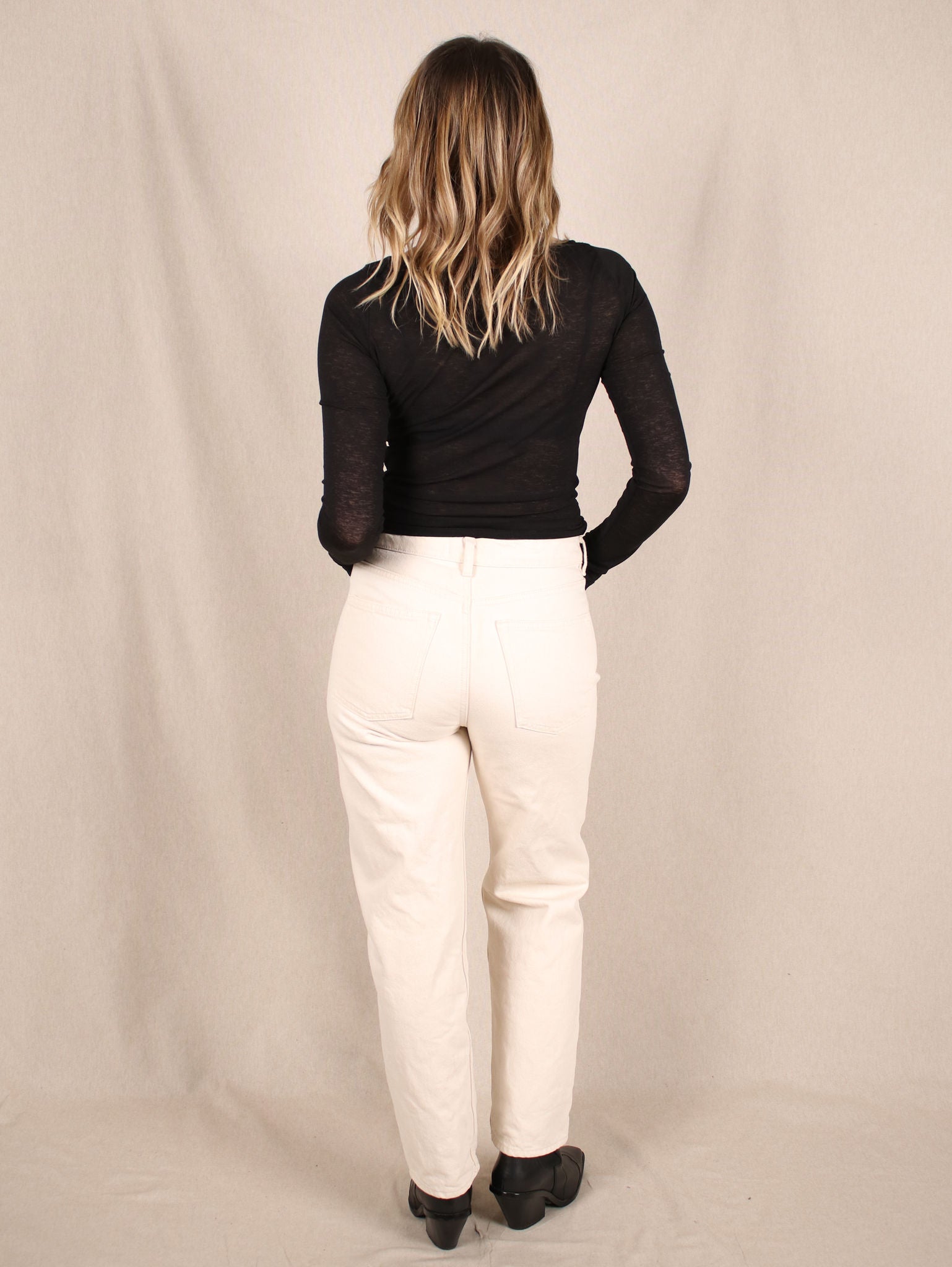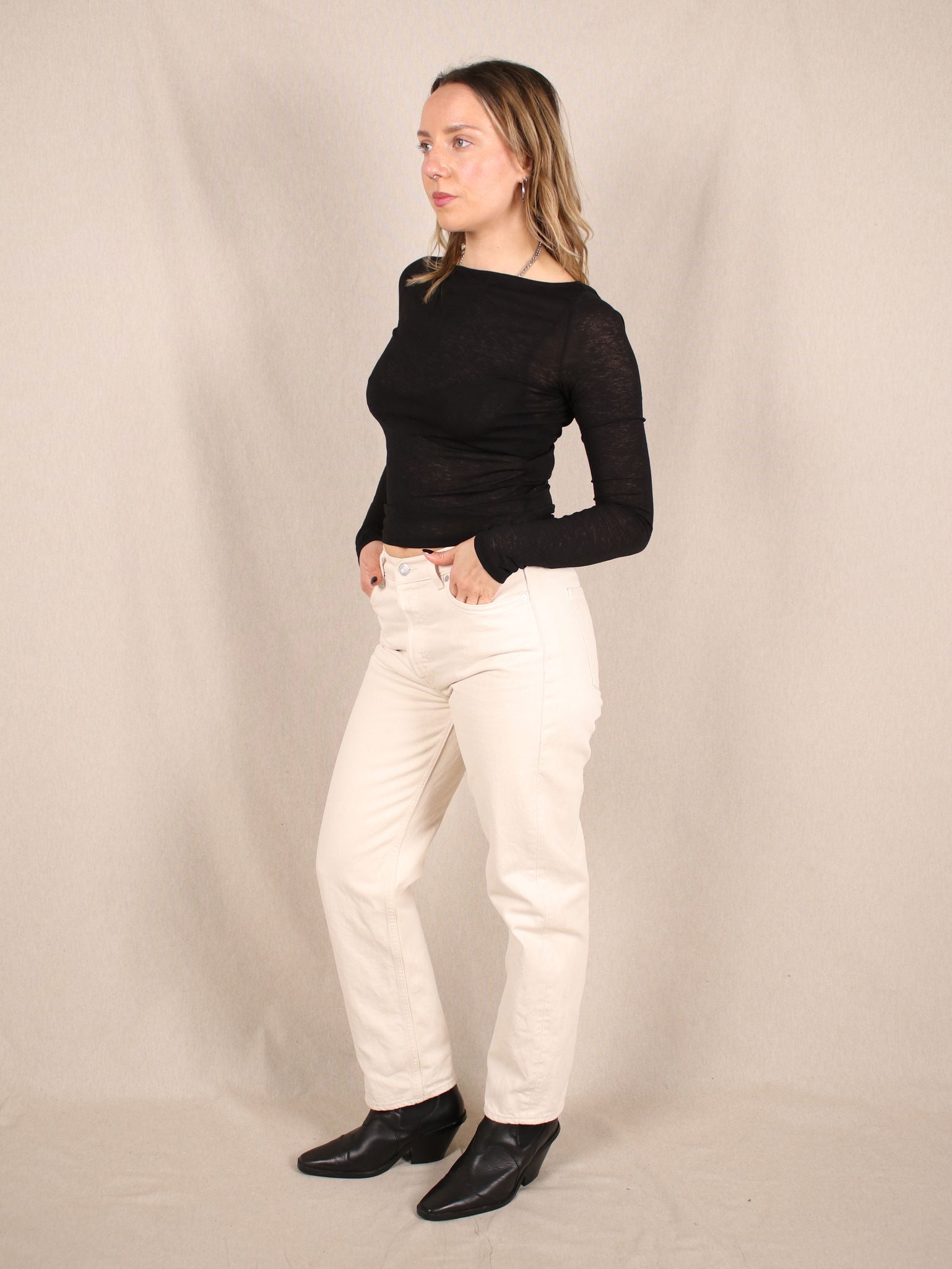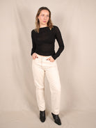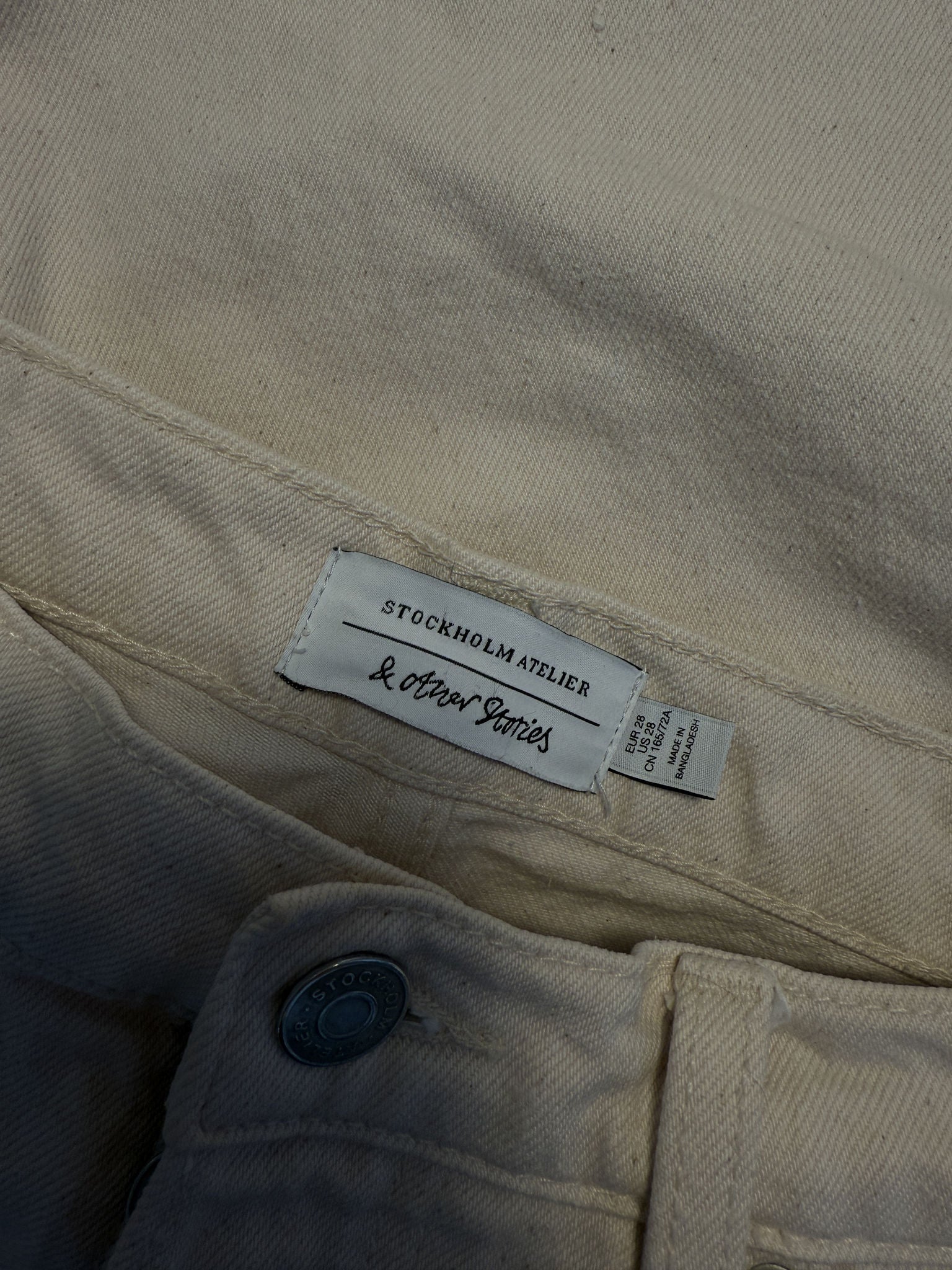 Diese Secondhand & Other Stories Mom-Jeans aus reiner Baumwolle begeistert mit ihrem entspannten Fit und dem zeitlosen Cremeton. Vielseitig kombinierbar und ein echtes Secondhand-Essential für jeden Tag.