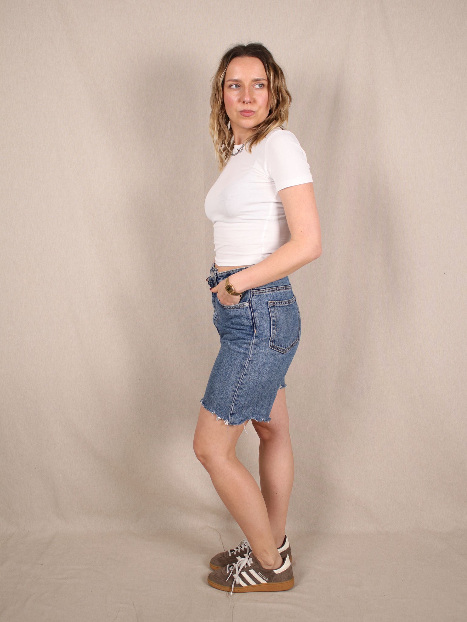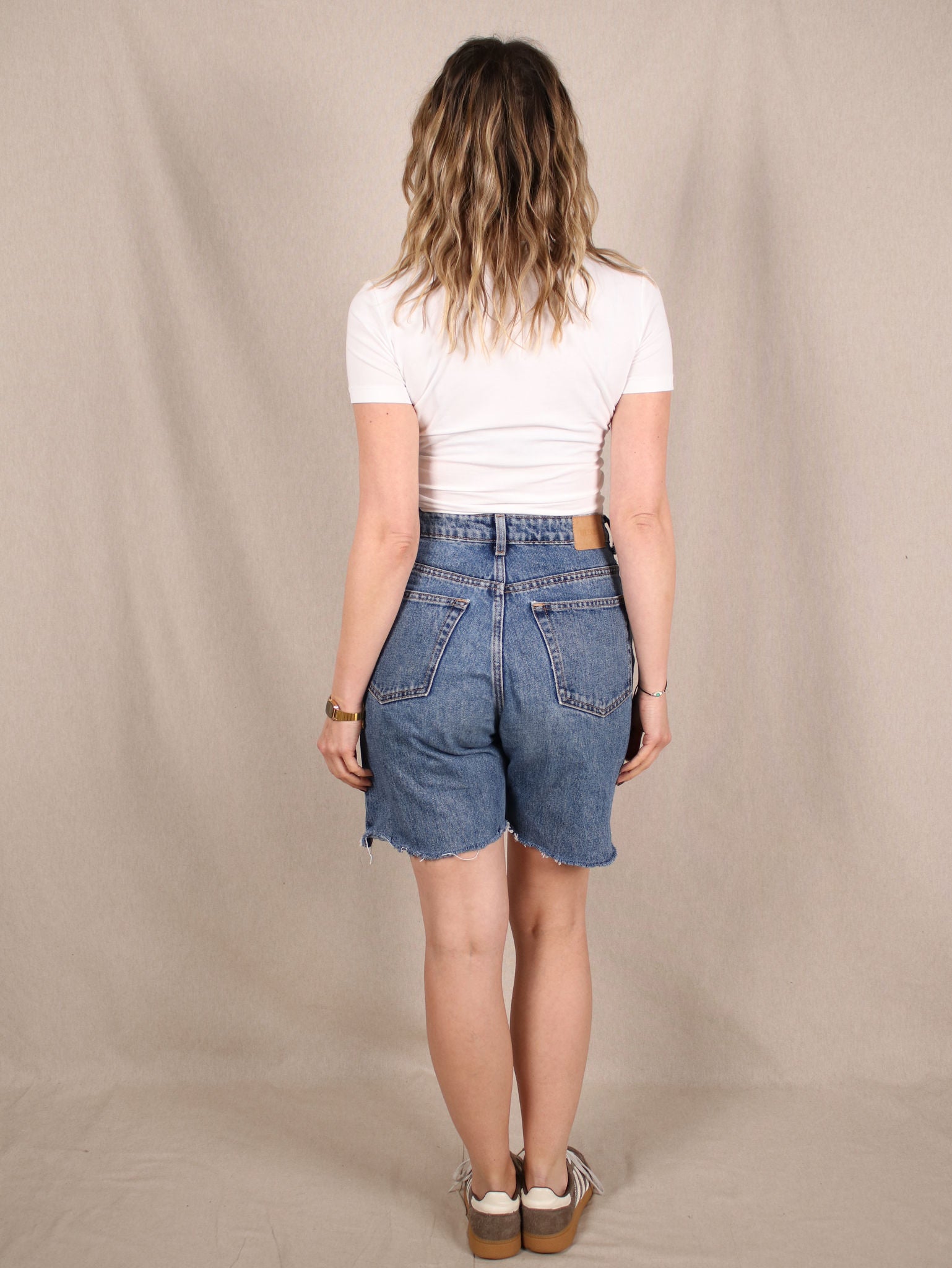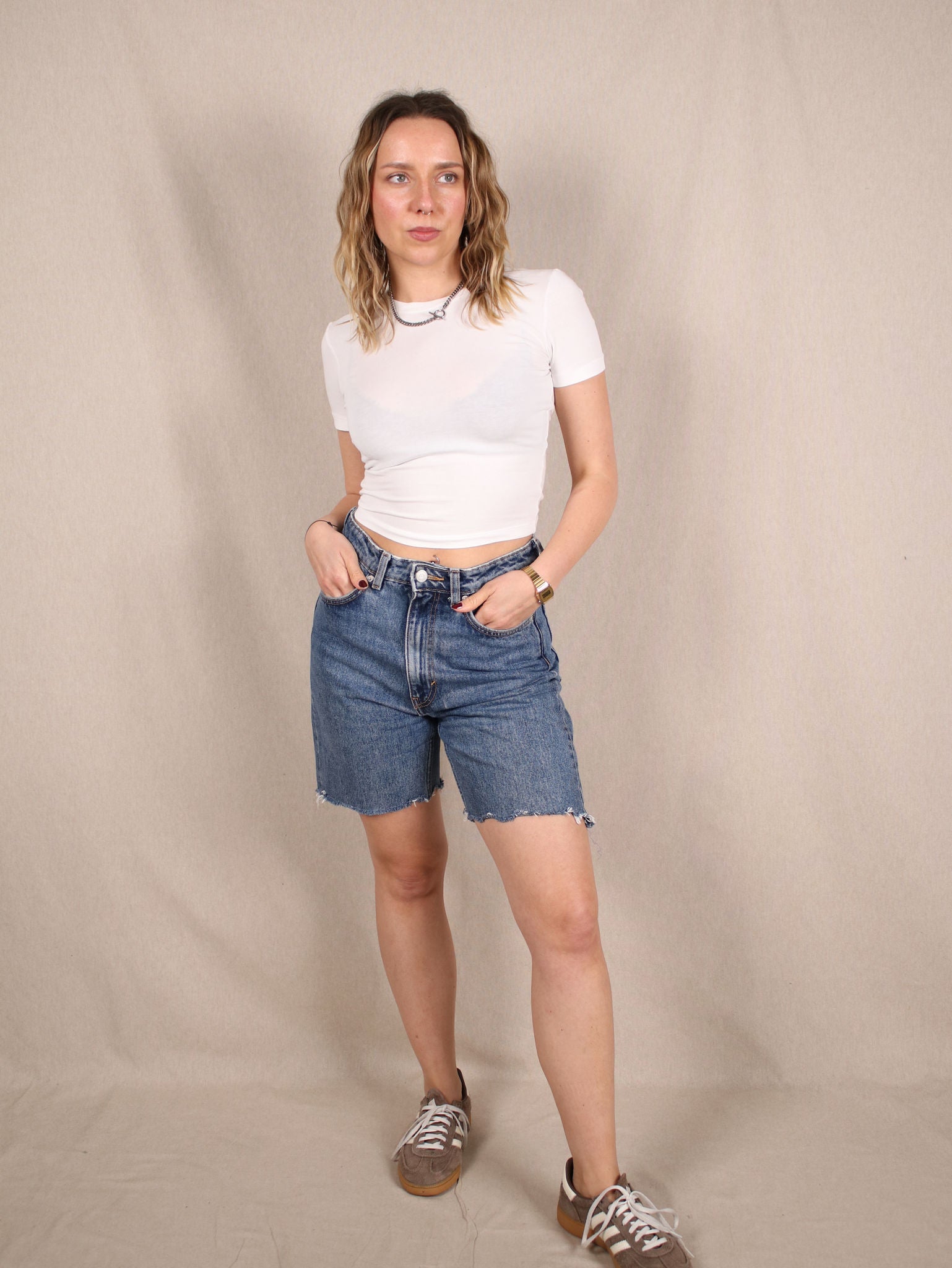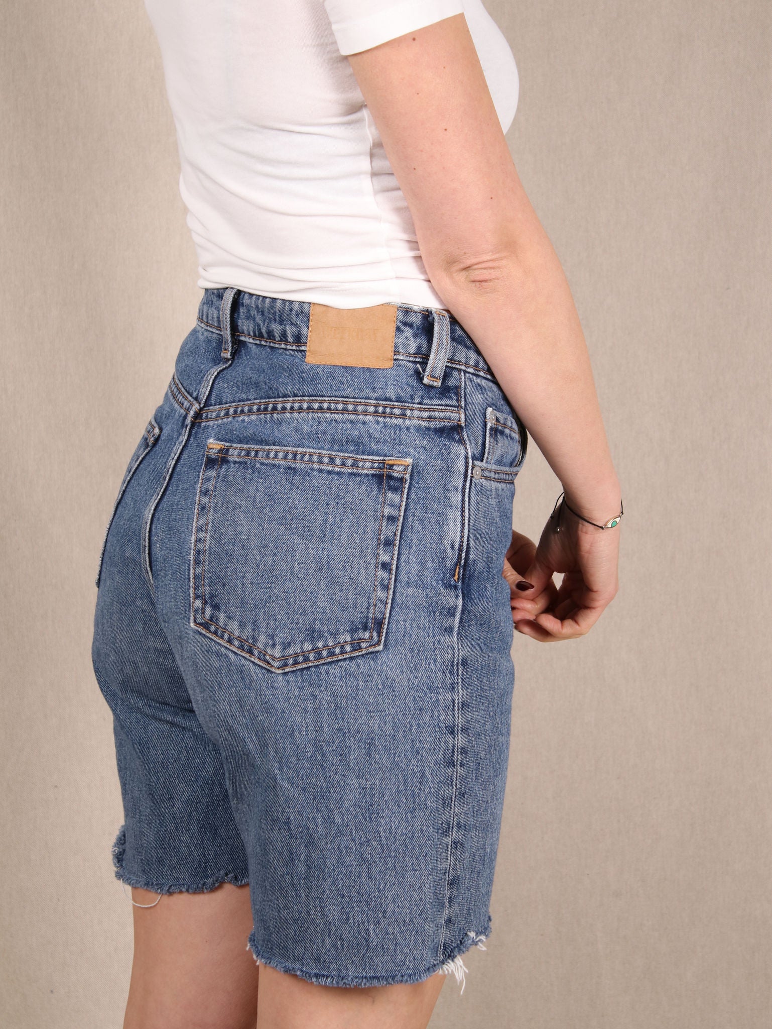 Diese Secondhand-Shorts von Weekday sind ein echtes Upcycling-Piece mit Charakter. Die Lash Extra High Mom Jeans wurde in eine lässige Shorts verwandelt - mit perfektem Vintage-Blue, rohem Saum und extra hoher Taille. Für den ultimativen 90s-Vibe, der nie aus der Mode kommt!