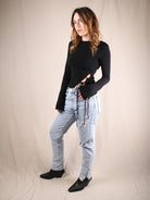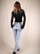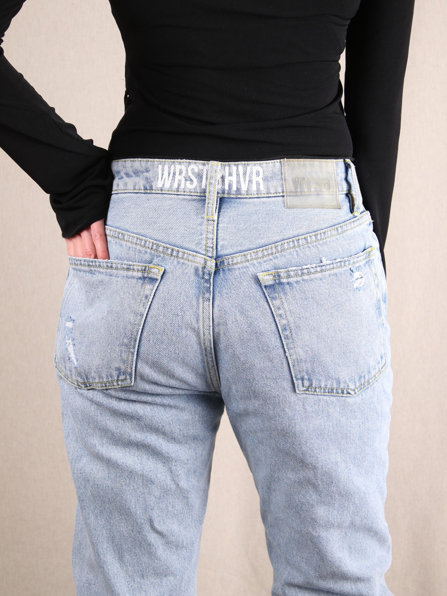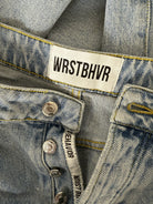 Coole Mid Waist Mom Jeans von WRSTBHVR im Used Look mit großem Logo hinten und Reißverschluss am Saum
