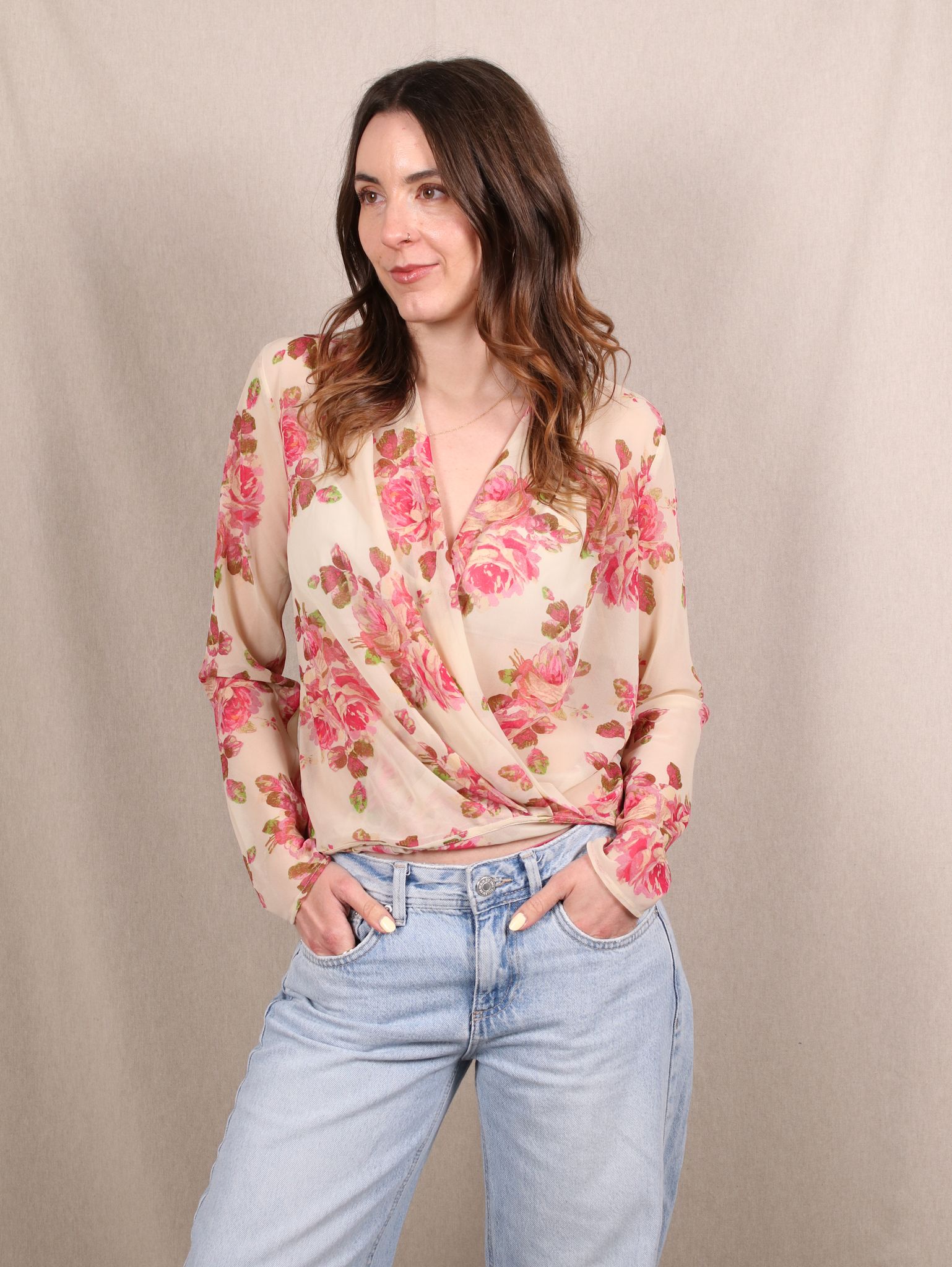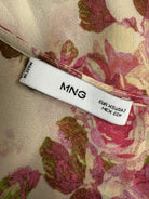 Diese Secondhand Bluse im Wickel-Look von Mango bringt florale Leichtigkeit in deinen Look. Zarter Crêpe mit pinkem Blumenprint trifft auf eine fließende Silhouette und einen lässigen Wrap-Style. Feminin, verspielt und perfekt für Tage, an denen dein Outfit für dich spricht.