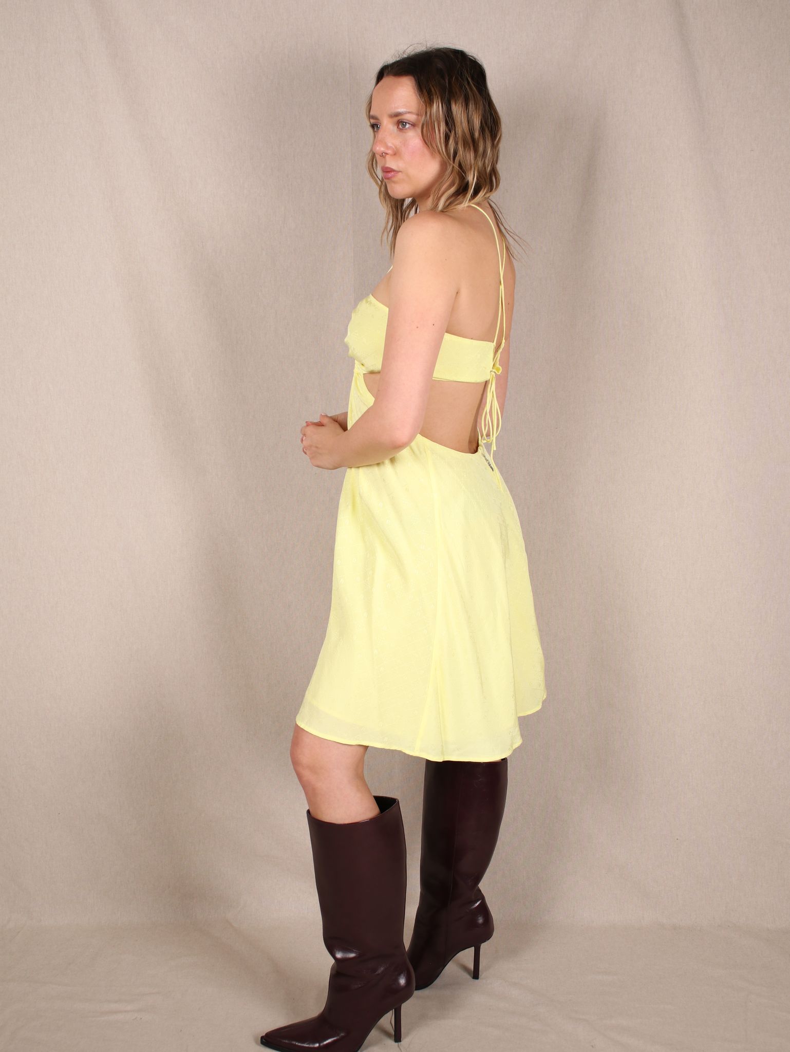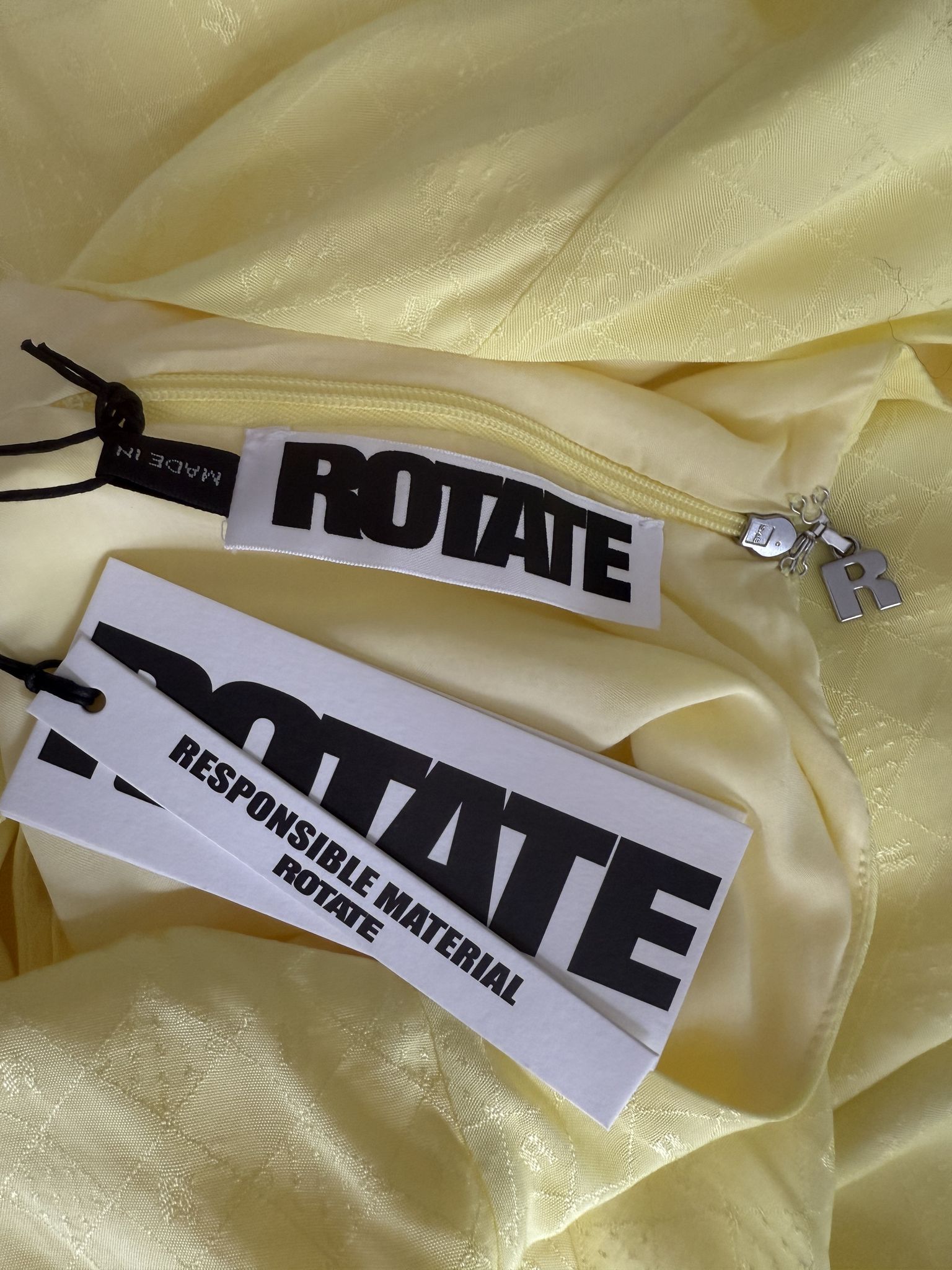 Dieses neuwertige gelbe Kleid von Rotate ist wie ein Sonnenstrahl mit Fashion-Flair. Luftige Viskose trifft auf coole Cut-Outs und verspielte Logo-Struktur - das perfekte Piece für heiße Tage, laue Nächte oder spontane Gelato-Runs. Süß, flirty und einfach fresh.