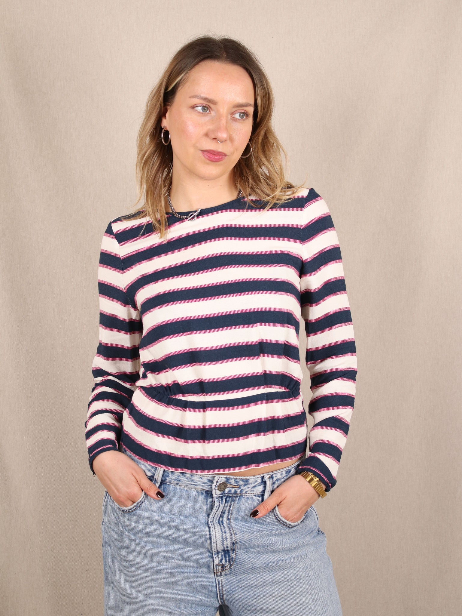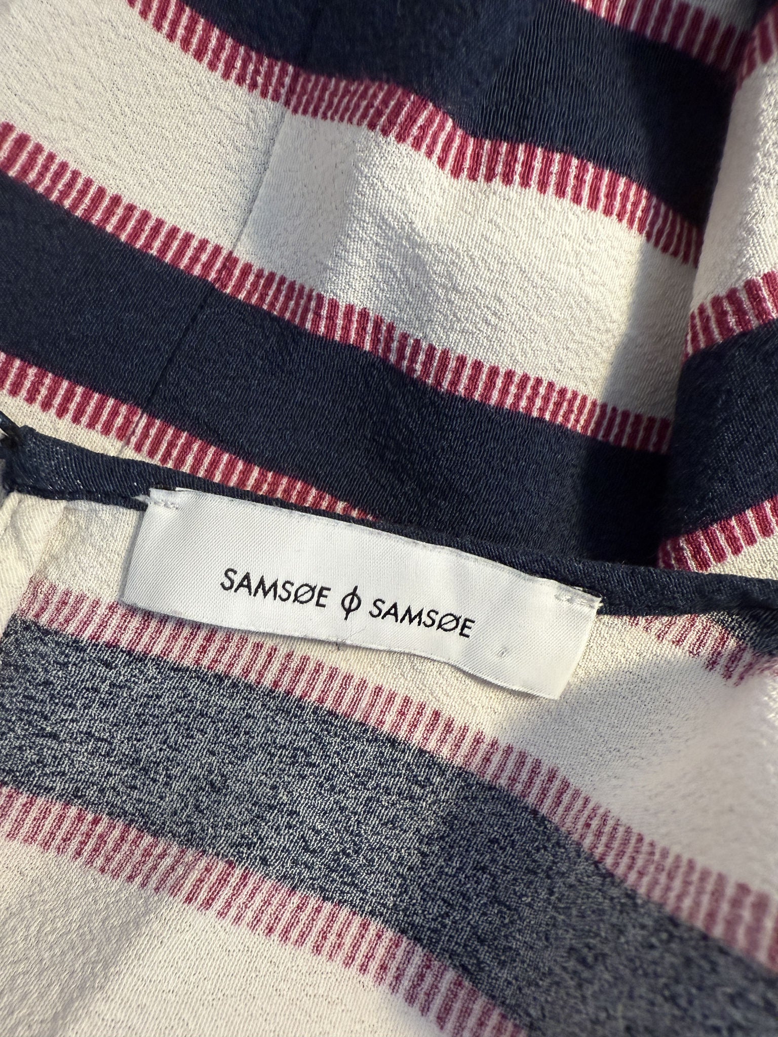Diese Secondhand Bluse von Samsøe Samsøe bringt mit seinem maritimen Streifen-Design und der soften Viskose-Crepe-Qualität einen Hauch Scandi-Coolness in deine Garderobe. Perfekt für den angesagten Fisherman-Look - egal, ob casual zur Jeans oder edgy mit Lederrock. Ein echtes Statement-Piece für deinen Kleiderschrank!