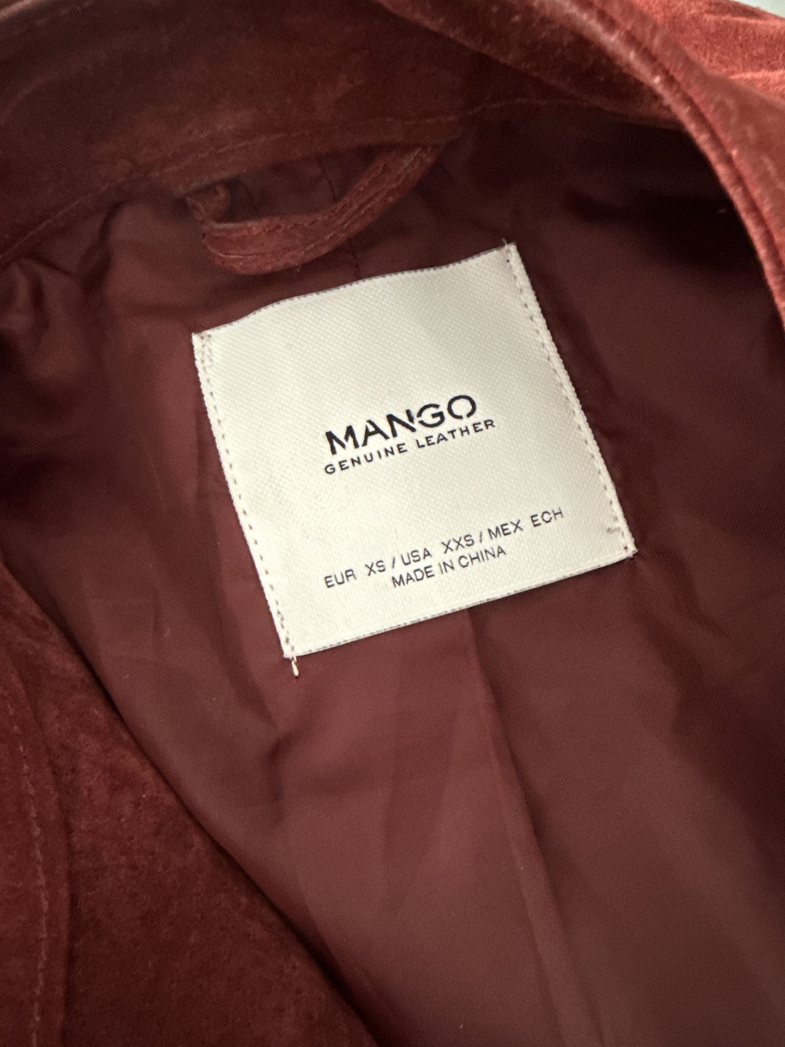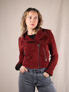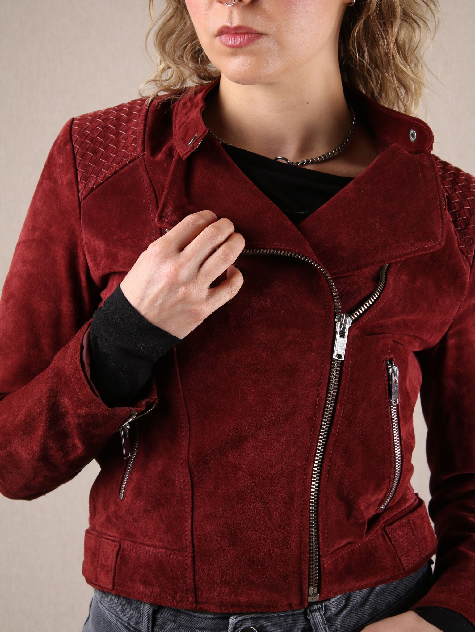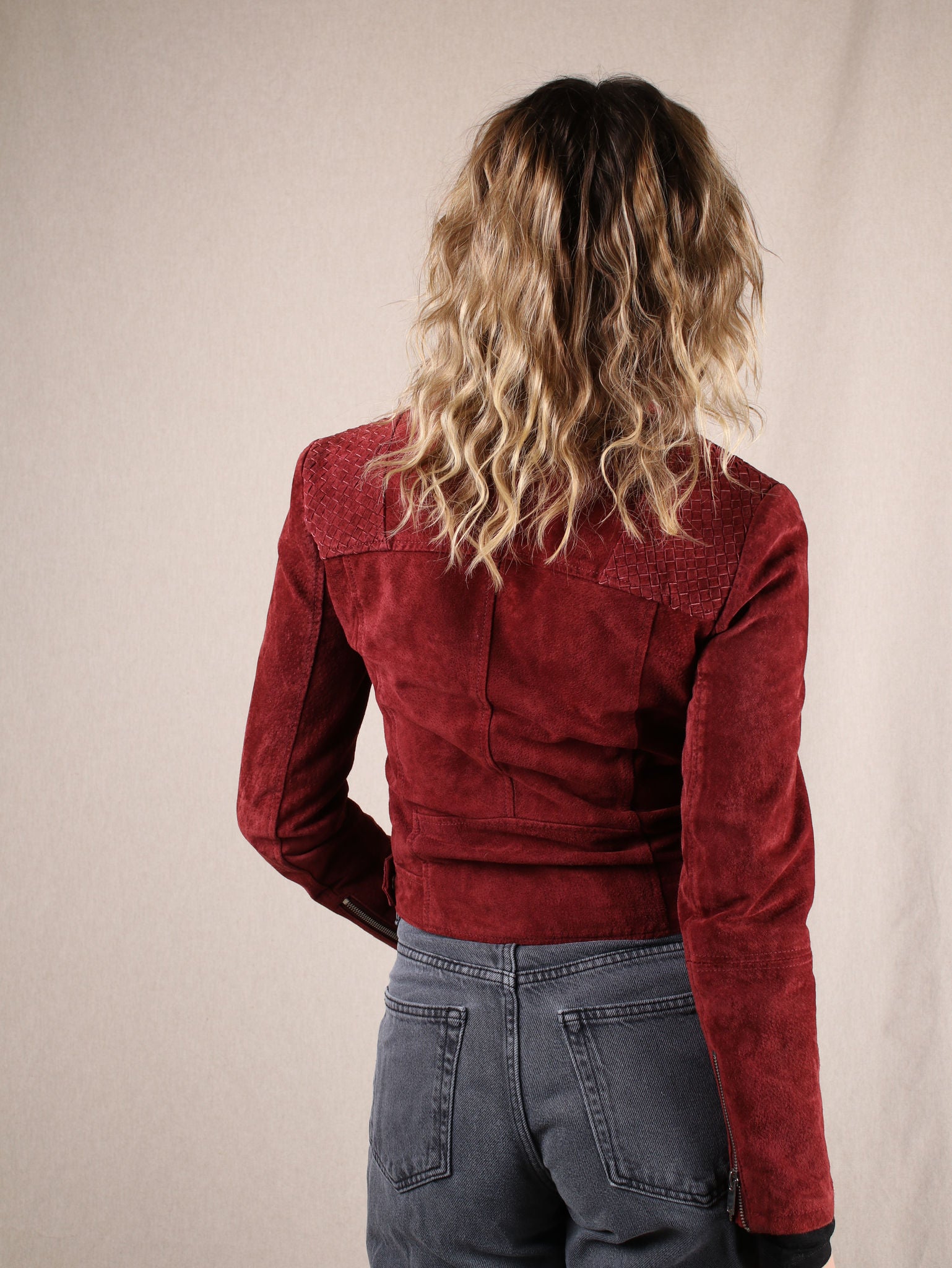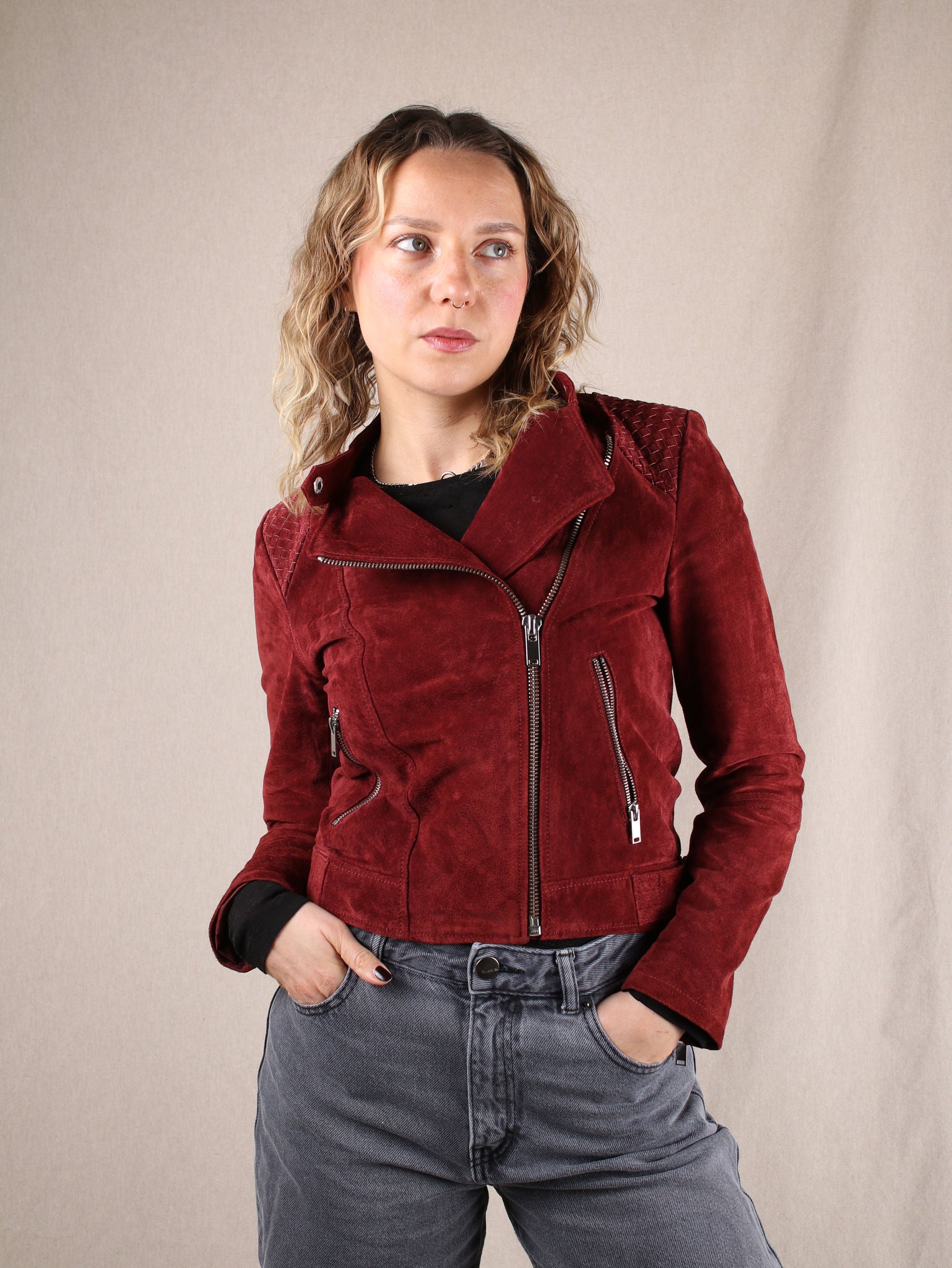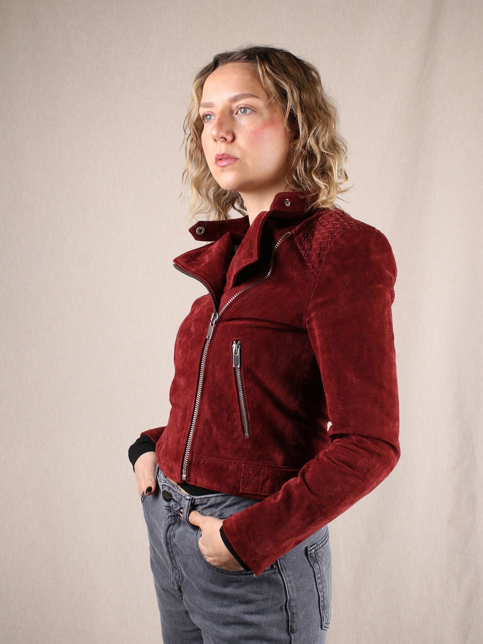 Secondhand Biker-Jacke aus Veloursleder in Bordeaux von Mango.