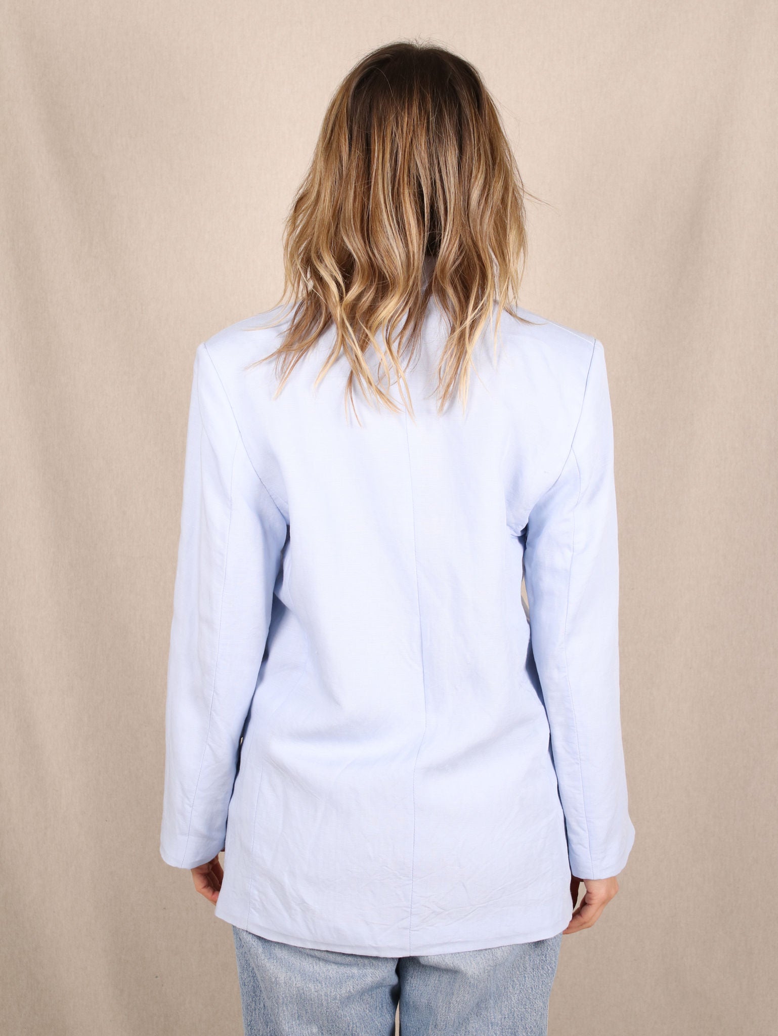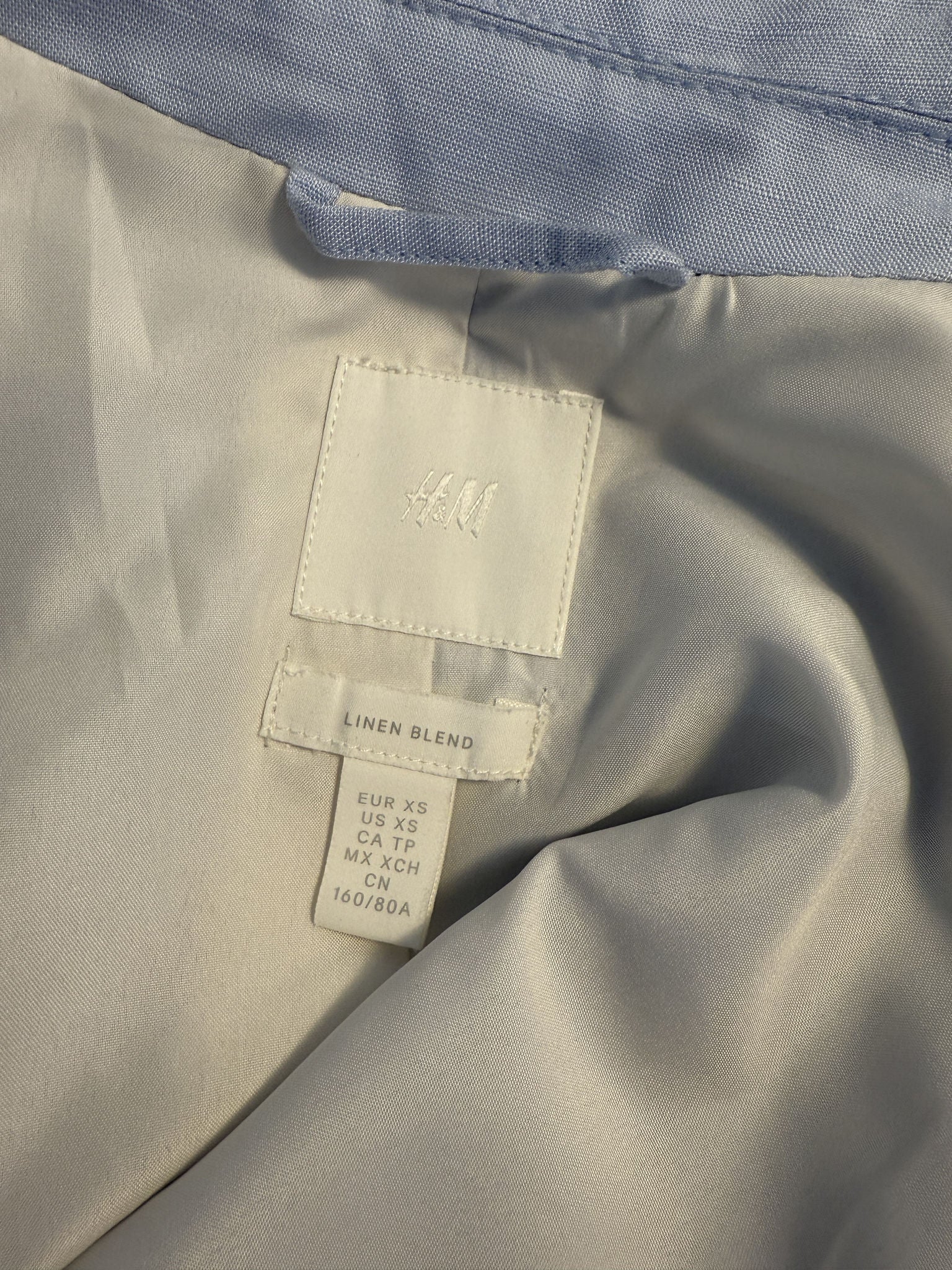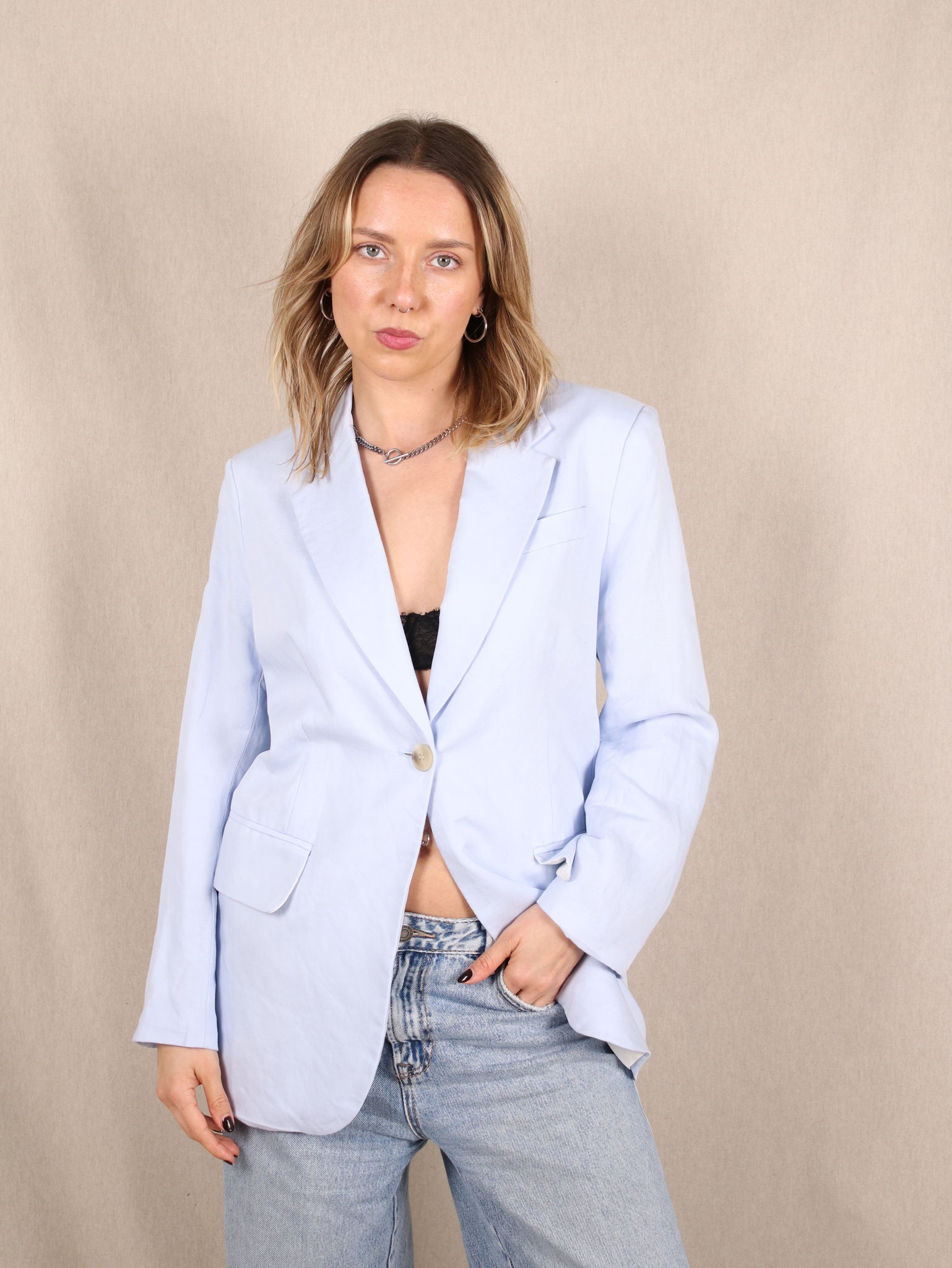 Dieser Secondhand H&M Blazer in Hellblau bringt frische Eleganz in deinen Look. Der leichte Webstoff aus Leinen, Viskose und Polyester sorgt für einen angenehmen Sitz. Lässig zur Jeans oder chic mit passenden Stoffhosen - ein echtes Style-Essential!