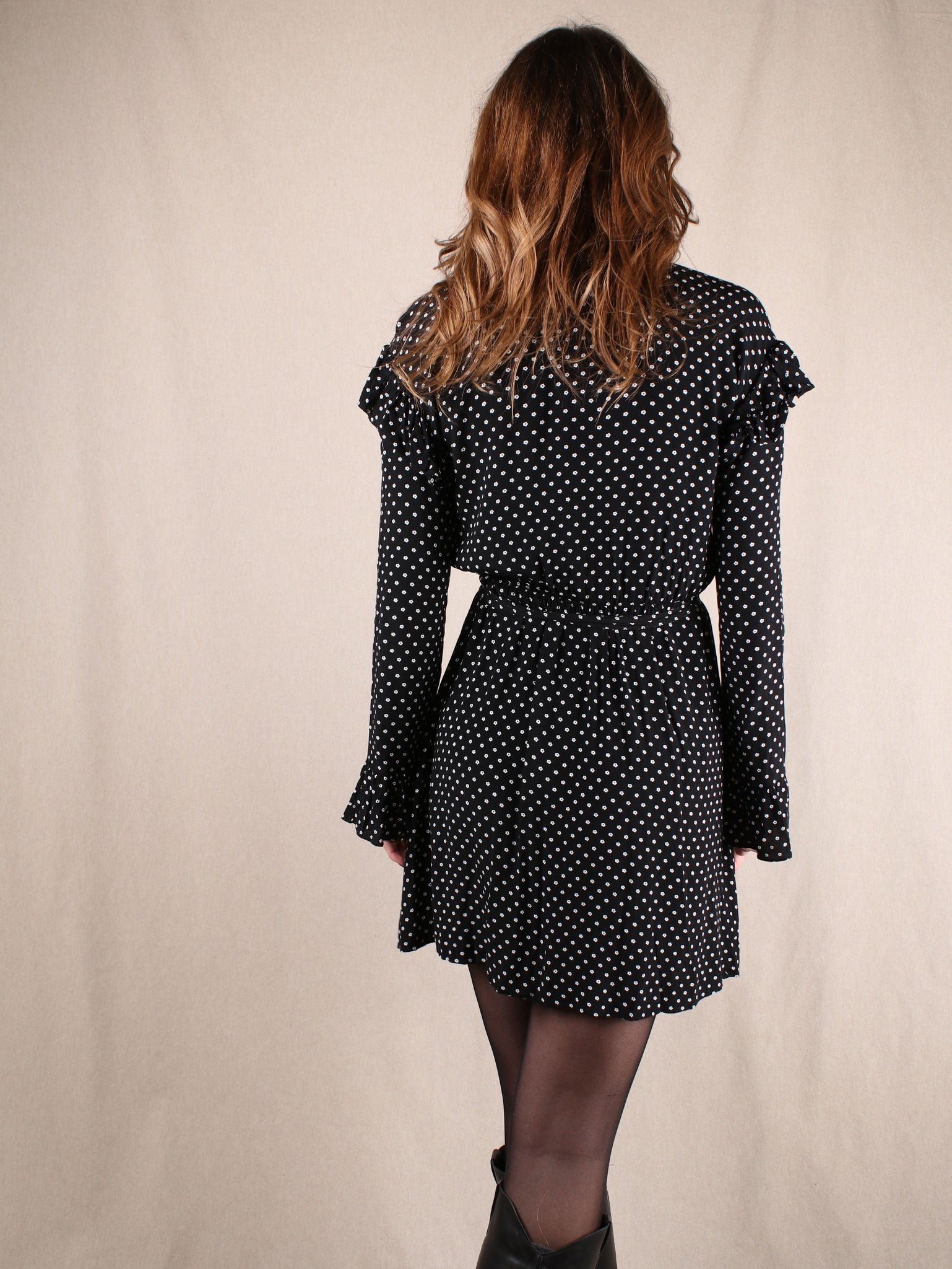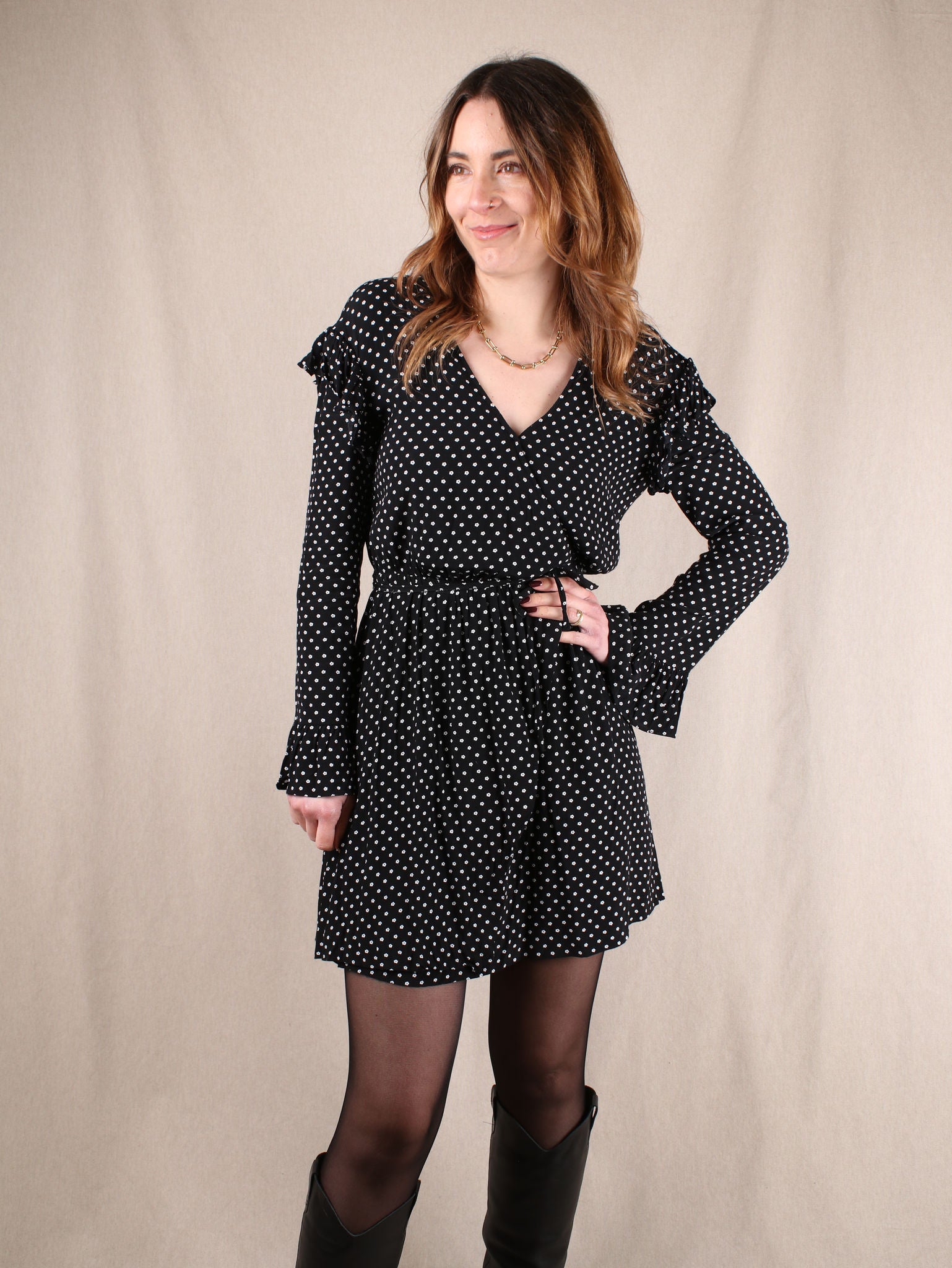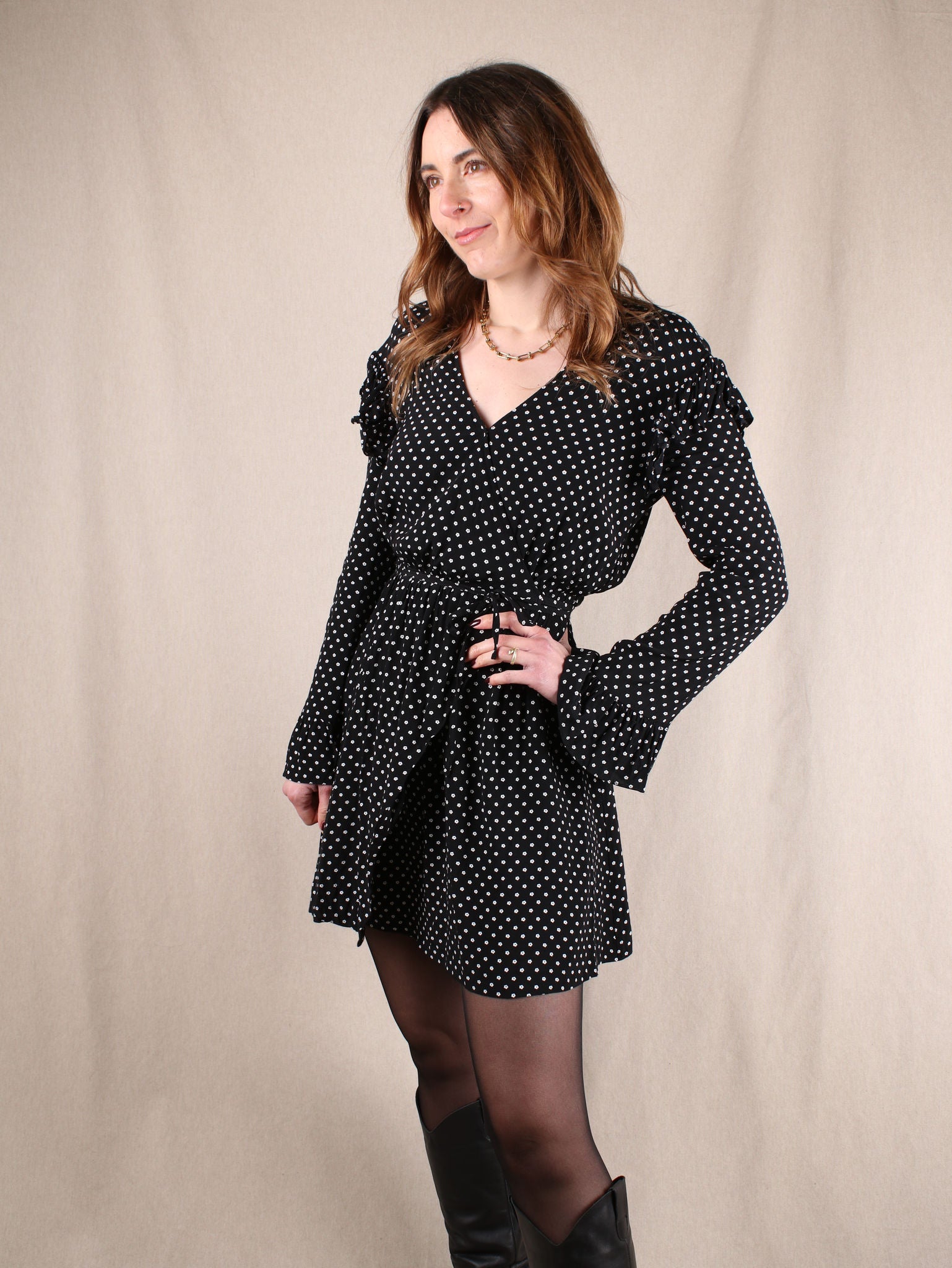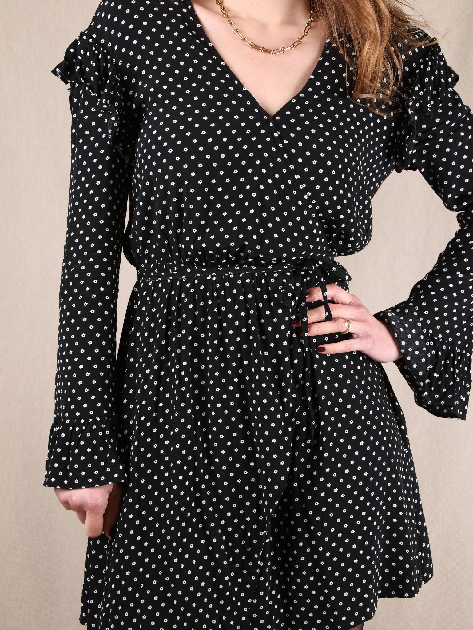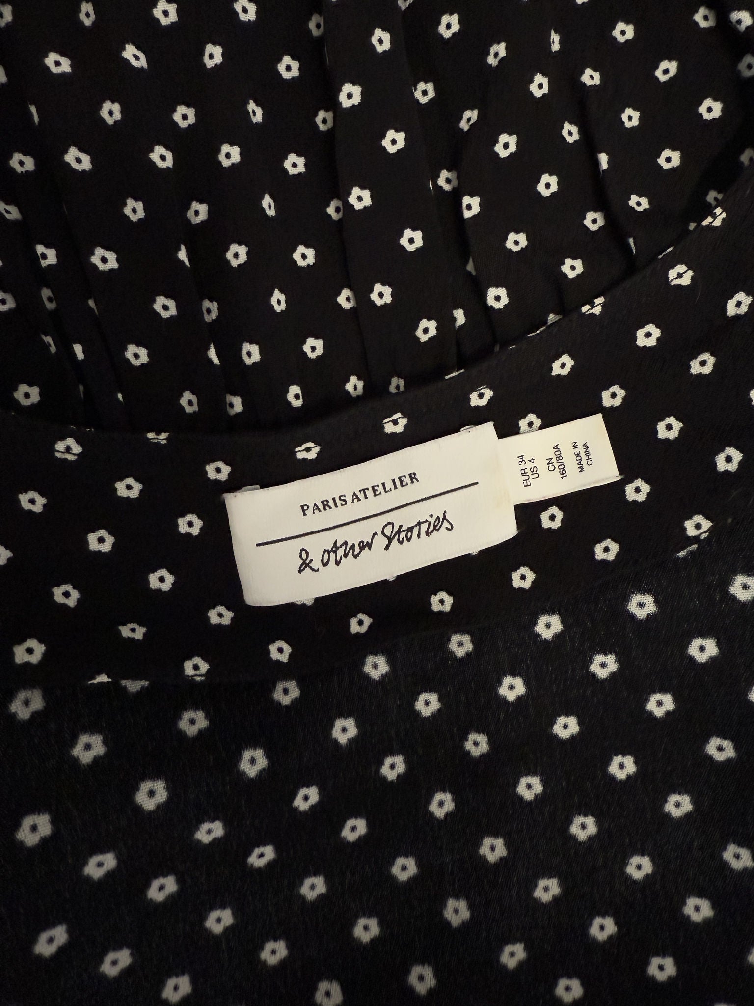 Romantisches Secondhand Wickel-Minikleid aus Crêpe von & Other Stories mit minimalistischem Blumen-Print und Rüschen am Ärmel.