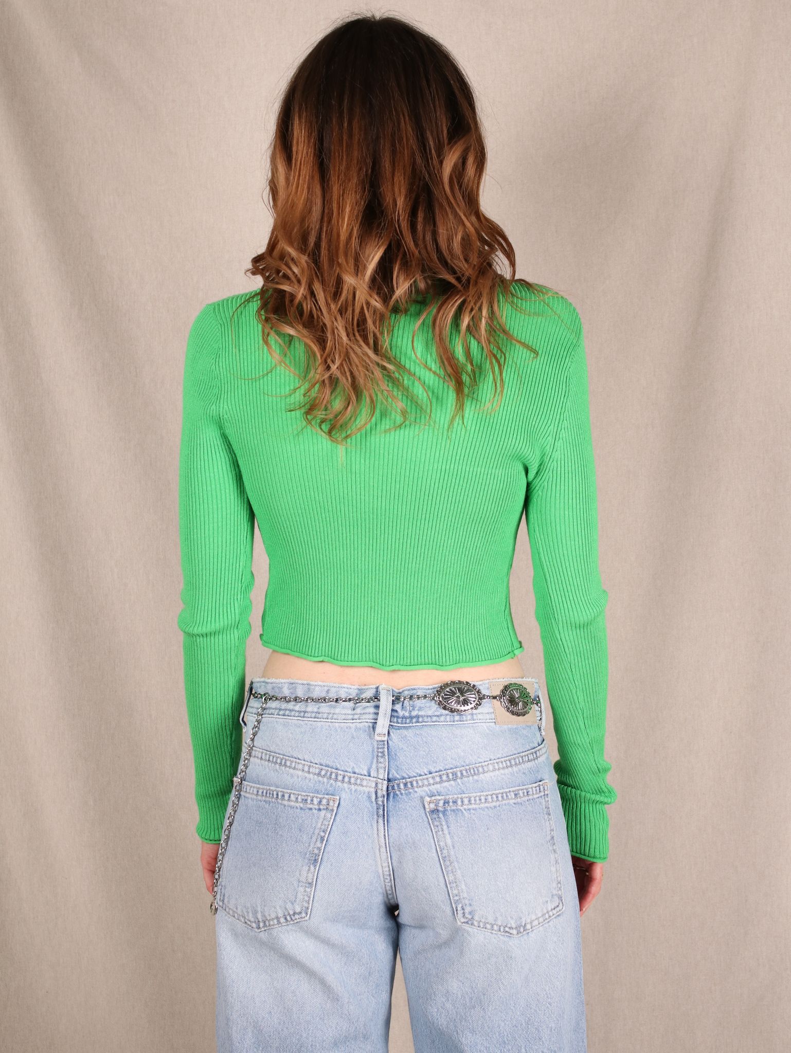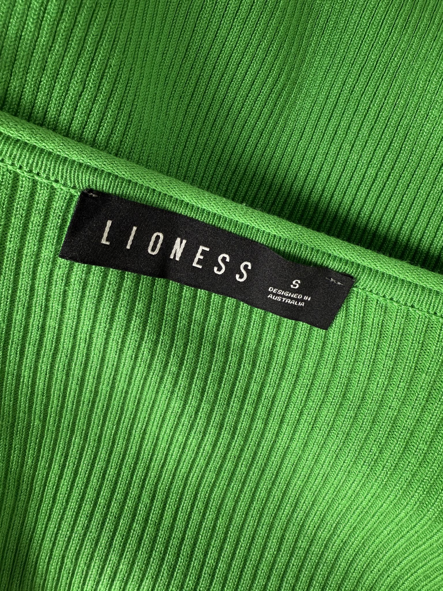 Dieser grüne Cardigan von Lioness bringt nicht nur Farbe in deinen Feed, sondern auch ordentlich Attitude. Der tiefe V-Ausschnitt mit nur einem Knopf macht ihn zur perfekten Kombi aus sweet und spicy. Rippstrick, eng anliegend und ready für dein nächstes Secondhand-Statement – ob überm Top oder solo getragen.