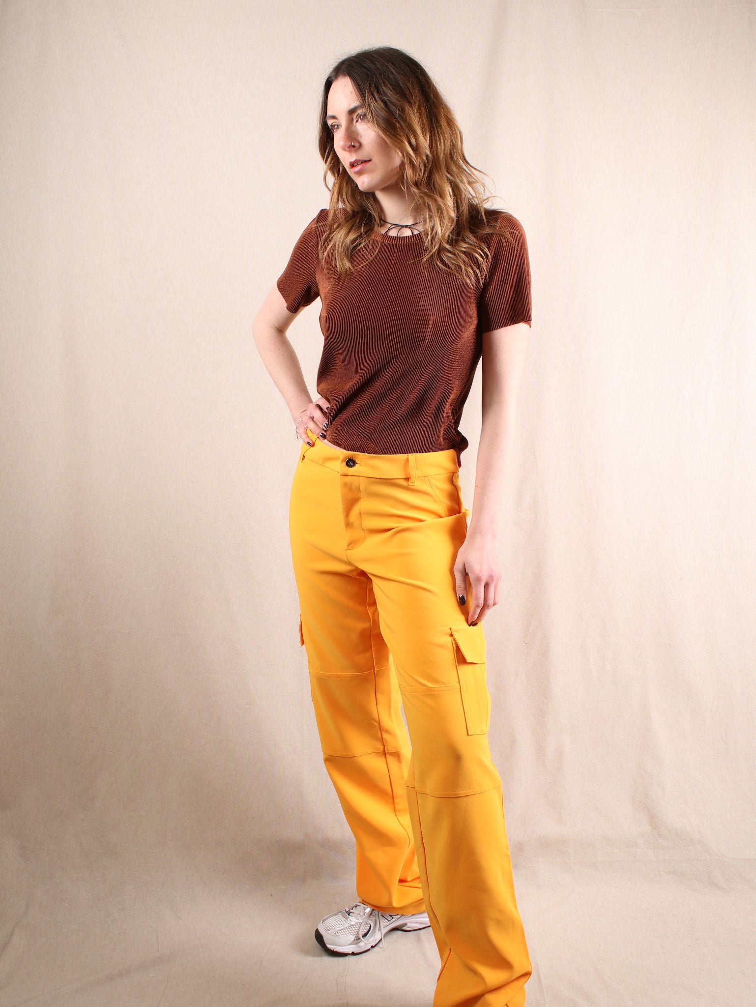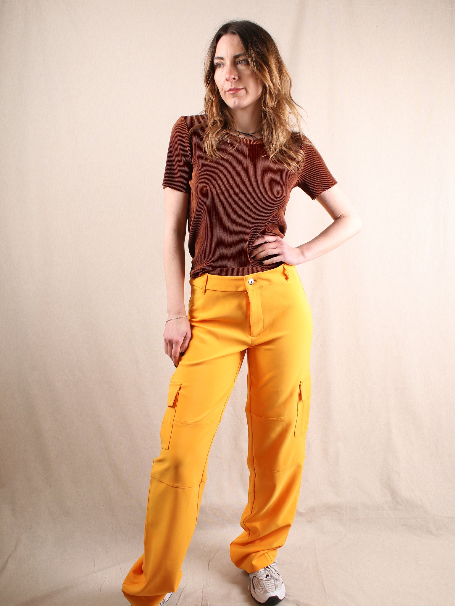 Diese Secondhand Cargohose von Tiger Mist ist ein echtes Power-Piece! Der strahlende Orangeton bringt sofort gute Vibes, während der lässige Cargo-Schnitt mit Taschen-Details für den perfekten Mix aus Funktionalität und Style sorgt. Die unkomplizierte Materialmischung macht sie angenehm zu tragen und vielseitig kombinierbar – von Chunky Sneakers für den Streetstyle-Look bis hin zu Heels für ein edgy Upgrade.