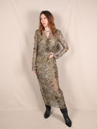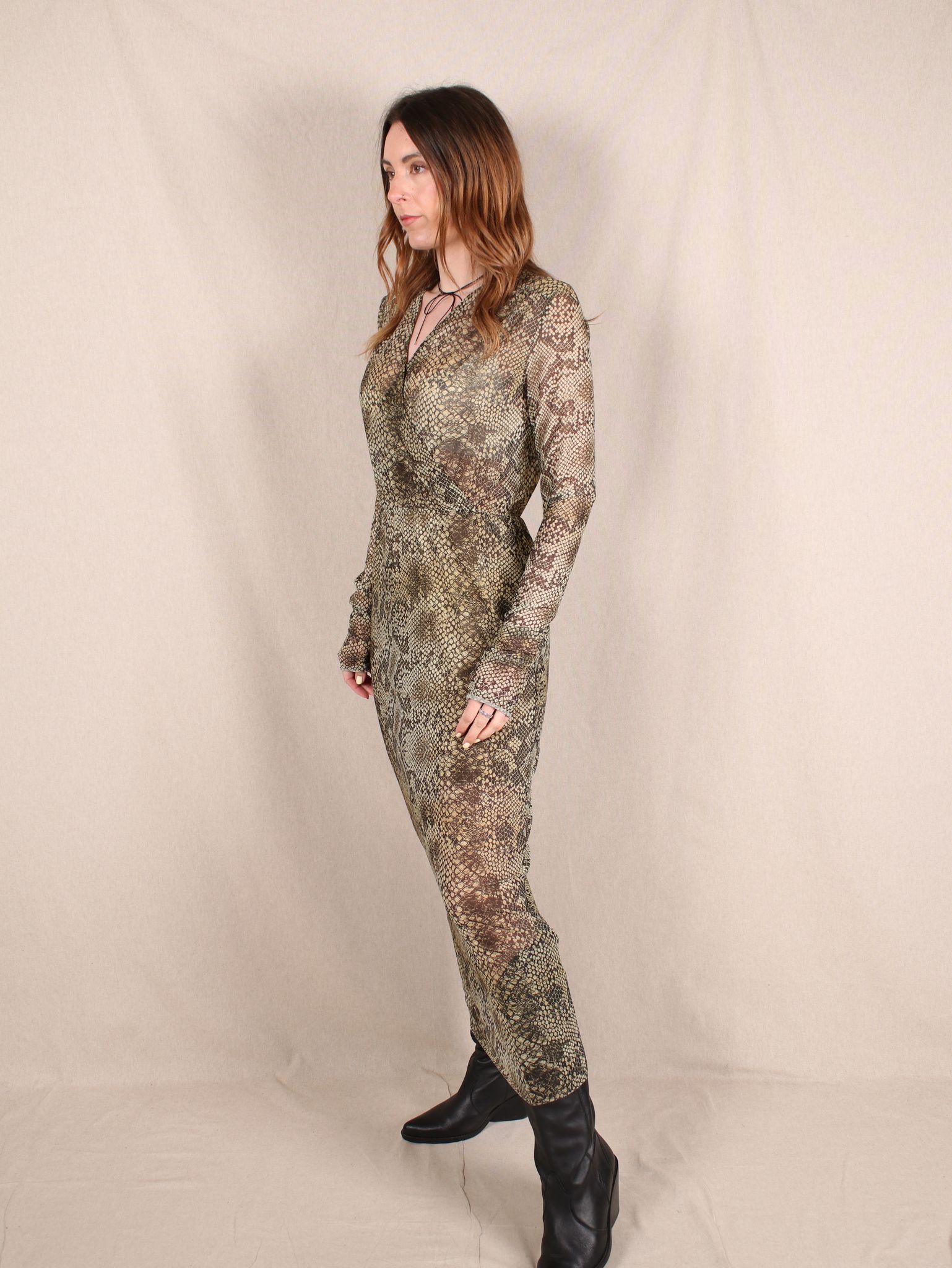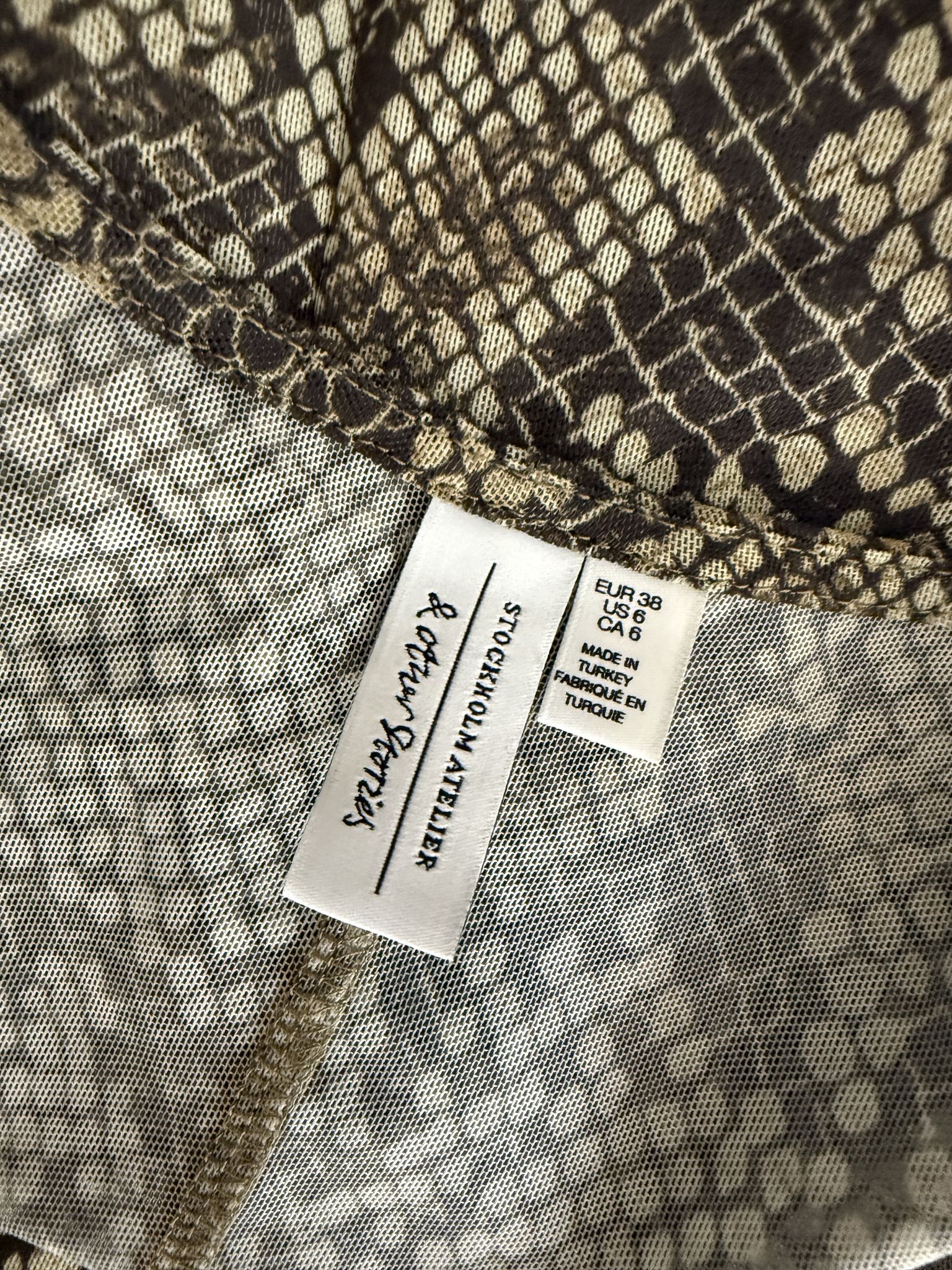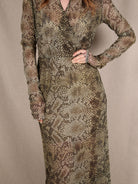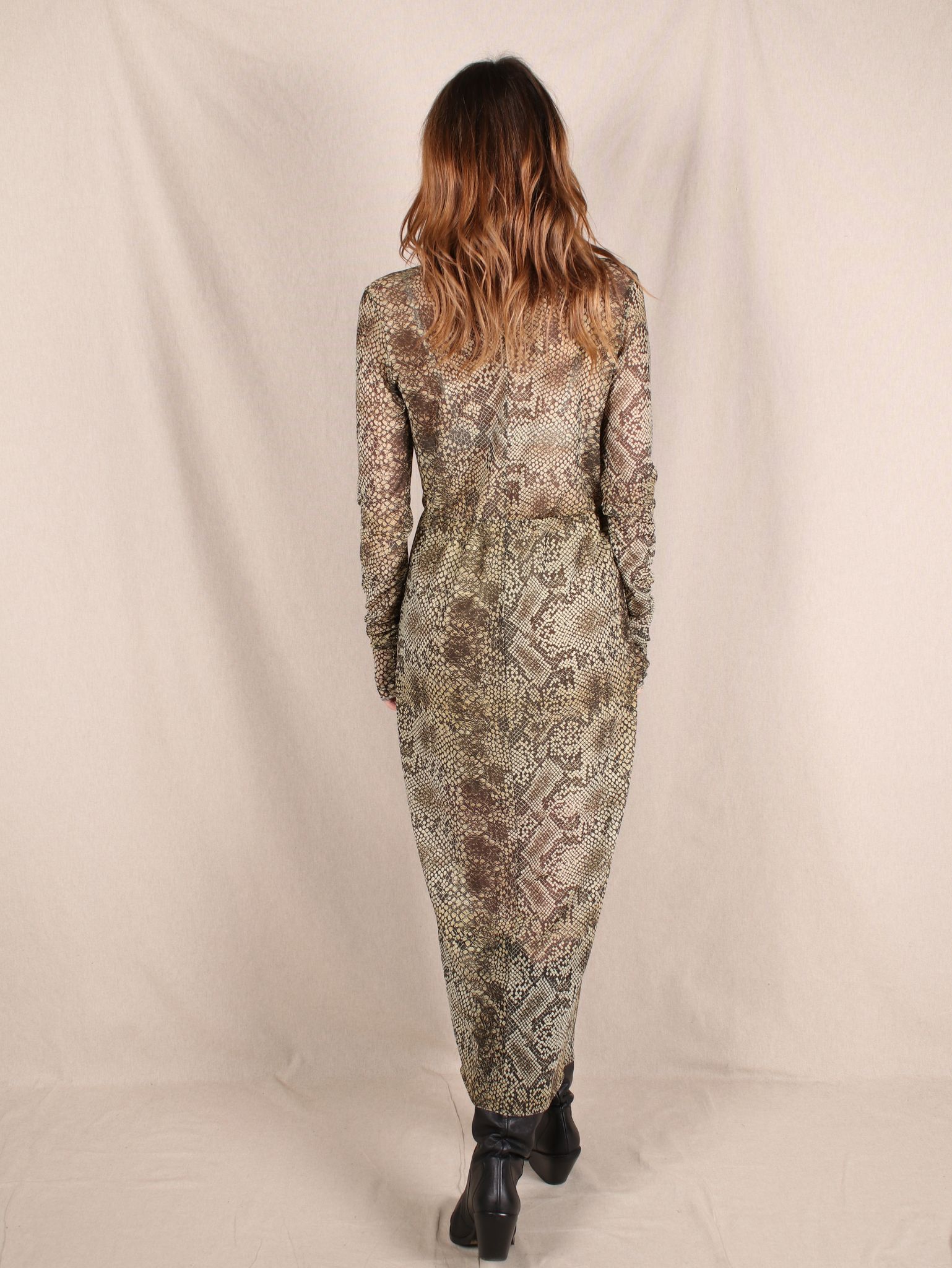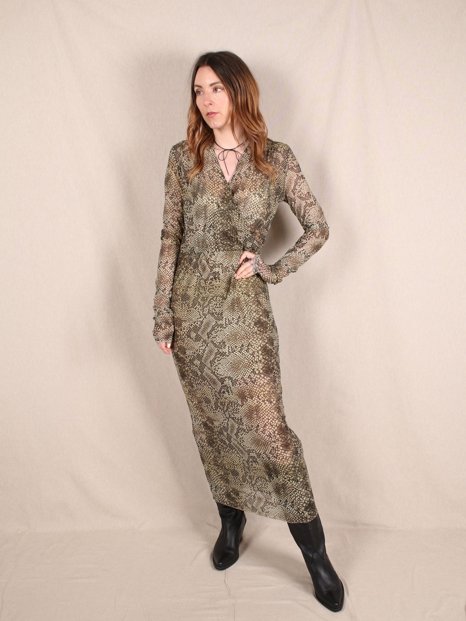 Dieses Mesh-Kleid von & Other Stories bringt den perfekten Mix aus Retro-Feeling und Wild-Vibes. Der olivgrüne Snake-Print trifft auf einen taillierten Wickel-Look mit langen Ärmeln - ready für Tage, an denen du einfach alles willst: Comfort, Coolness und ein bisschen Edge. Kombiniert mit Boots wird’s 70s Boho, mit Heels straight up confident.