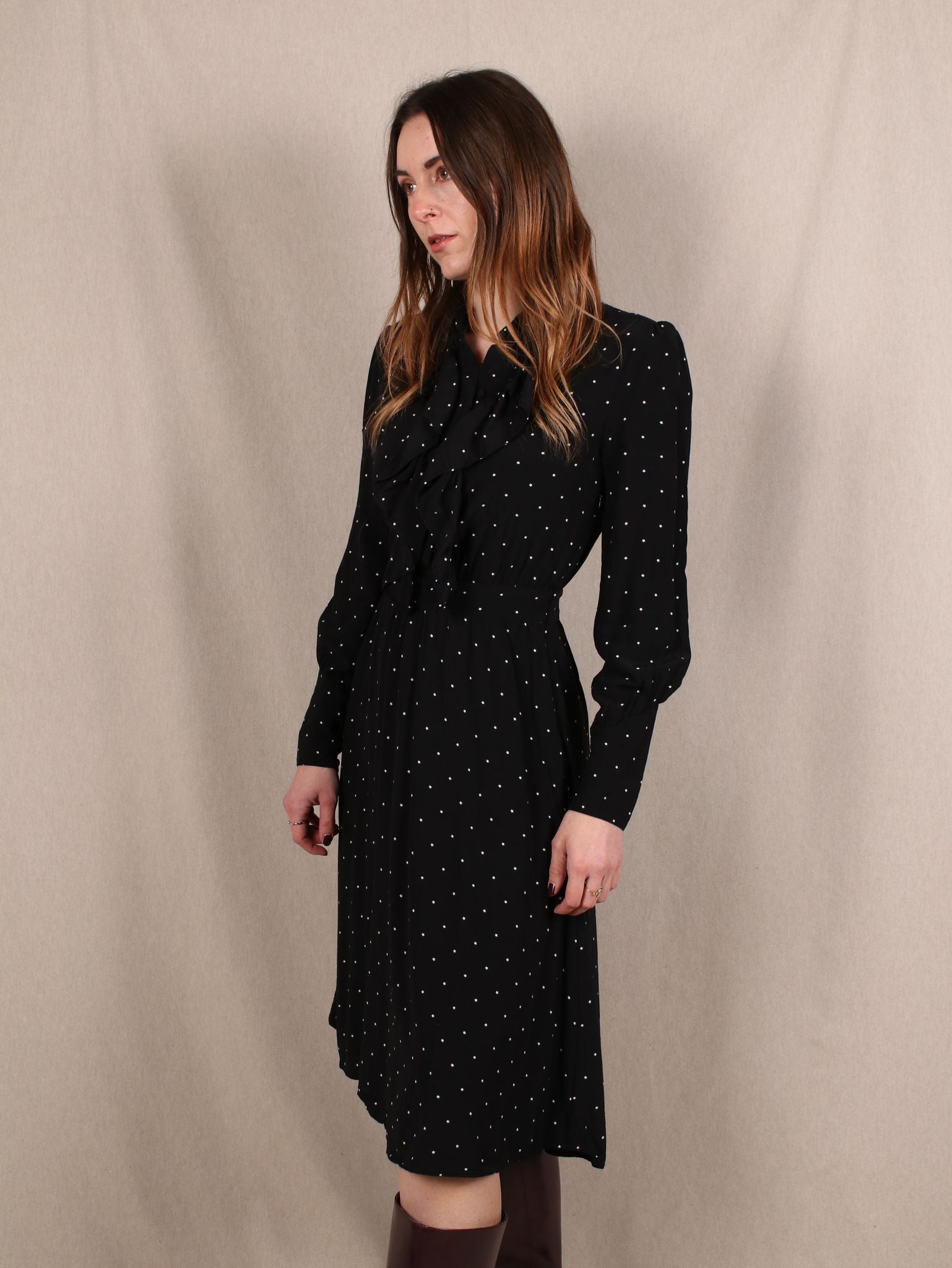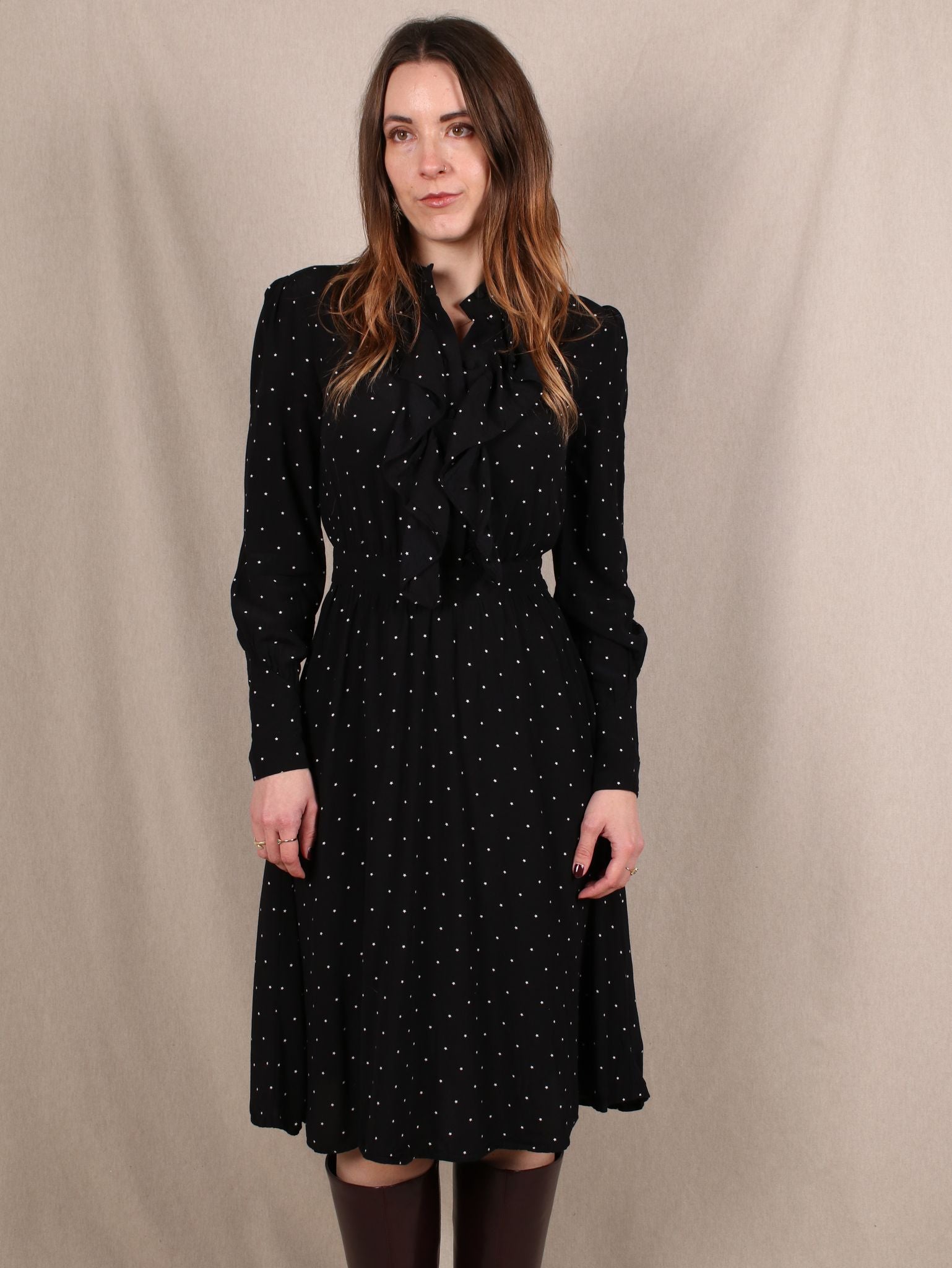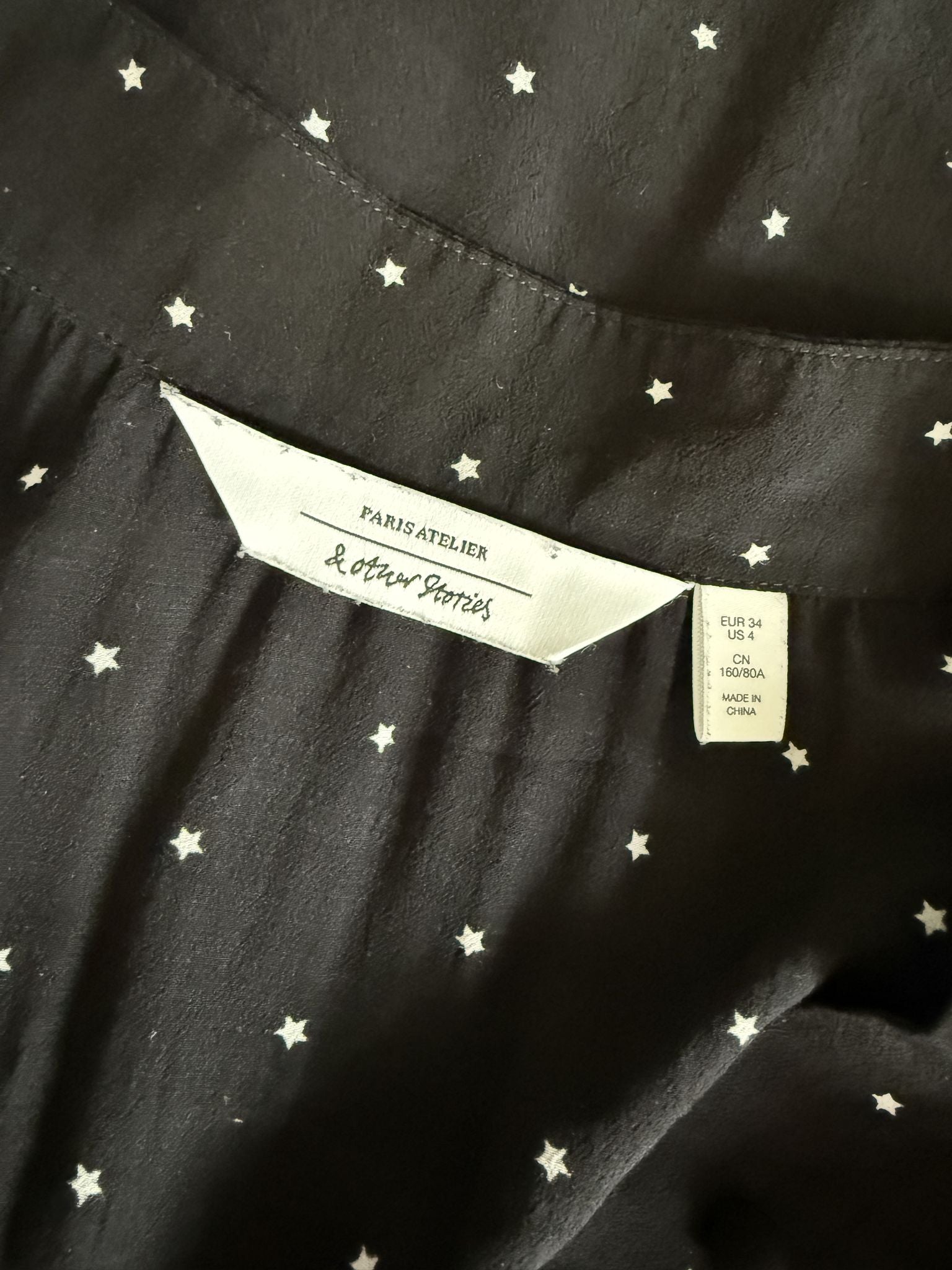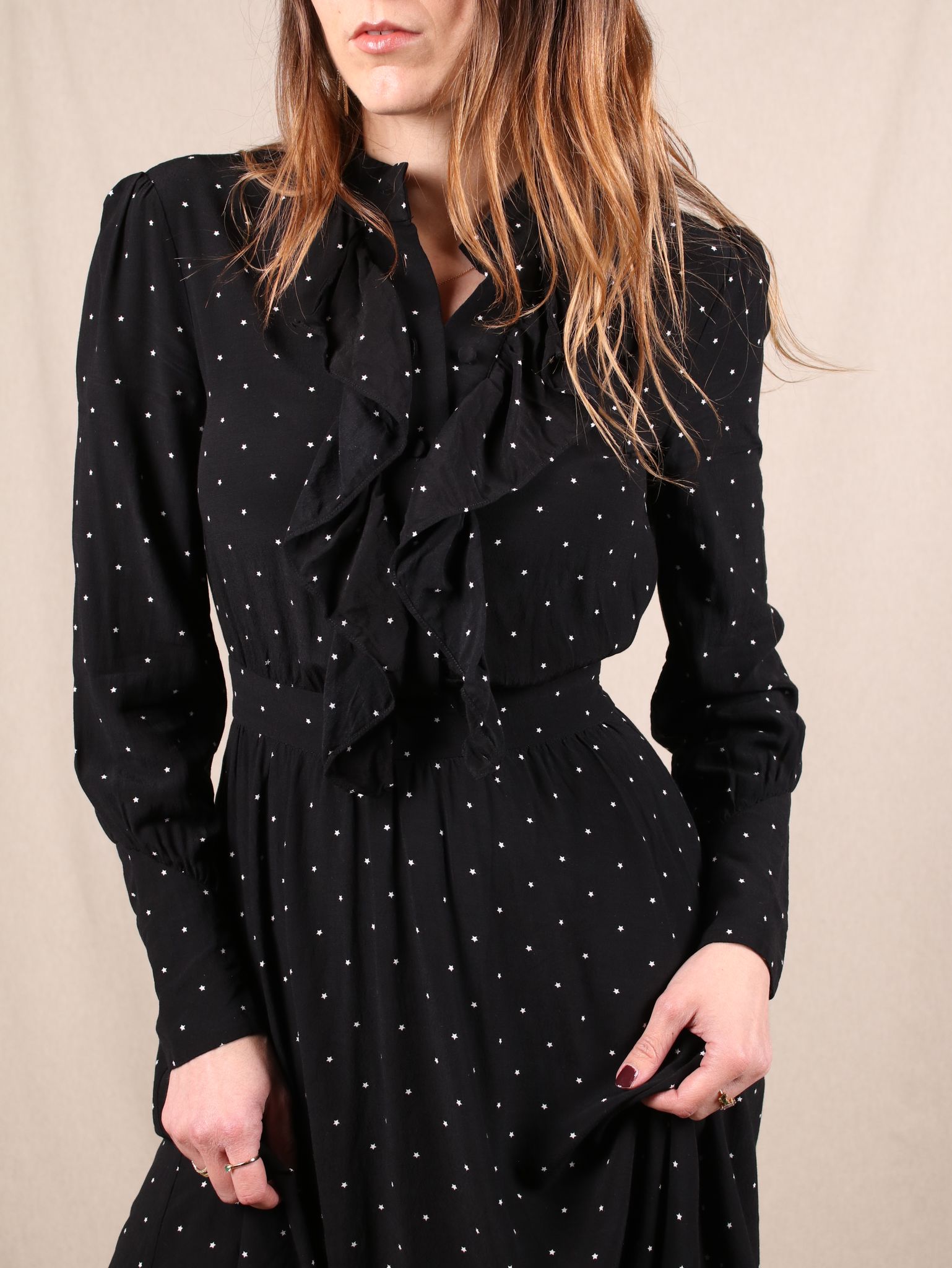 Dieses Secondhand Kleid von & Other Stories trifft genau den Sweet Spot zwischen Romance und Coolness. Der zarte Sternchen-Print, die Rüschen am Blusenausschnitt und die taillierte Crêpe-Silhouette machen es zum perfekten Begleiter für alle Xmas Dates oder Abende, an denen du ein bisschen mystery vibes versprühen willst. Ein Kleid, das flüstert statt schreit – und genau deshalb so auffällt.