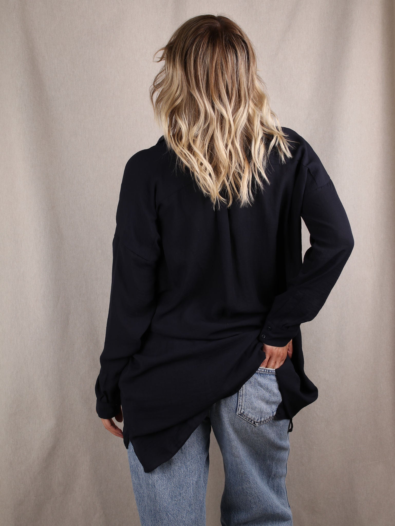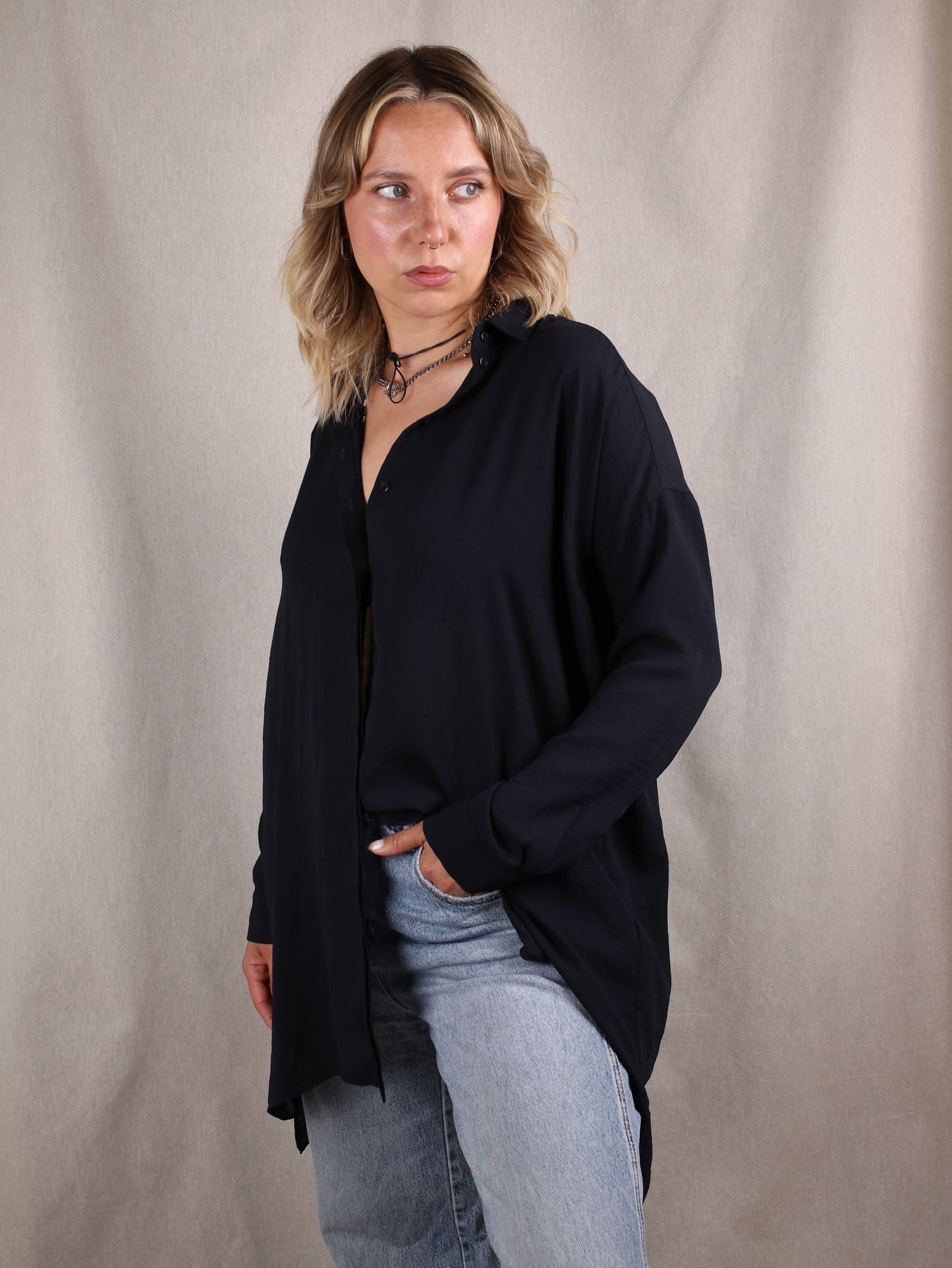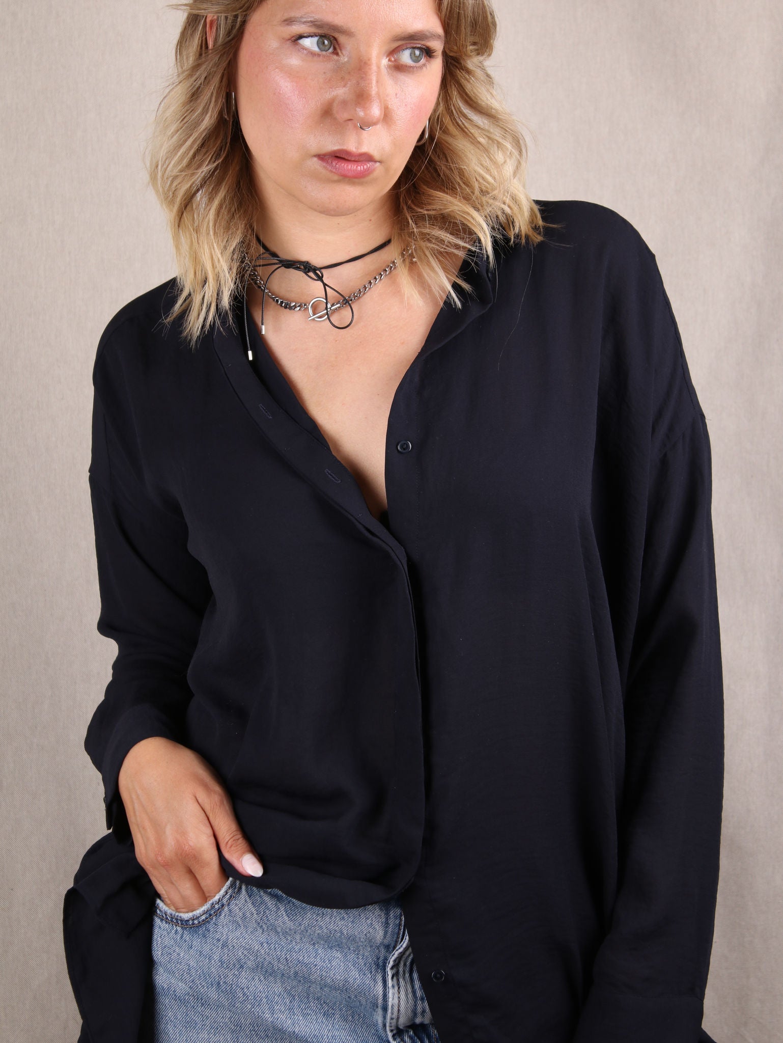 Diese Secondhand Oversize Bluse von COS wirkt wie der perfekte Szenewechsel nach Sonnenuntergang: dunkelblau, fließend und lässig offen gestylt. Der lange Schnitt und der weiche Fall geben dir genau diese nonchalante Coolness, die aussieht, als hättest du dir null Mühe gegeben – und genau deshalb funktioniert. Ein Teil für minimalistische Looks mit maximaler Haltung.