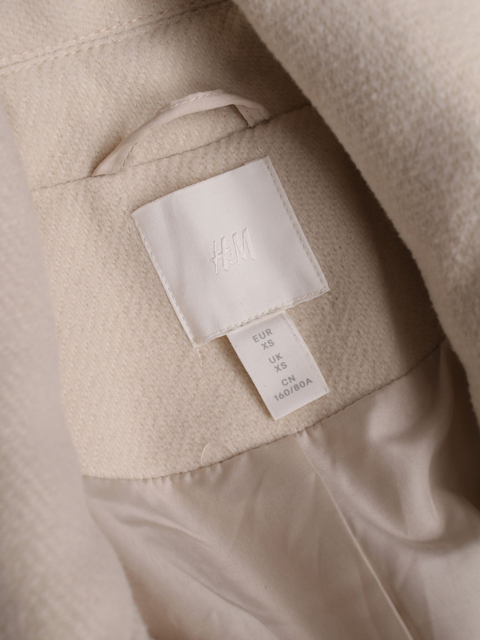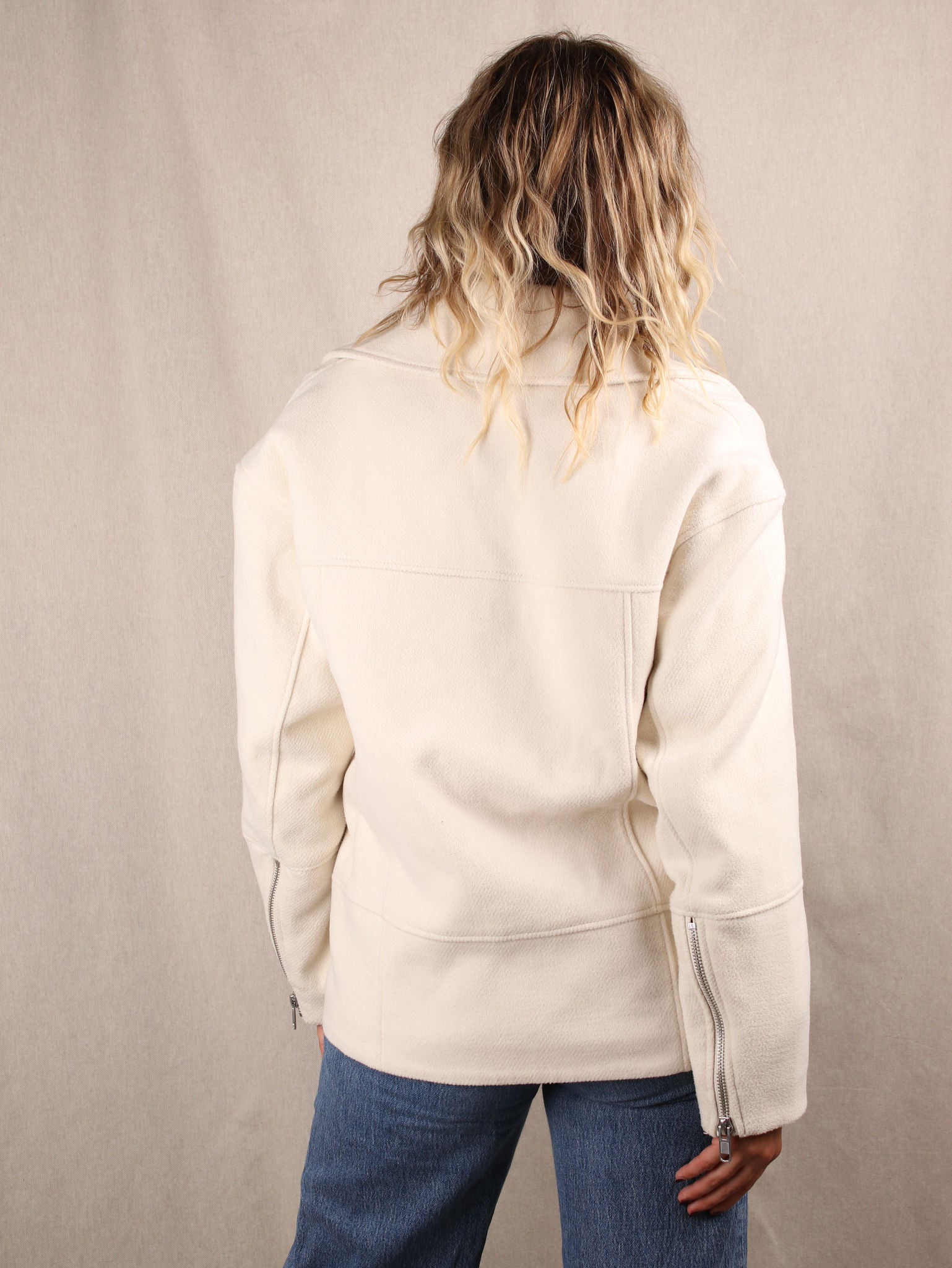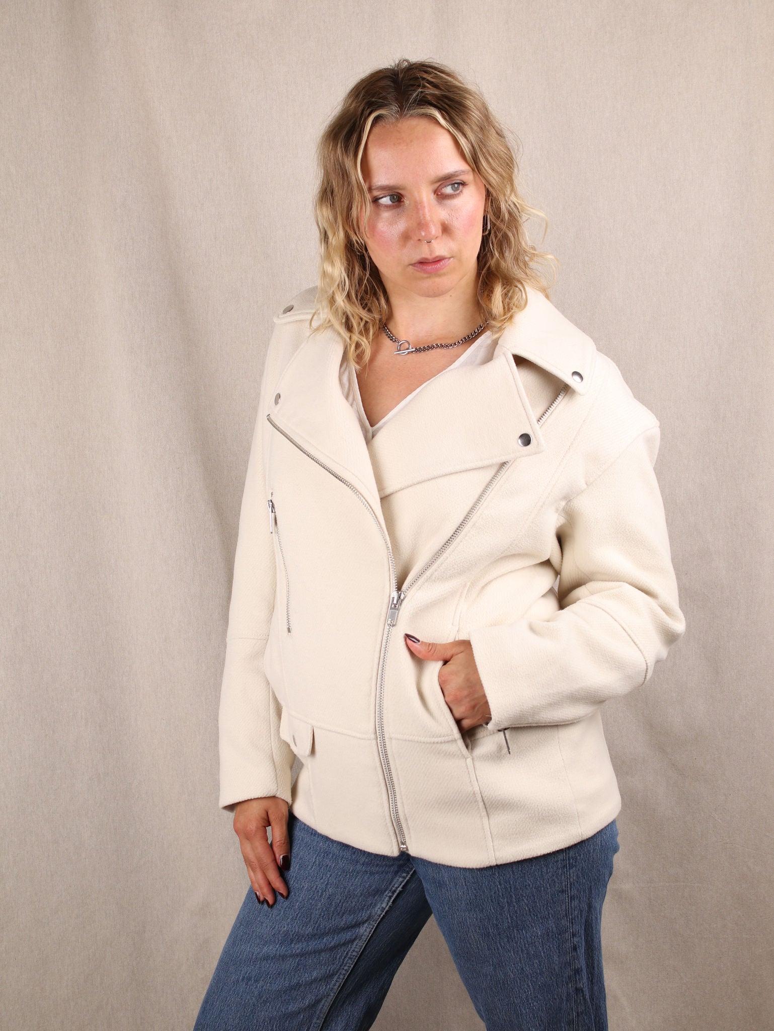 Diese Secondhand Biker Jacke von H&M bringt cleanen Cream-Style mit klarer Kante: der wollige Stoff wirkt hochwertig, während die Oversize-Passform auf dem Bild lässig und selbstbewusst fällt. Silberne Zipper und breite Revers geben dir genau die richtige Portion Attitude, ohne laut zu sein. Perfekt für Looks, die sagen: cool, aber mit Stilbewusstsein.