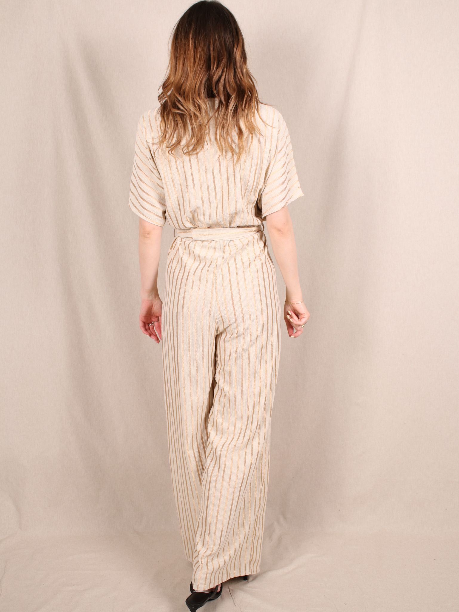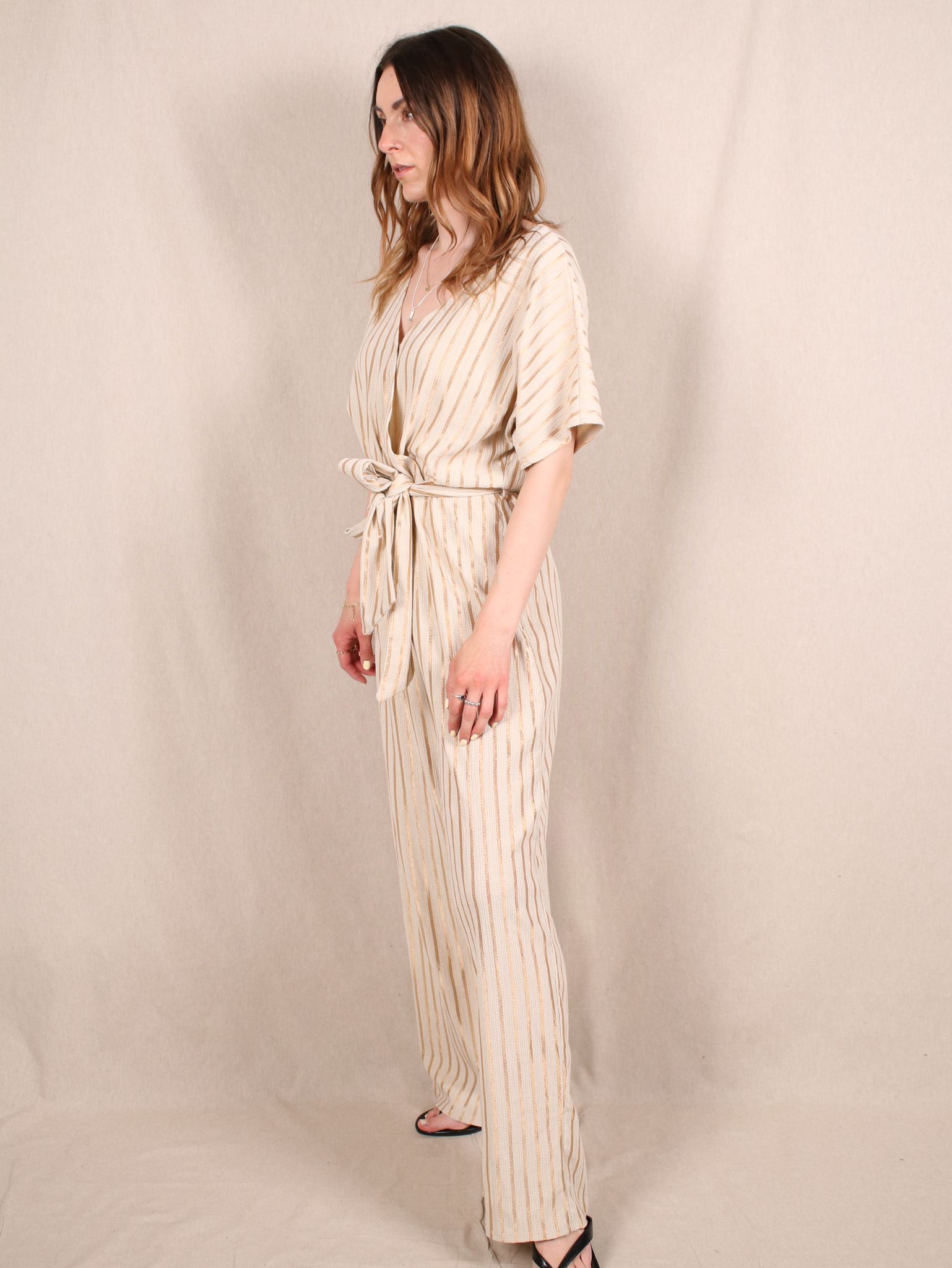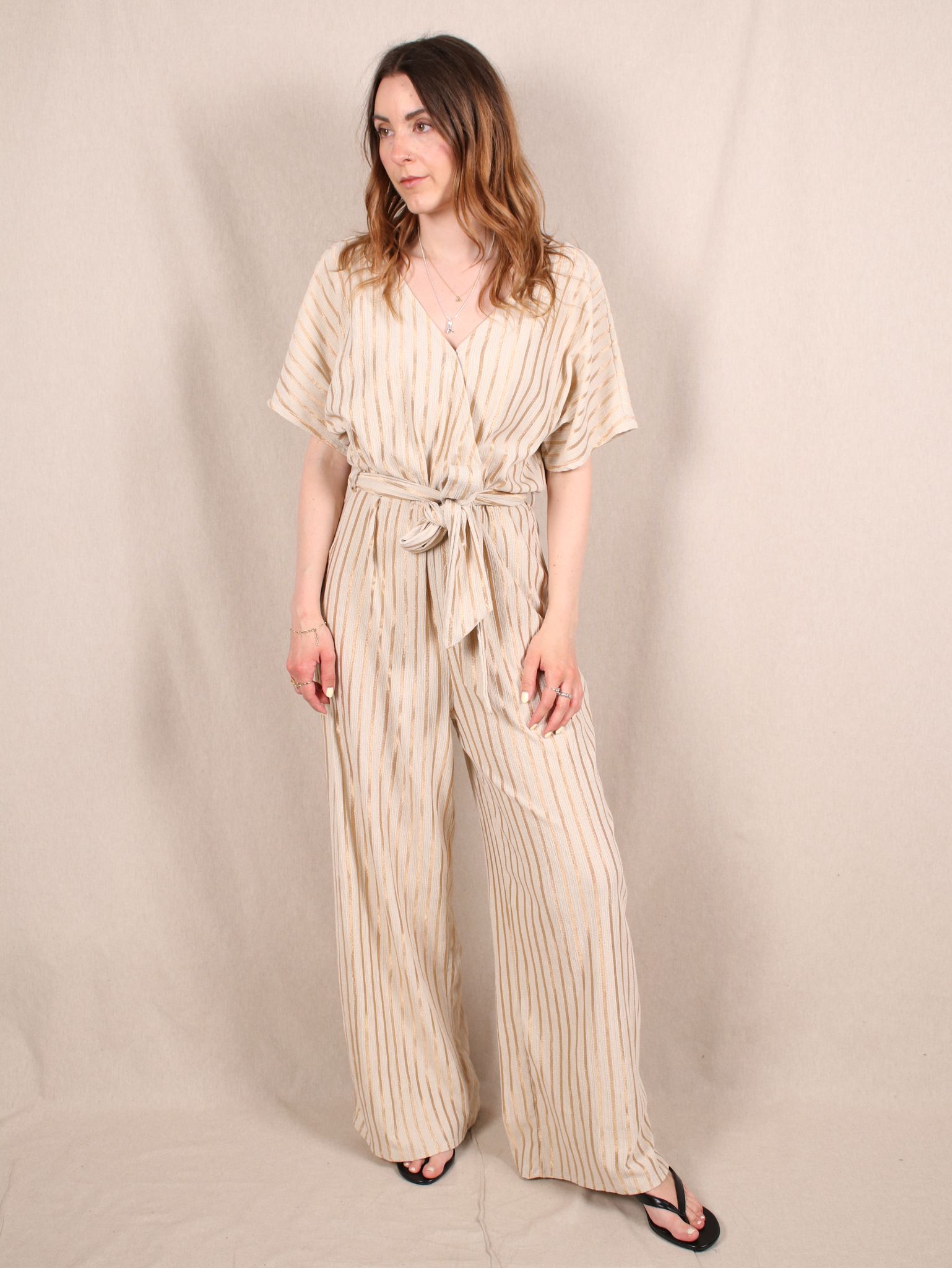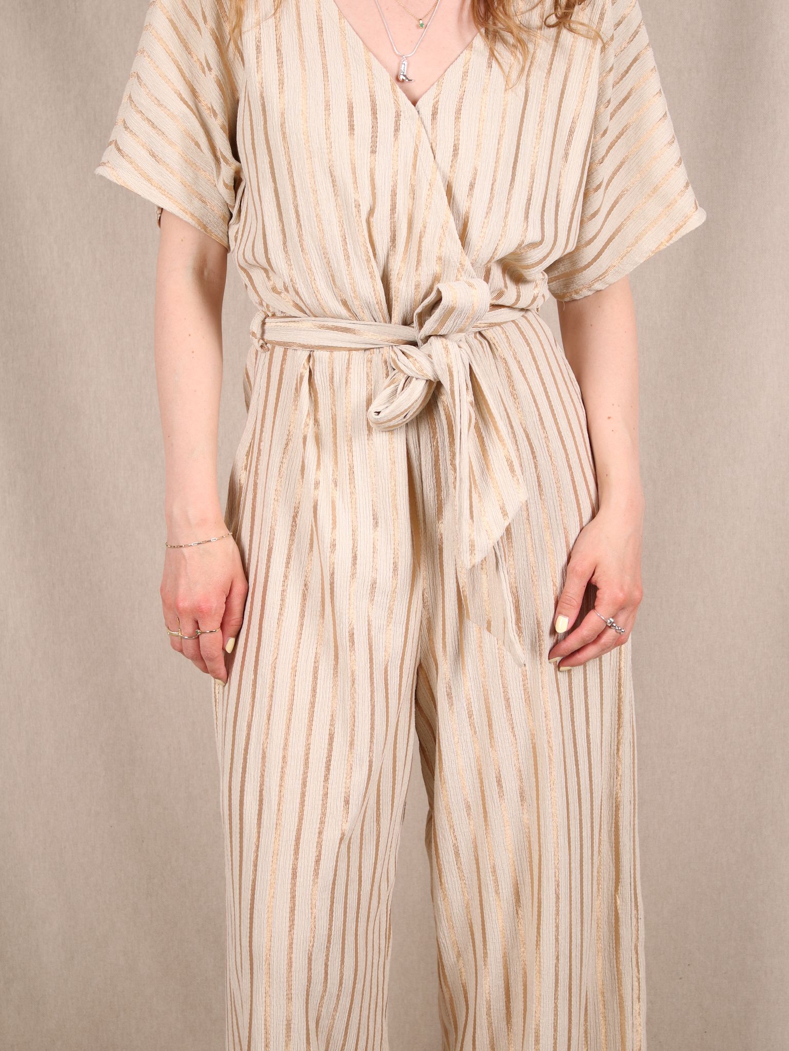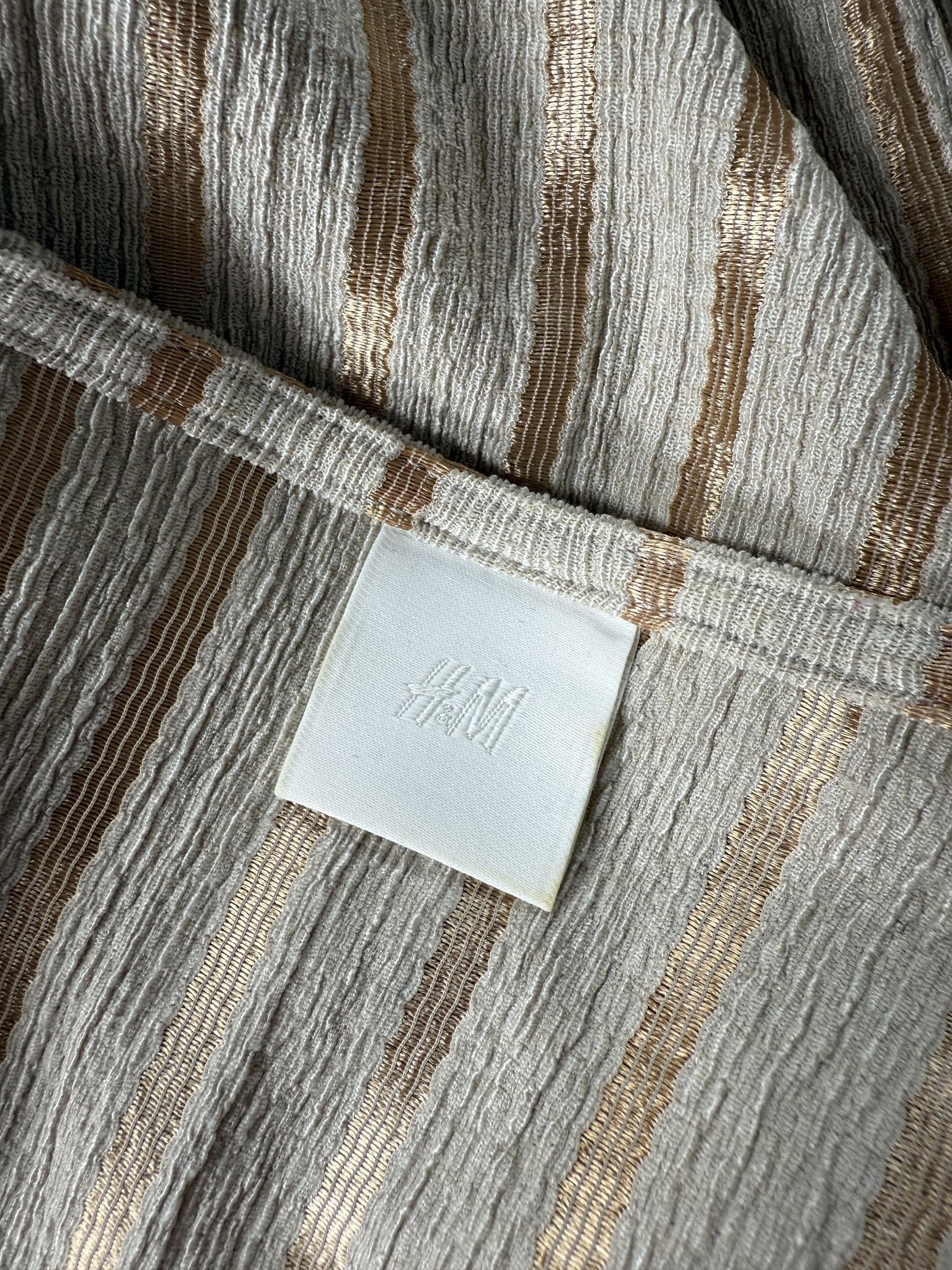 Mit diesem bronzefarbenen Wickel-Jumpsuit von H&M bist du ready für jeden Boho-Moment – vom Sundowner bis zur Sommerparty. Die fließenden Crêpe-Streifen, der taillierte Fit und der Bindegürtel zaubern eine elegante Silhouette mit Laissez-faire-Charme. Kombiniere ihn mit Flip Flops für lässigen Chic oder mit Heels und Clutch für den großen Auftritt.