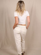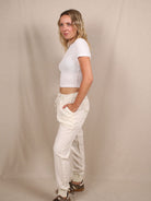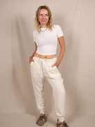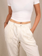Mit Bundfalten und Jogger-Details bringt sie Utility-Vibes in cleanem Weiß. Ob mit Sneakern oder Slides – always easy, always chic.