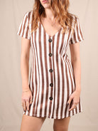 Dieses Secondhand Kleid von Zara bringt instant 70s-Feeling: braun-weiße Streifen, ausgestellte Passform und kurze Ärmel machen es zum perfekten Everyday-Statement. Easy, lässig und trotzdem super stylisch – dein Go-to für einen modernen Mocha-Mousse-Look.