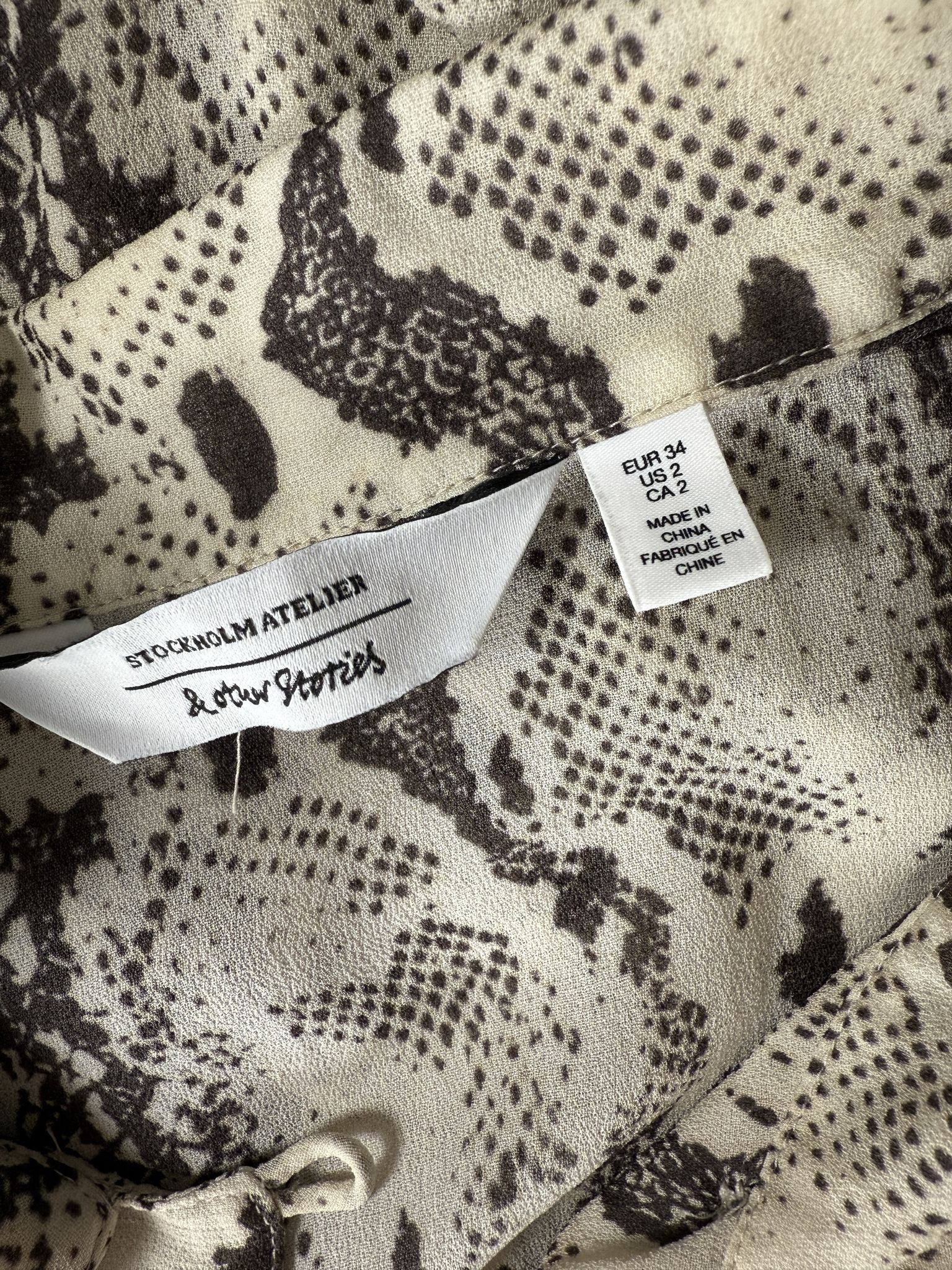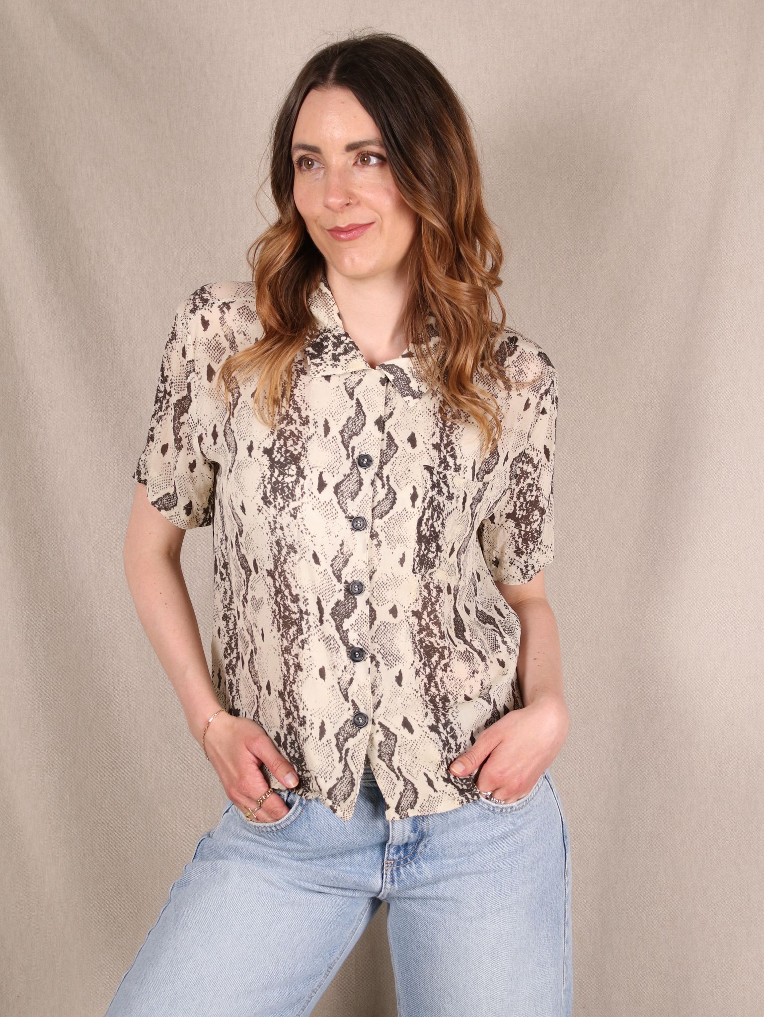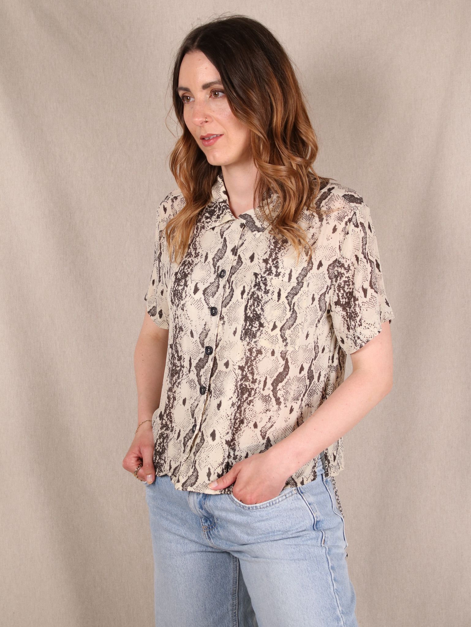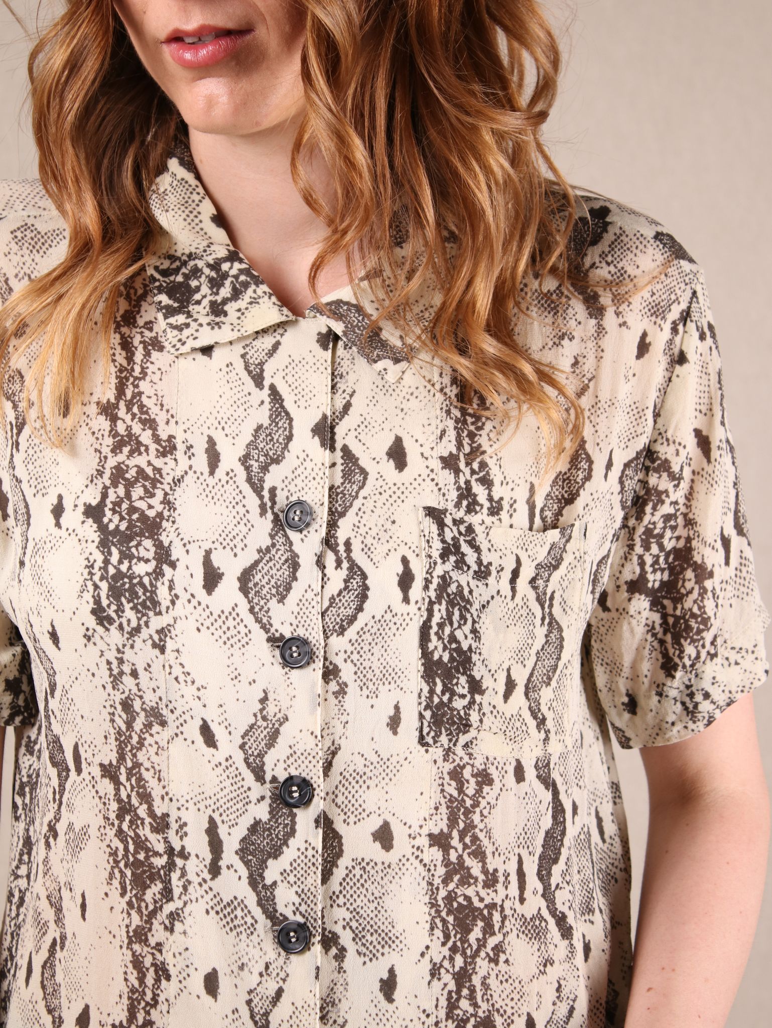 Diese Secondhand Bluse von & Other Stories ist wild, cool und ready für deinen 70s-Moment: leichter Crêpe-Stoff, lockerer Fit und ein lässiger Snake-Print. Für alle, die Basic lieber mit Biss mögen.