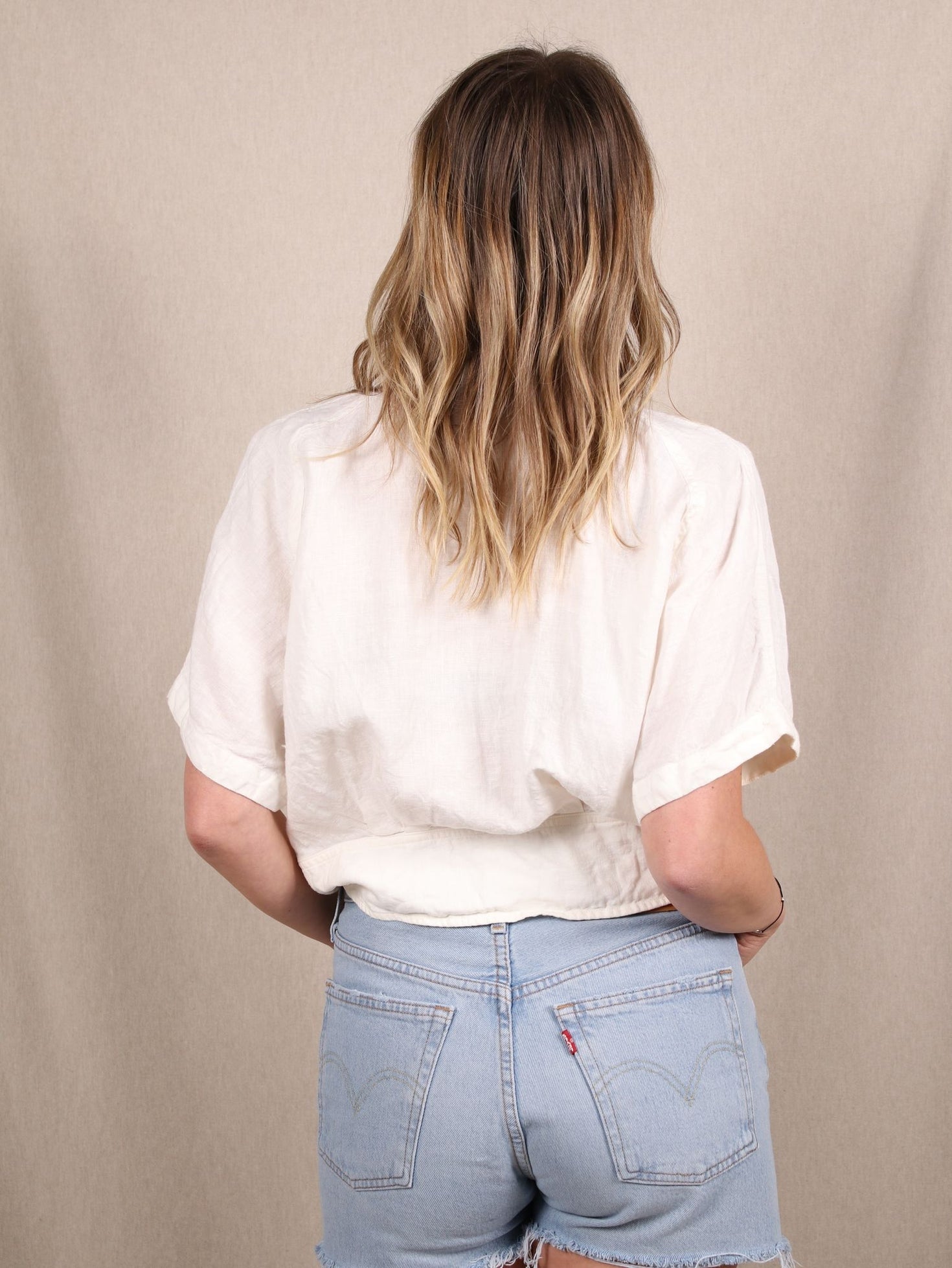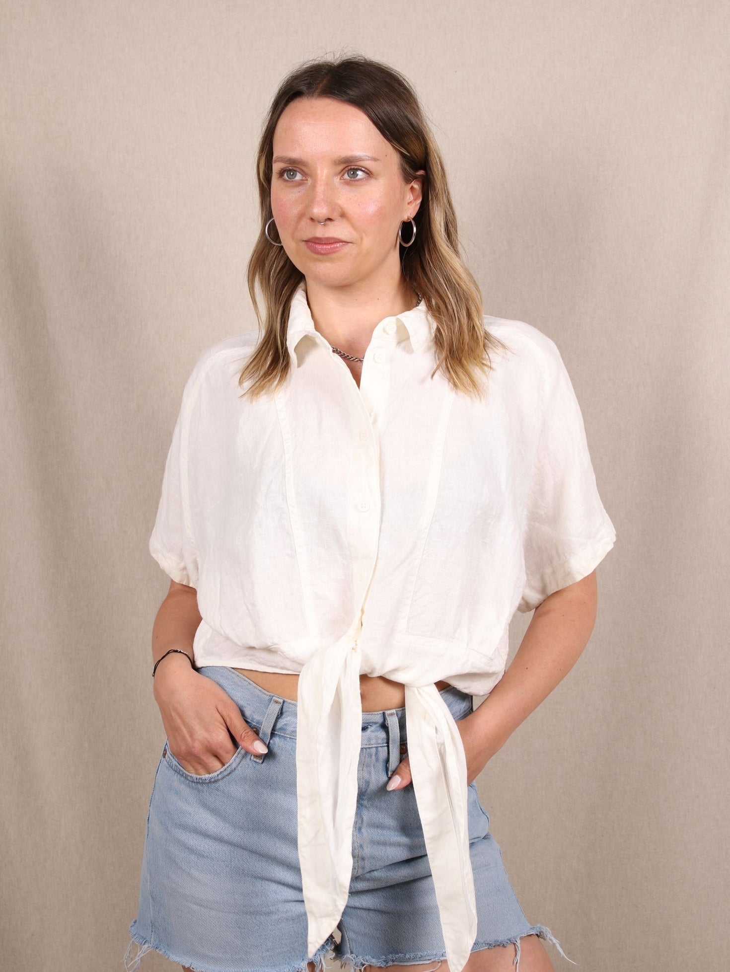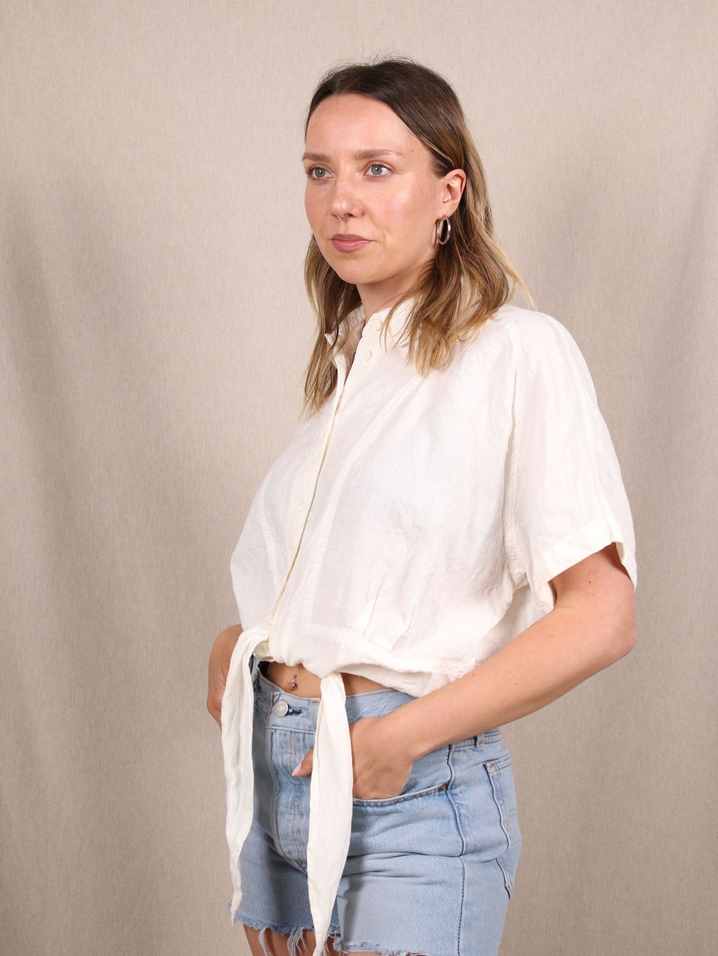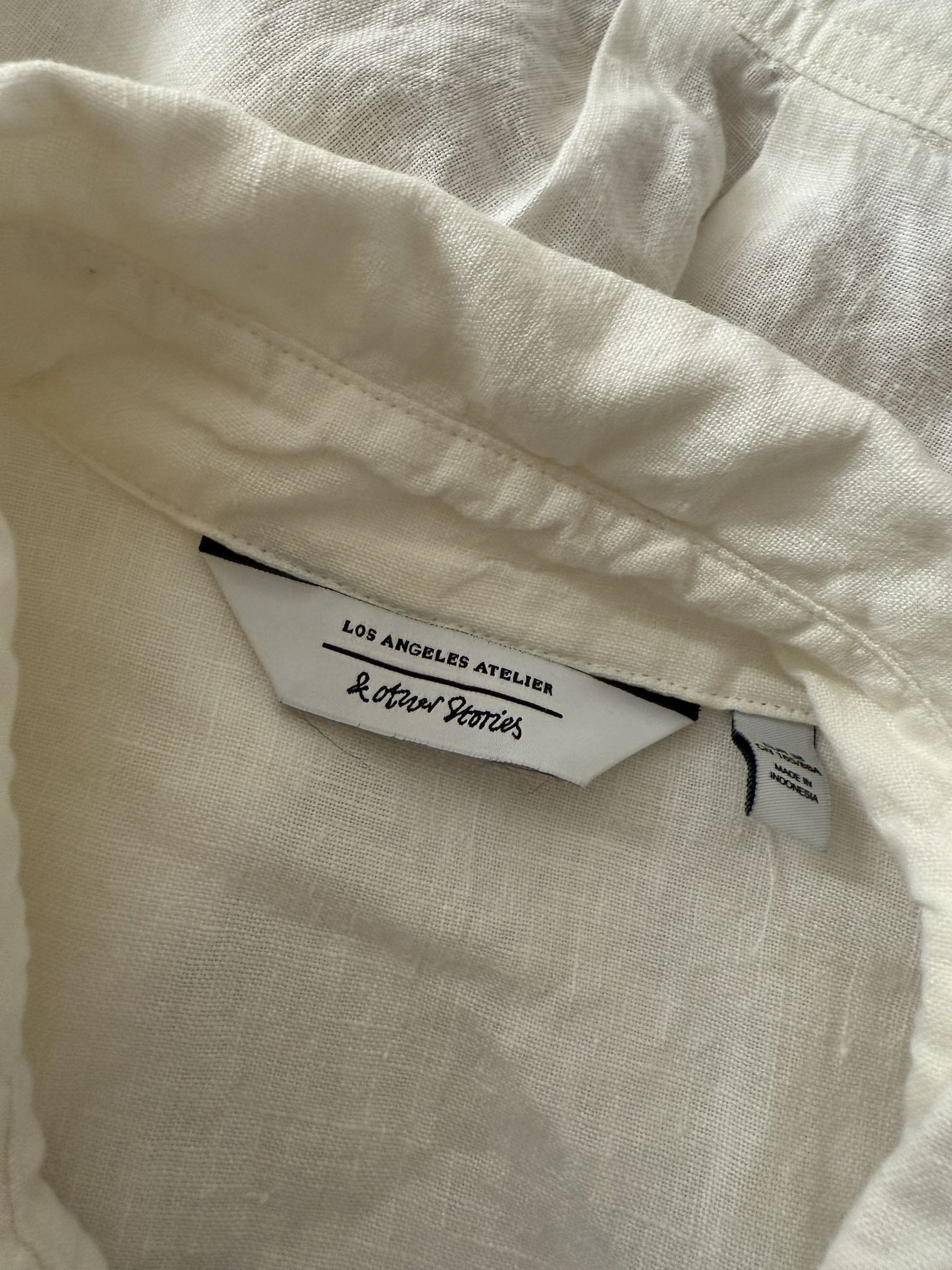 Diese luftige Leinenbluse von & Other Stories ist der Inbegriff von effortless summer style. Ob geknotet wie hier oder offen überm Bikini – sie passt einfach immer. Der cropped Schnitt verleiht dem Klassiker ein frisches Update und macht ihn perfekt für heiße Tage. Und das Beste? Sie ist secondhand – also gut für deinen Look und noch besser für den Planeten.