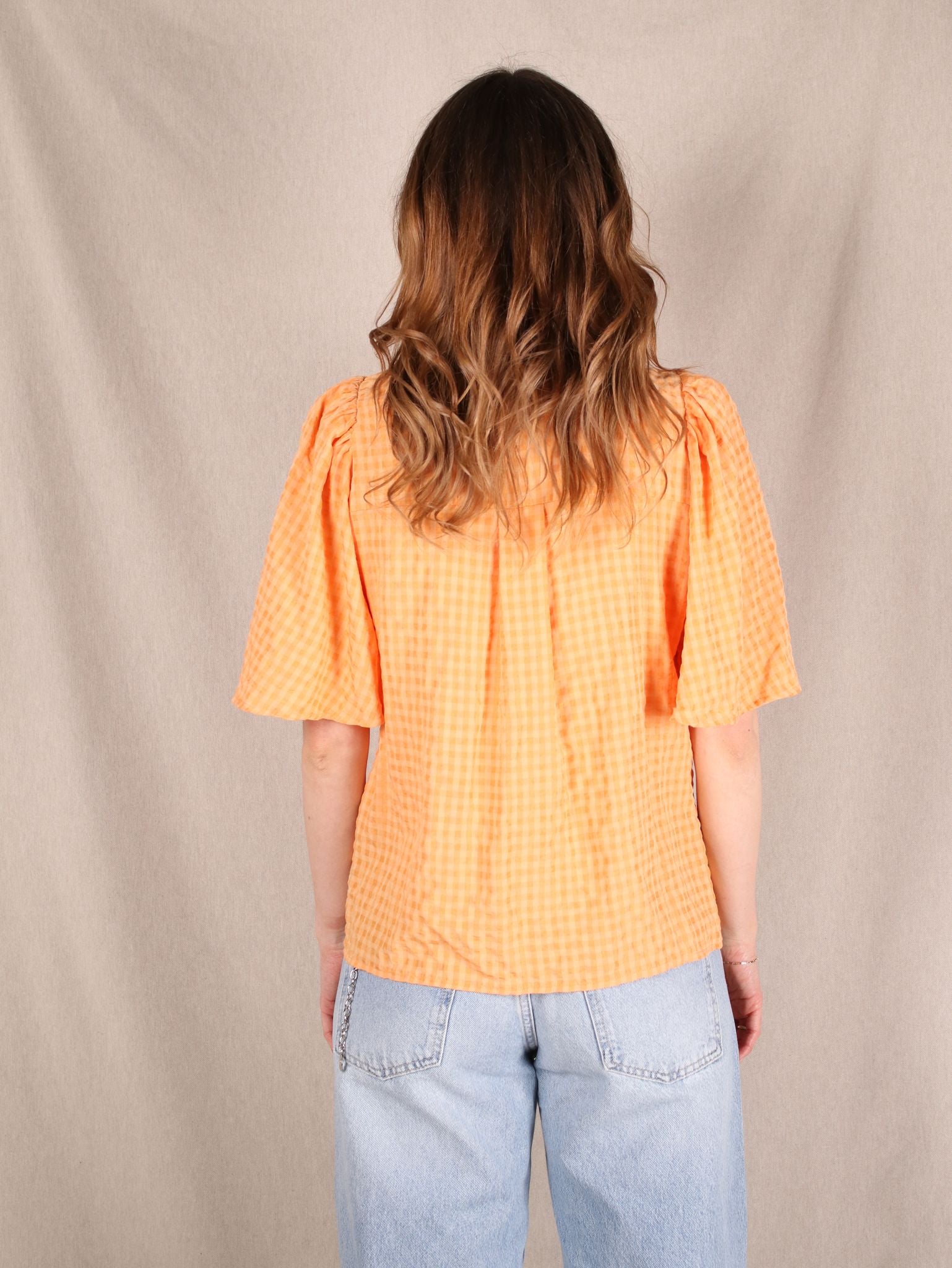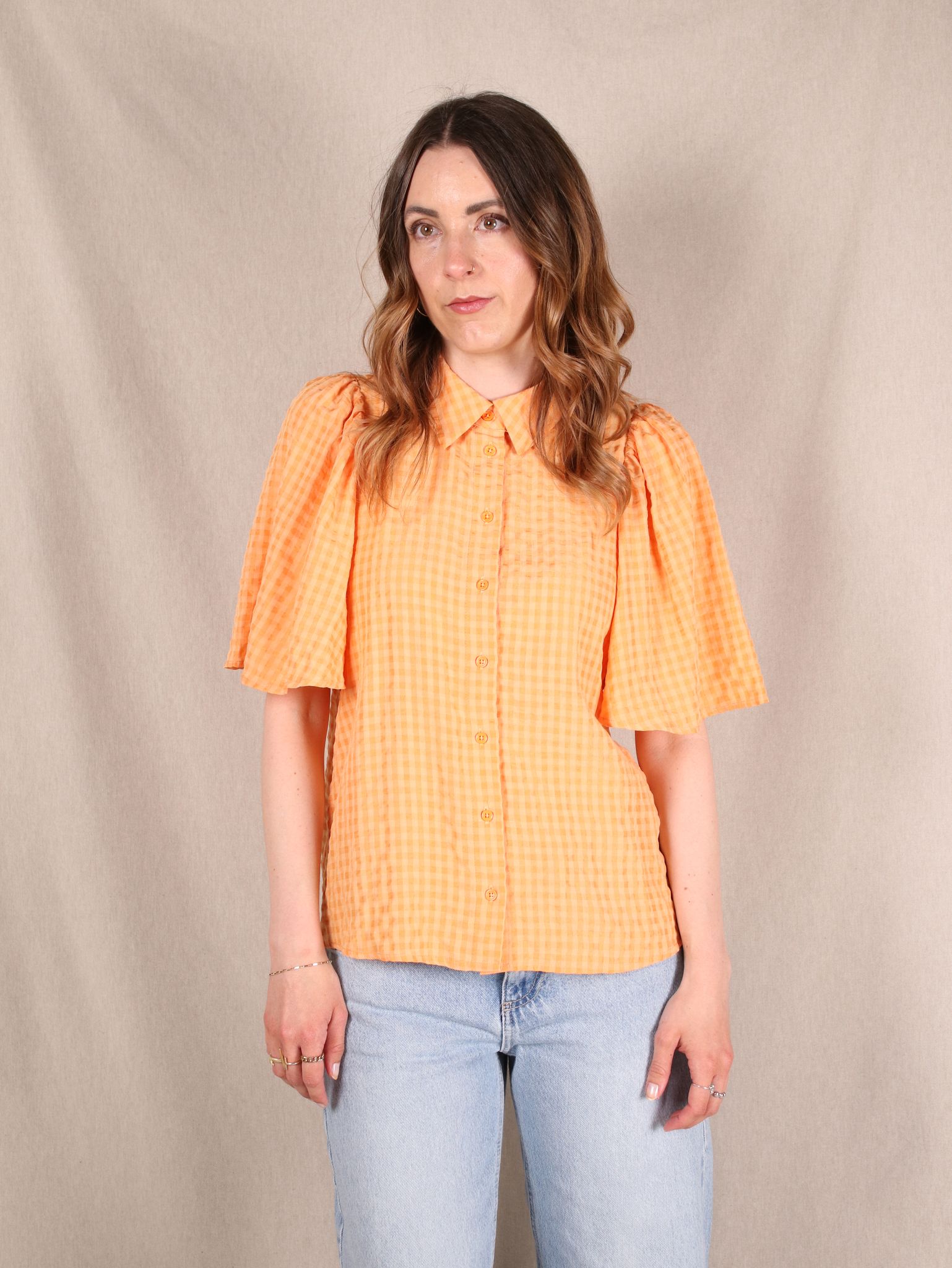 Diese Secondhand Bluse von Selected Femme bringt süße Cute-Vibes mit einem Hauch Western: oversized geschnitten, in frischem Karomuster und mit flatternden Ärmeln. Perfekt für easy Looks mit einem kleinen Augenzwinkern.
