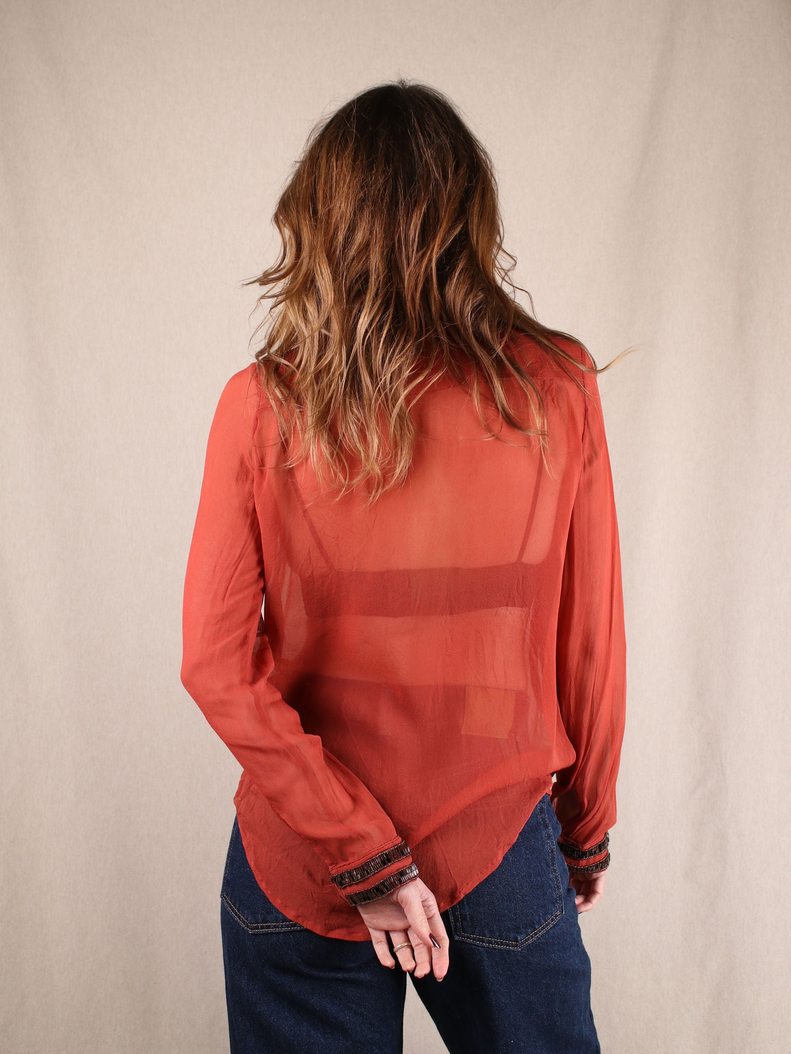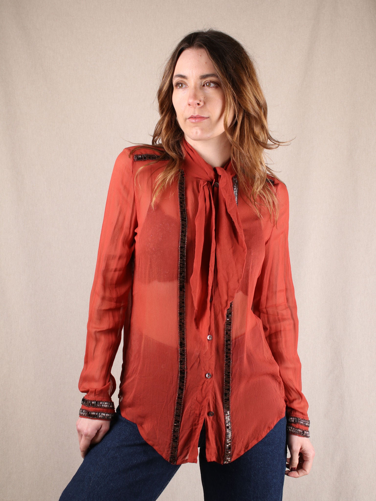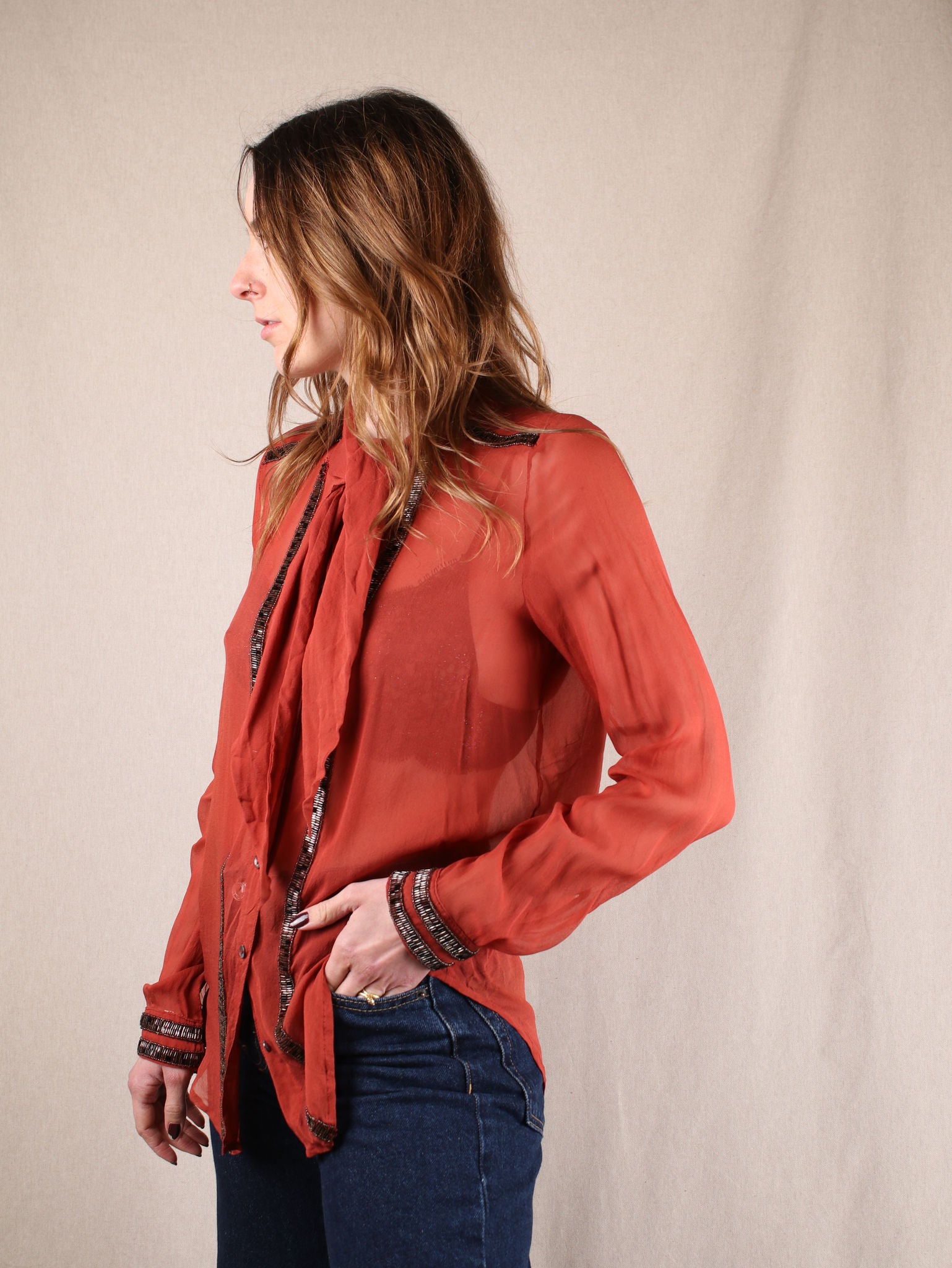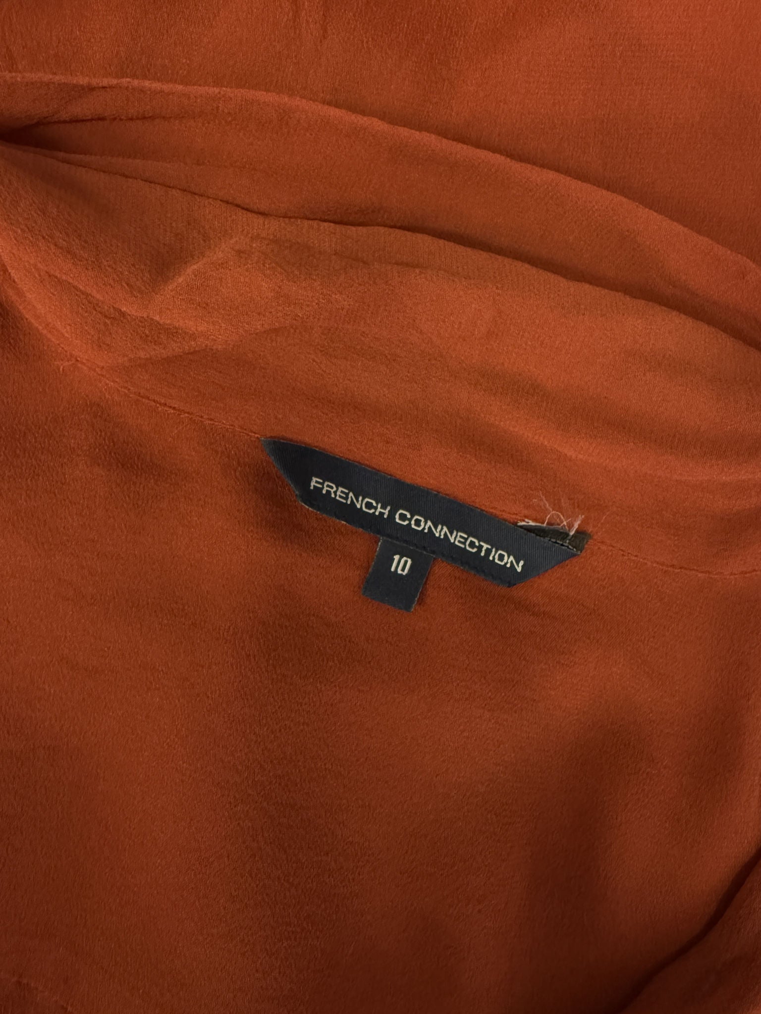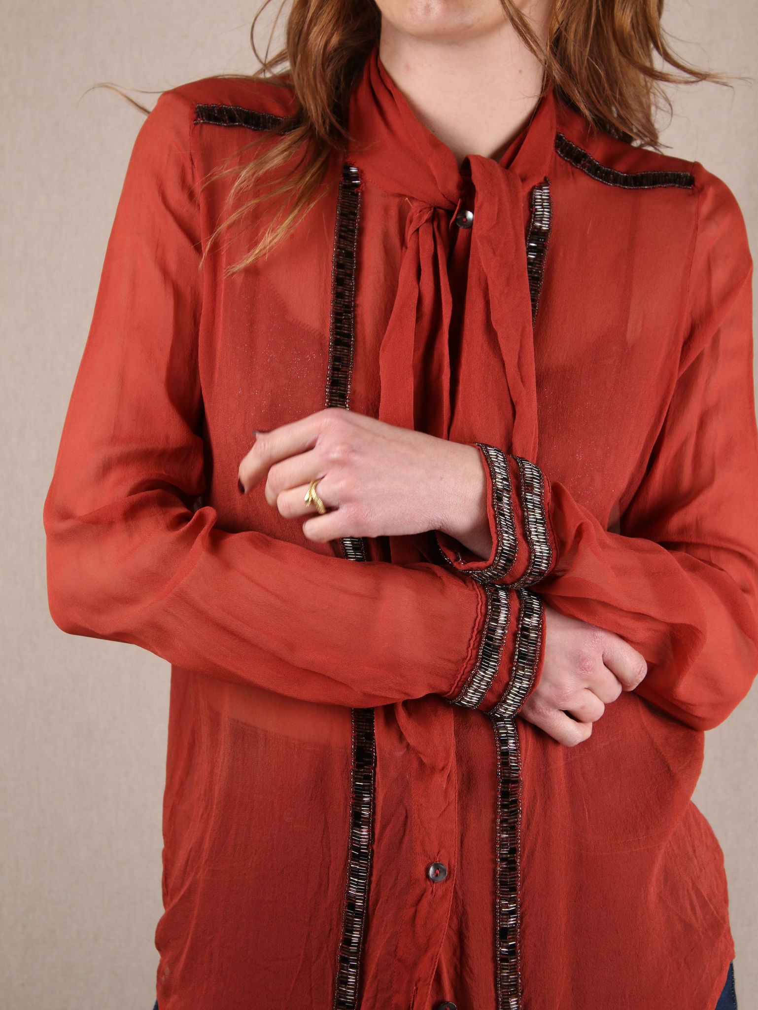 Leicht transparente Secondhand Bluse von French Connection mit Perlen und Schluppe in Rostrot.