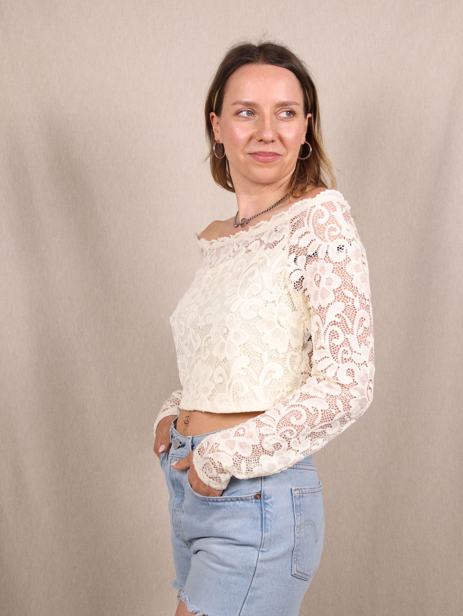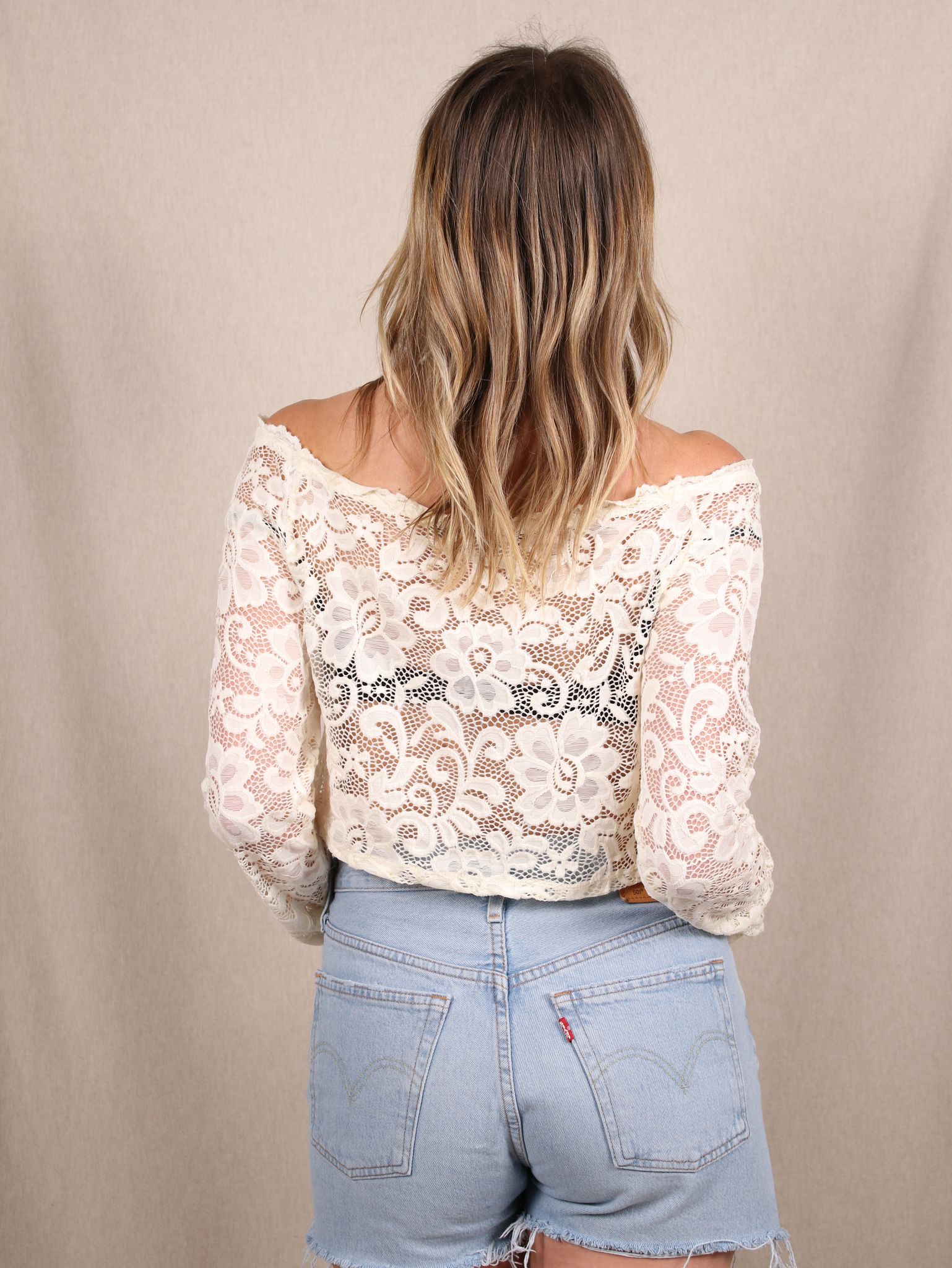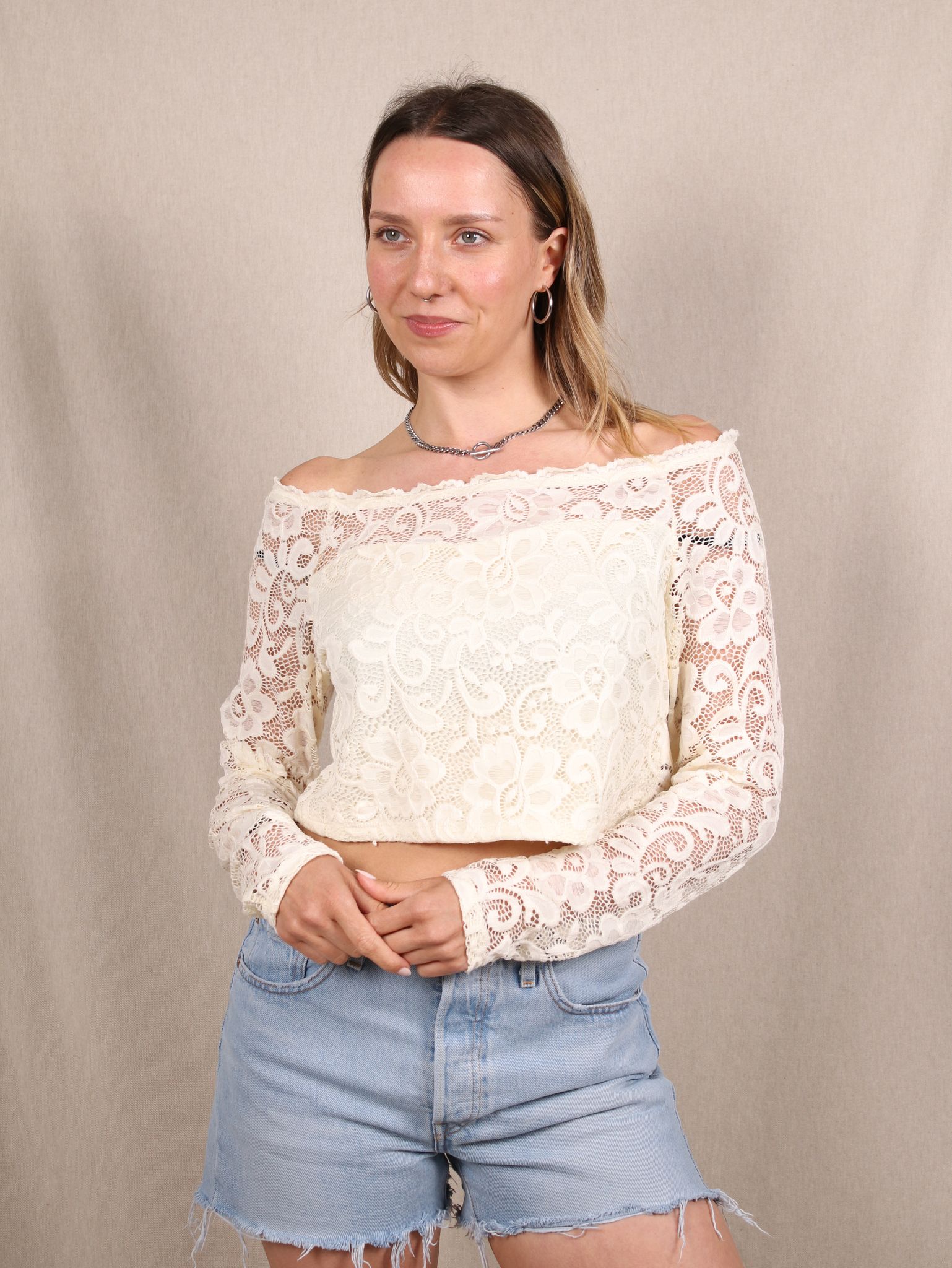 Dieses cremefarbene Longsleeve von BIK BOK bringt romantischen Western-Charme in deinen Kleiderschrank. Die zarte Spitze, der Off-Shoulder-Schnitt und die Cropped-Passform machen es zum perfekten Piece für verträumte Summer Vibes mit Romance-Attitude – ideal für Festival-Looks, Dates oder Picknicks im Grünen.