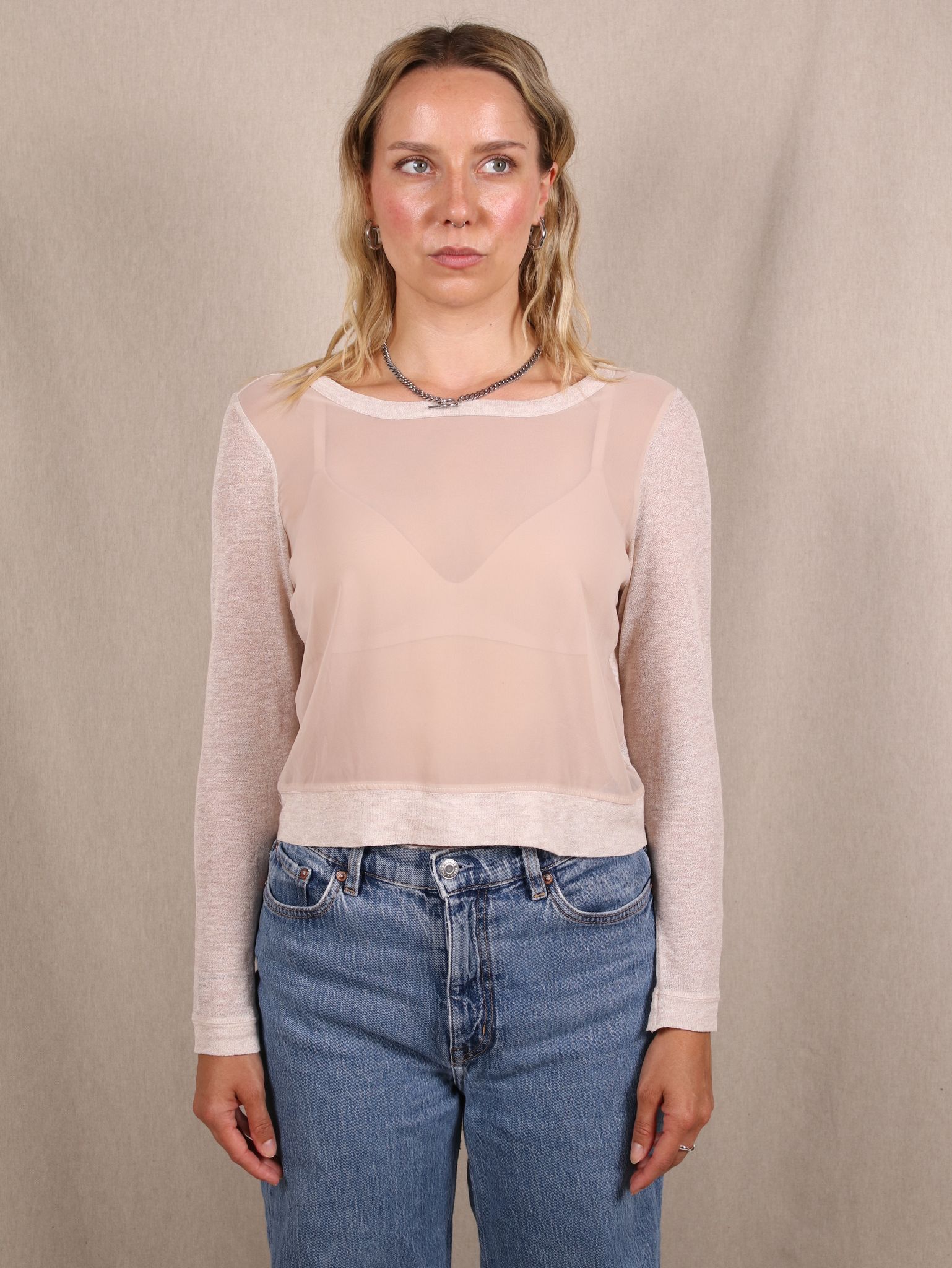 Dieses nudefarbene Longsleeve von H&M TREND kombiniert transparenten Strick mit softer Netzoptik und macht jedes Layering spannend. Leicht verkürzt geschnitten, trägt es sich wie ein zweiter Haut und passt zu Jeans genauso gut wie über ein Slipdress.