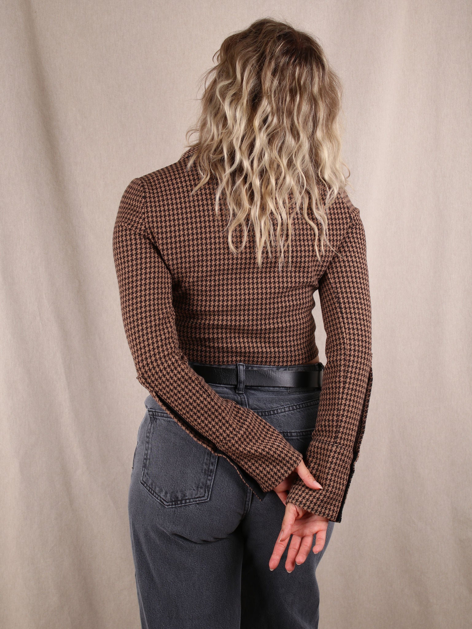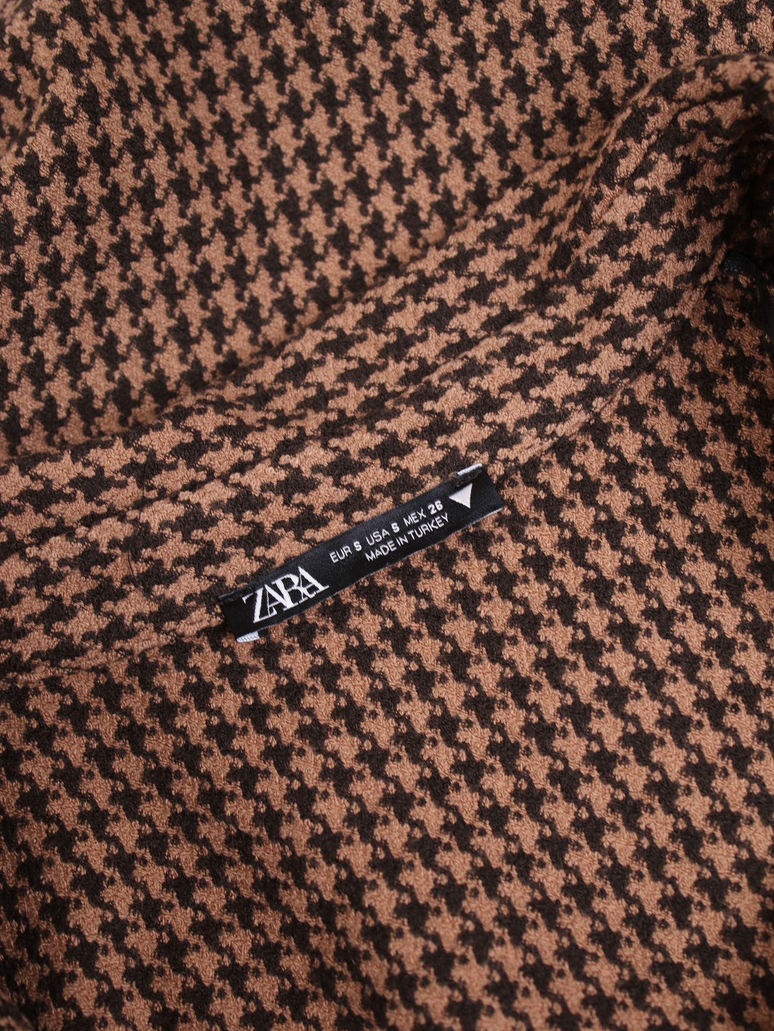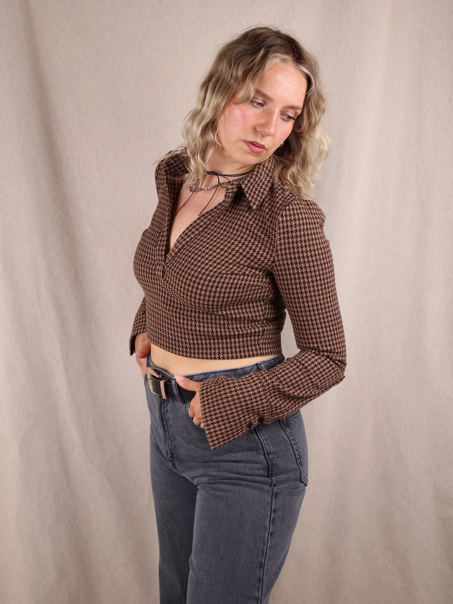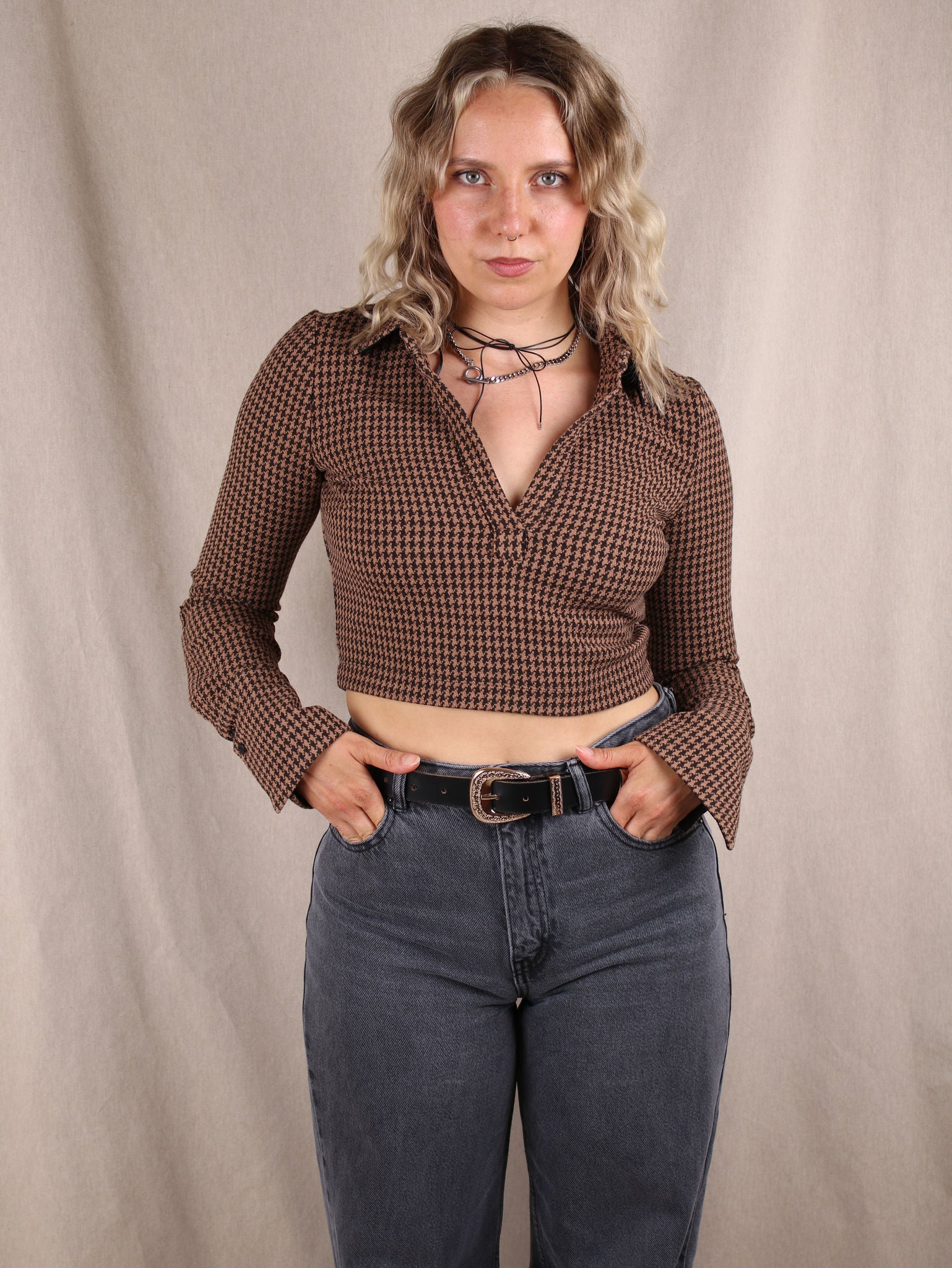 Dieses Secondhand cropped Shirt von Zara spielt mit Kontrasten: klassisches Hahnentritt-Muster trifft auf eine moderne, bauchfreie Silhouette. Der kleine Kragen und der tiefe V-Ausschnitt geben dem Look eine cleane, fast retrohafte Note, kombiniert mit einem selbstbewussten Schnitt. Perfekt zu High-Waist-Jeans oder Tailoring – ein Teil, das mühelos zwischen Vintage-Vibe und Contemporary Cool pendelt.