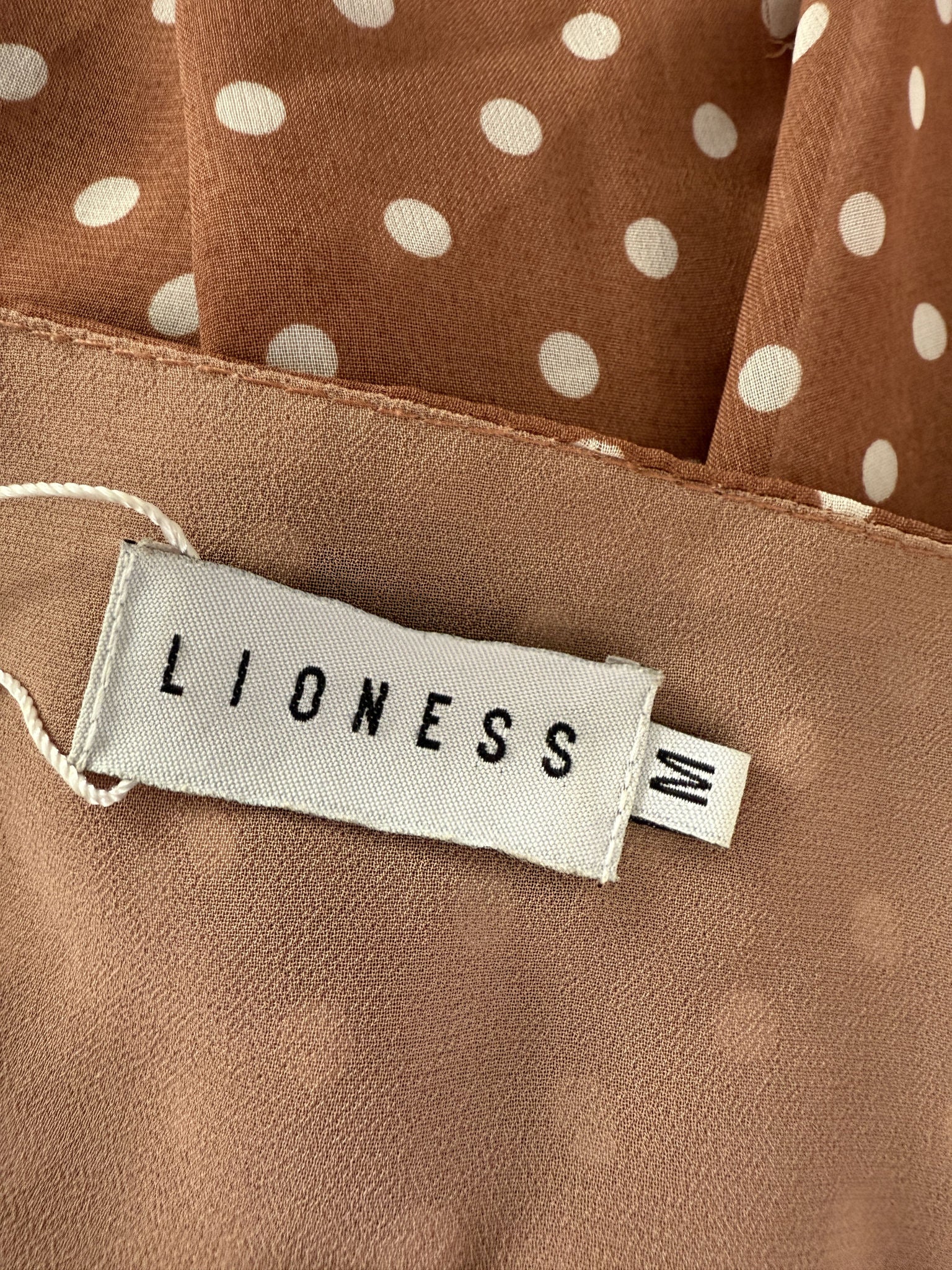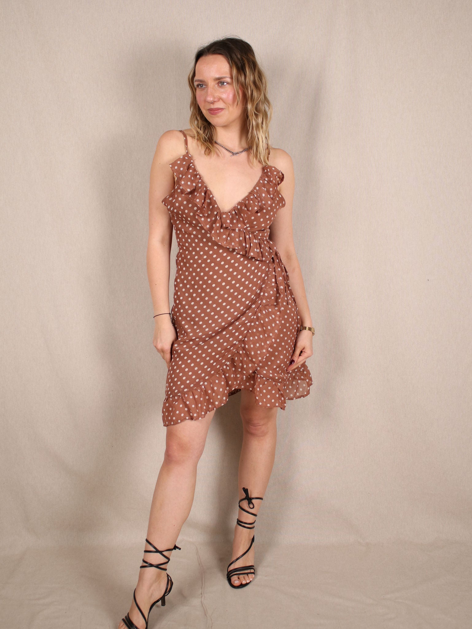Dieses Secondhand-Wickelkleid von Lioness ist ein echter Hingucker mit Retro-Vibes. Die Polka Dots auf braunem Crêpe-Stoff treffen auf verspielte Volants und sorgen für einen lässig-femininen Look. Leicht, luftig und perfekt für warme Tage oder coole Abendlooks.