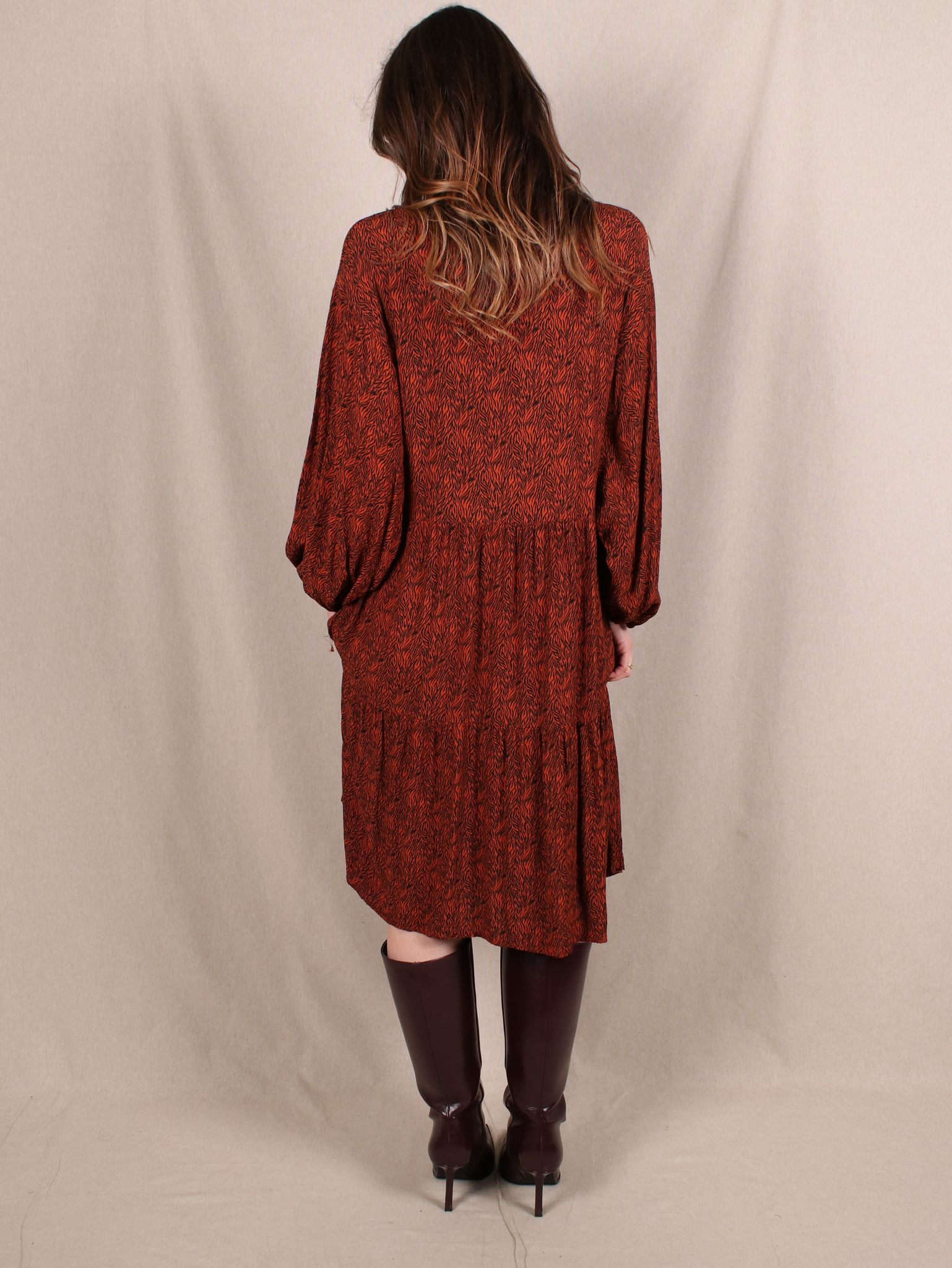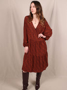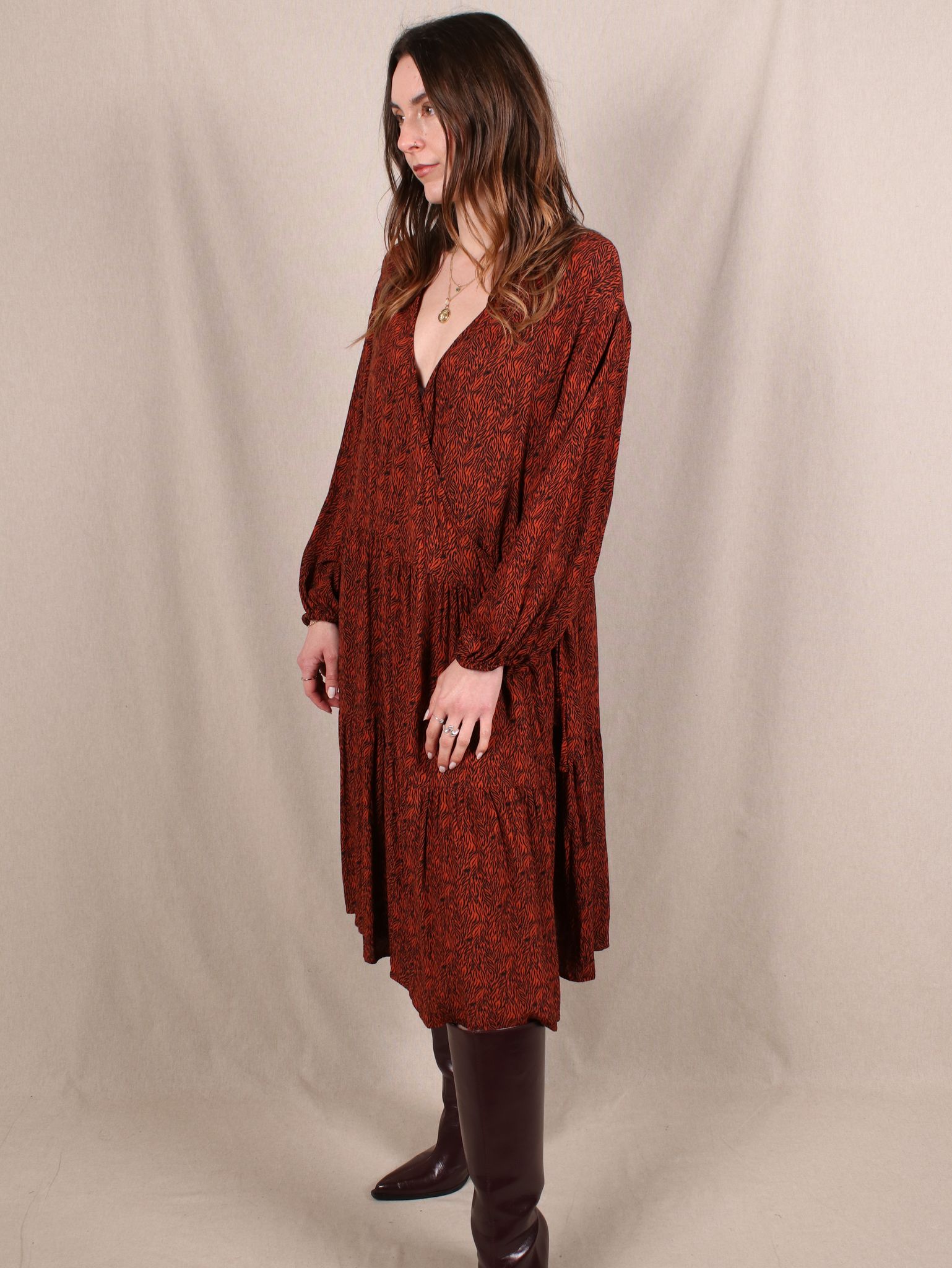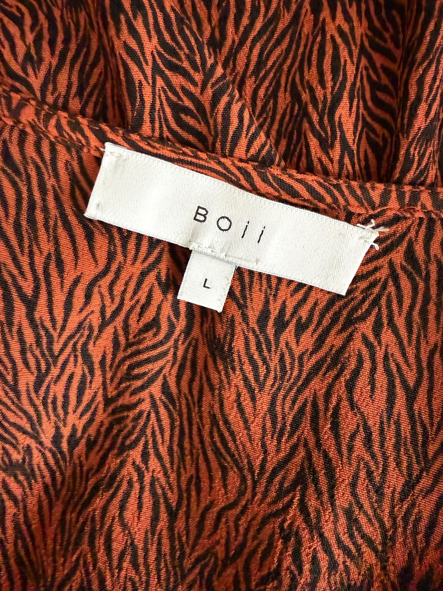 Dieses Secondhand Kleid von Boii Studios verbindet Boho-Leichtigkeit mit einer Prise Western. Der warme Rostton trifft auf ein feines Zebra-Muster, während der Wickelschnitt die Taille betont und der gestufte Rock für Bewegung sorgt. Der leichte Crêpe-Stoff fällt weich und gibt dem Look eine entspannte, fließende Silhouette.