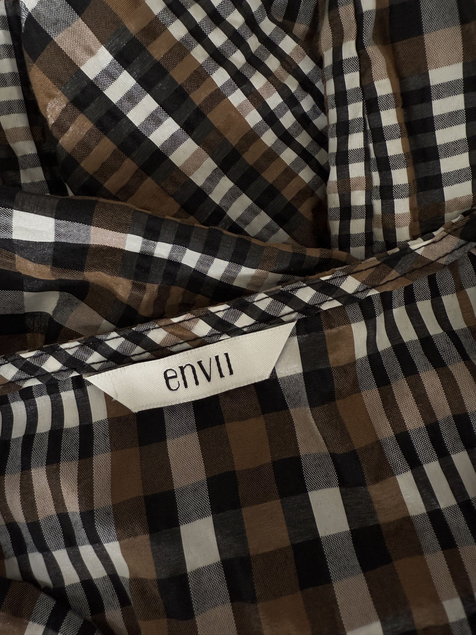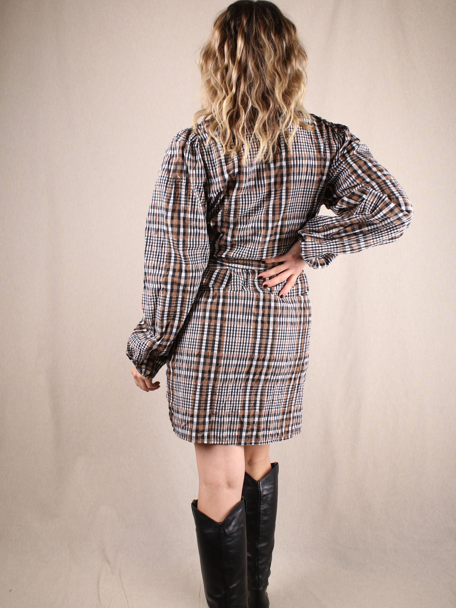 Secondhand Wickelkleid aus Seersucker von Envii mit Karo-Muster und Puffärmeln.
