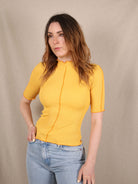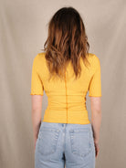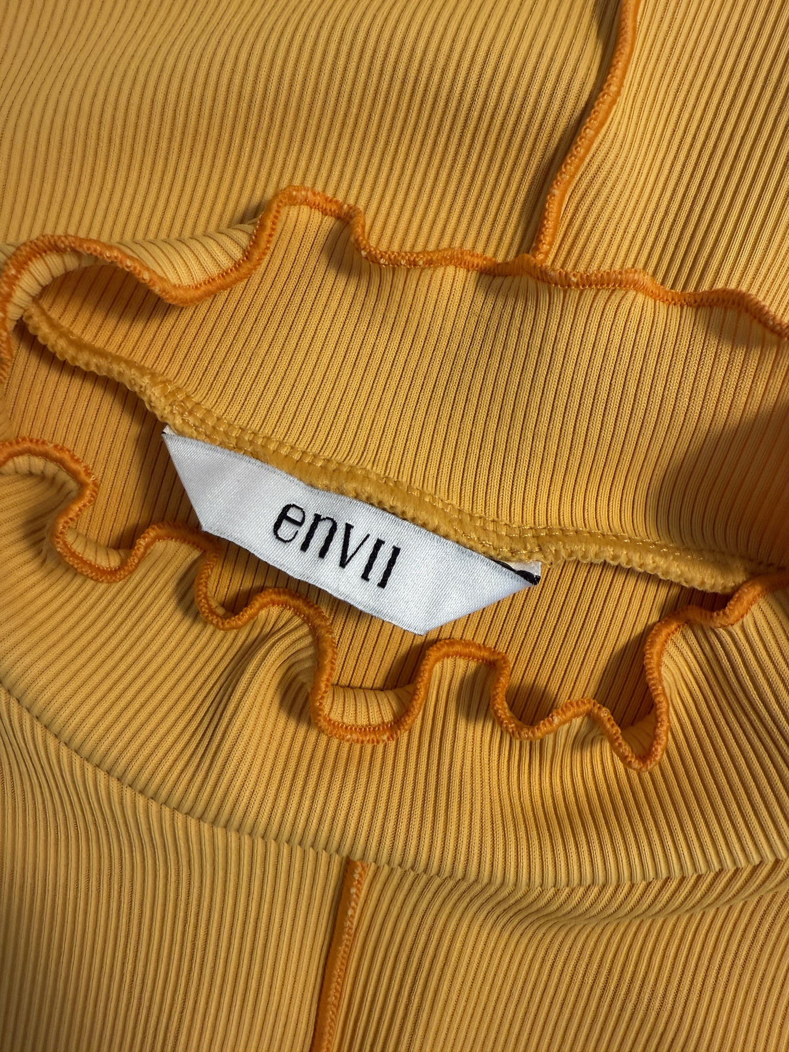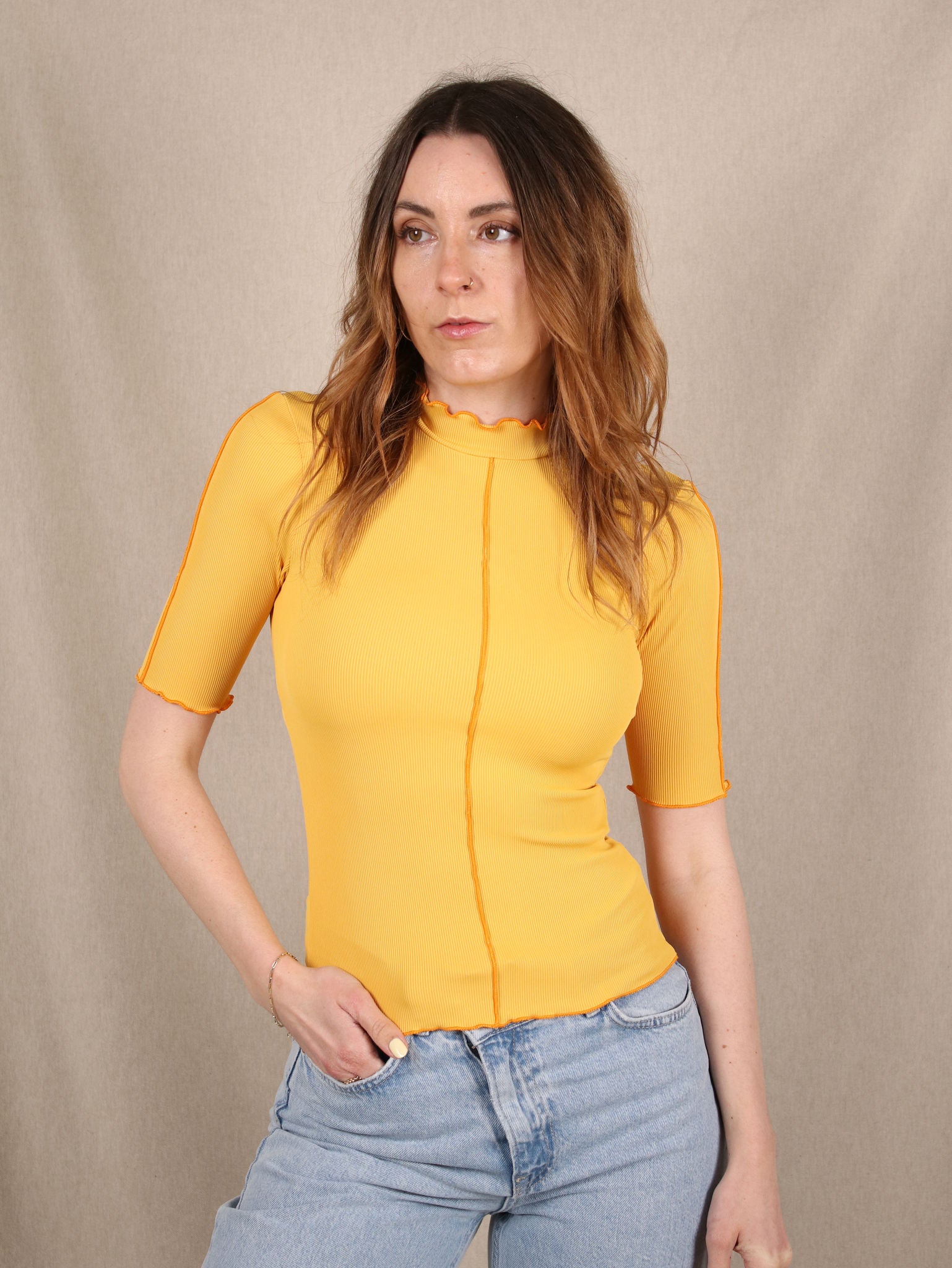 Dieses Envii-T-Shirt bringt mit kontrastierenden Nähten und dem Wellensaum den perfekten Retro-Twist. Der figurbetonte, gerippte Stoff sorgt für eine stylische Silhouette und hohen Tragekomfort. Perfekt zu Jeans oder als Layering-Piece - ein Secondhand-Highlight mit Charakter.