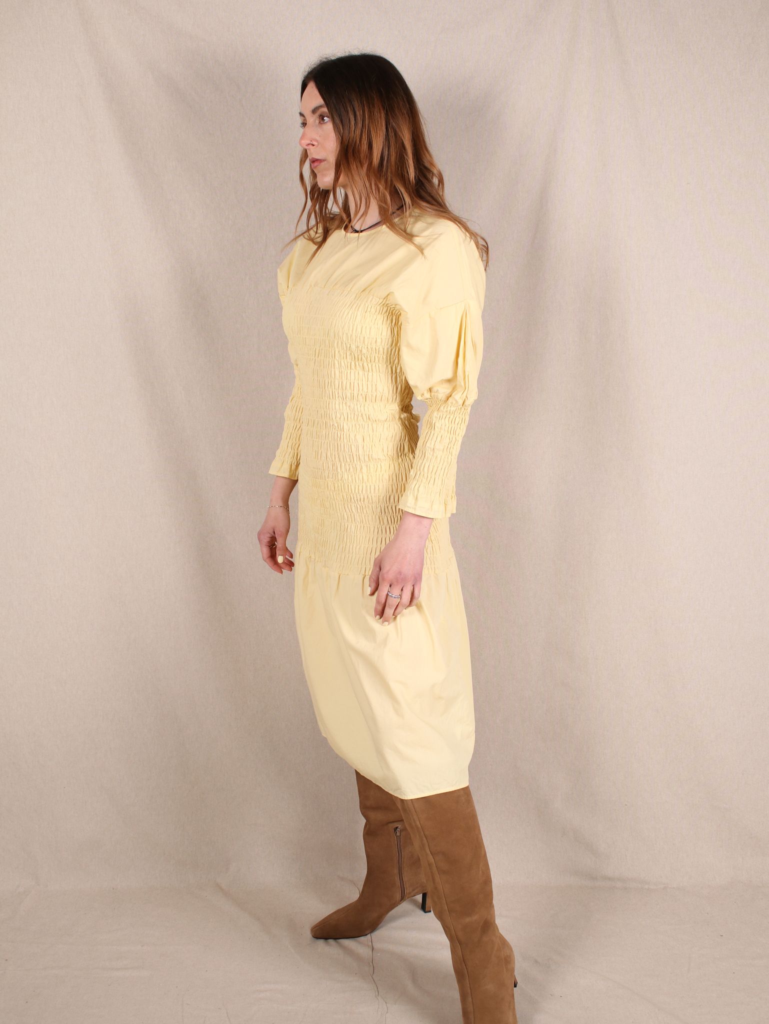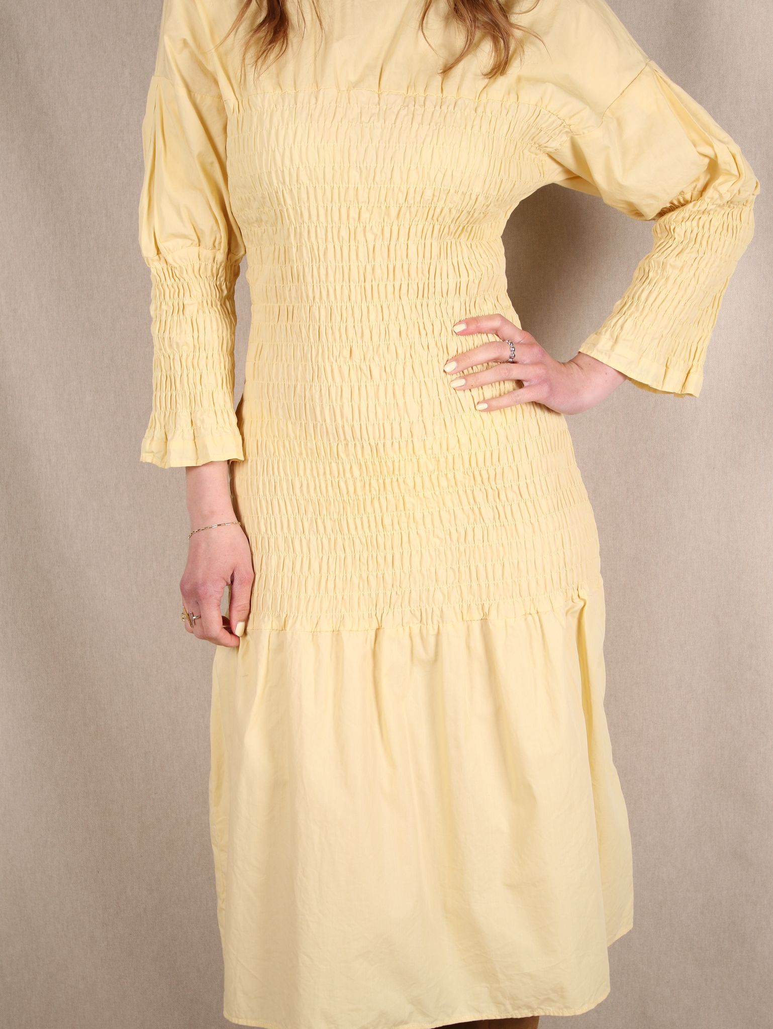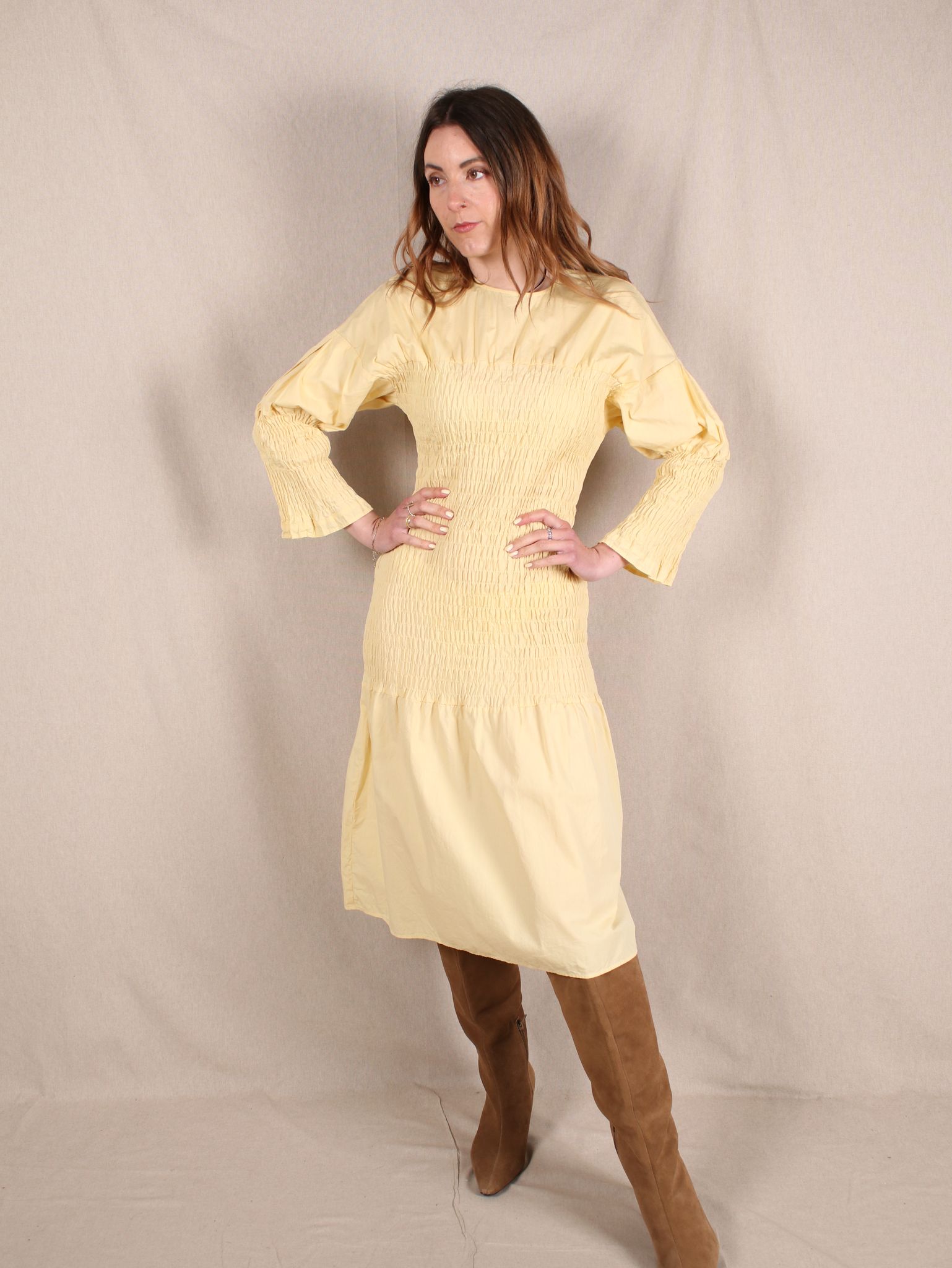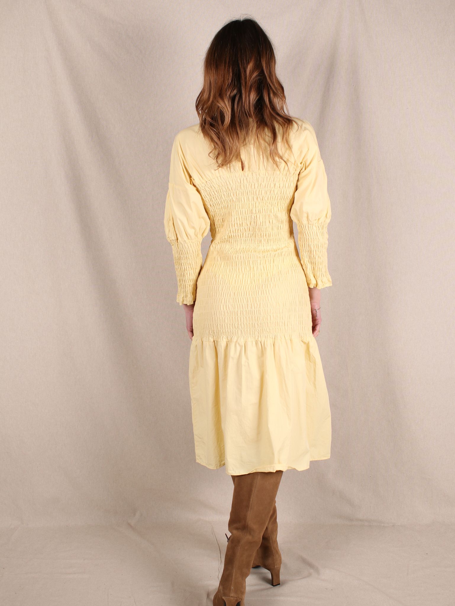 Dieses buttergelbe Kleid von Gina Tricot bringt dir sofort gute Laune. Der weiche Baumwollstoff schmiegt sich dank Smok-Einsatz herrlich an den Körper, während die langen Ärmel dem Look eine verspielte Eleganz verleihen. Ob Frühlingstag im Park, Wedding Guest oder Brunch mit den Girls - dieses Kleid schreit nach Sonne, Leichtigkeit und einem Hauch Nostalgie. Sweet, sunny & seriously cute!