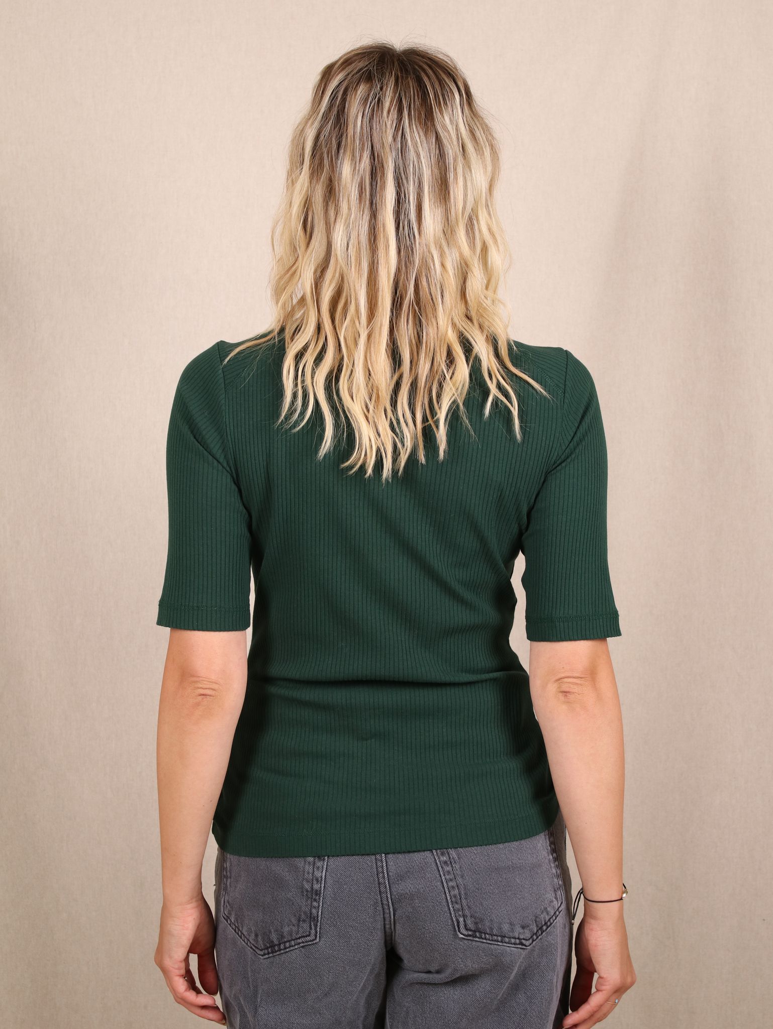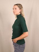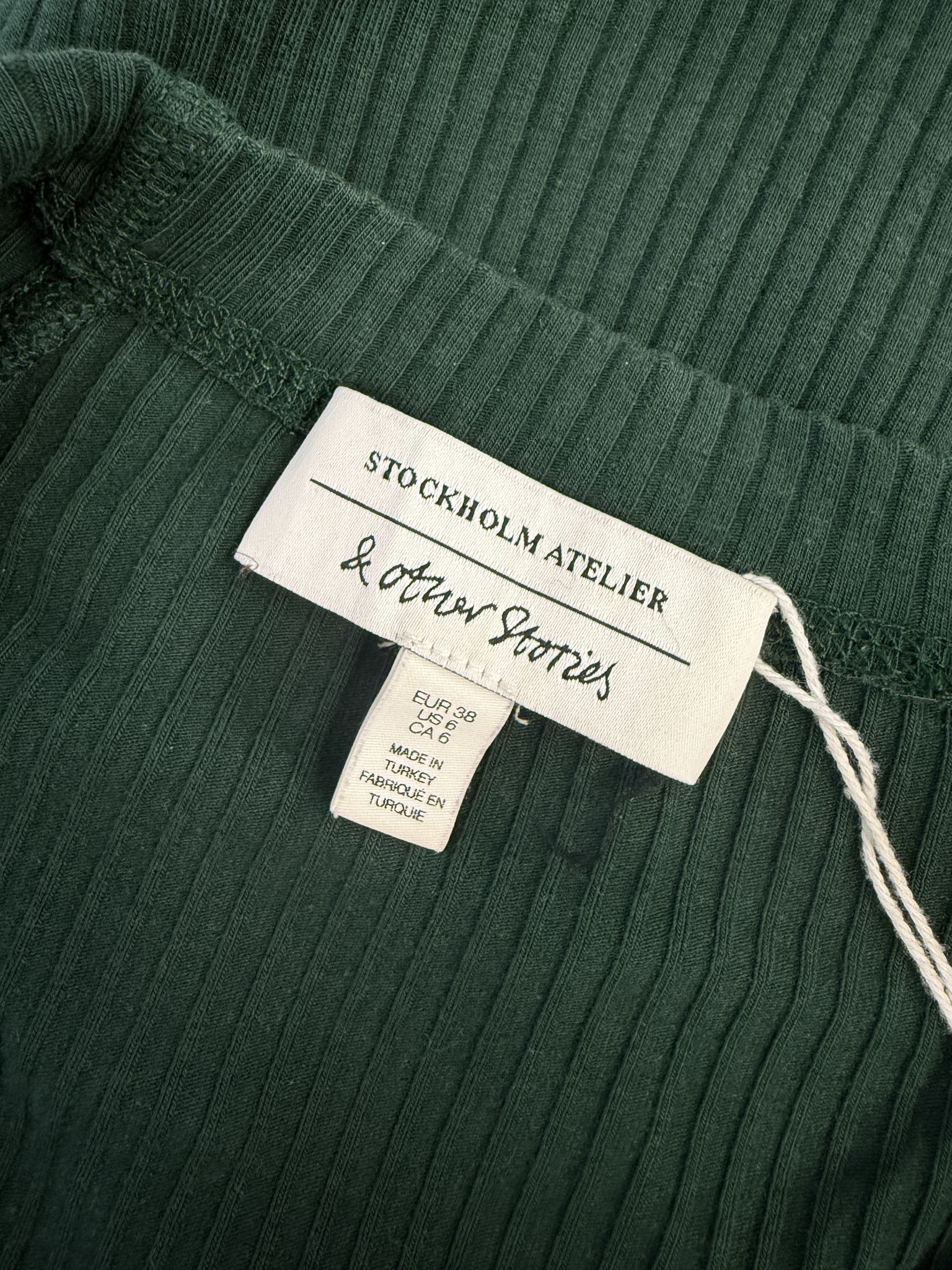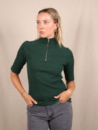 Dieses dunkelgrüne T-Shirt von & Other Stories ist ein smarter Allrounder: gerippter Baumwollstoff, eng anliegend geschnitten, mit halbem Arm und Zipper am kleinen Stehkragen – schlicht, aber mit Twist.
