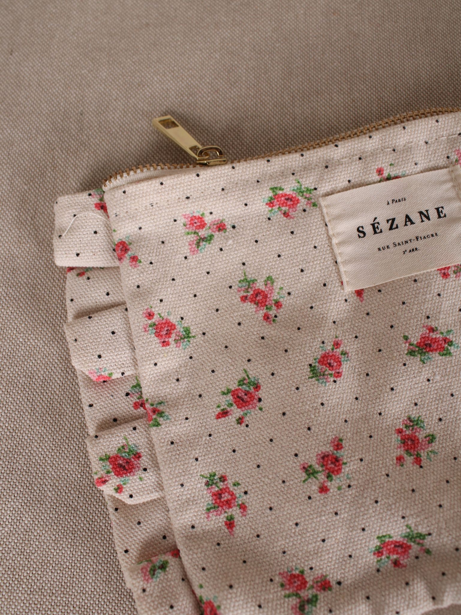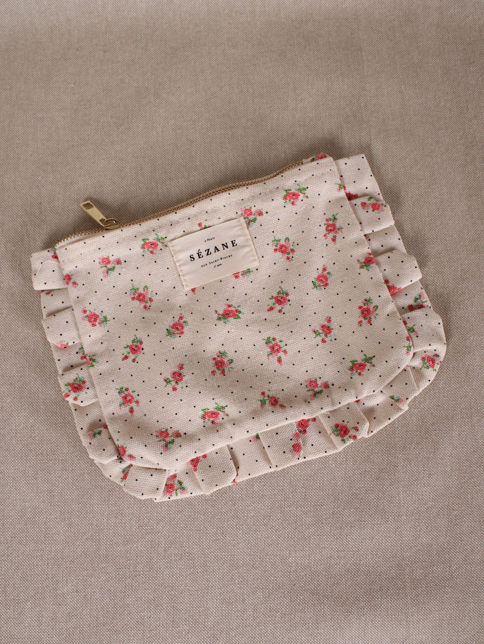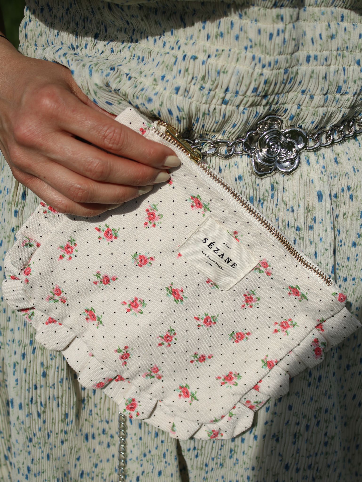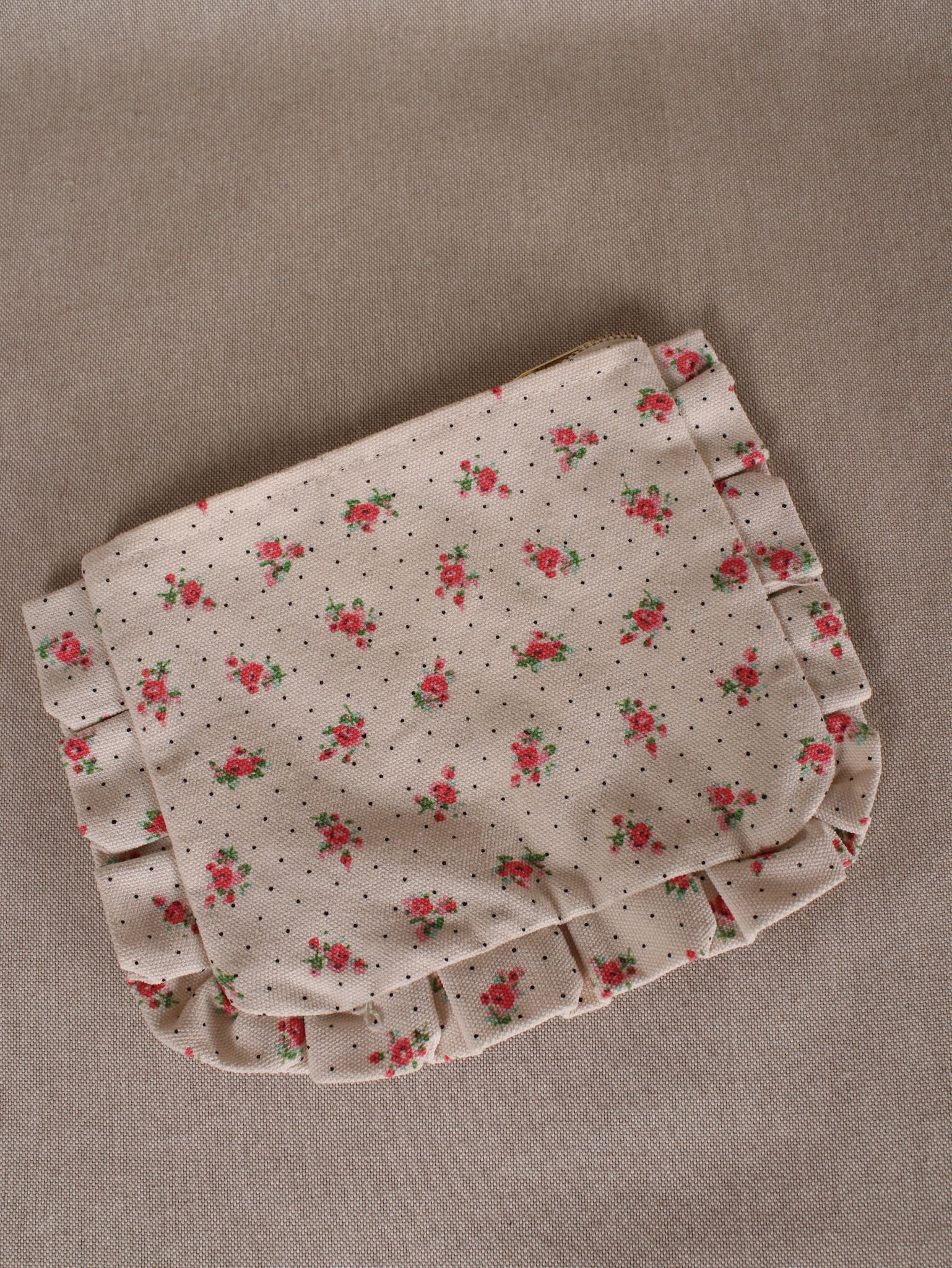 Diese süße Rüschen-Clutch aus recycelter Baumwolle (22 x 17 cm) bringt Pariser Nonchalance in deinen Alltag. Das florale Muster trifft auf Polka Dots – perfekt für Lippenstift, Schlüssel & Co. oder als Statement-Piece beim nächsten Café-Date.