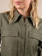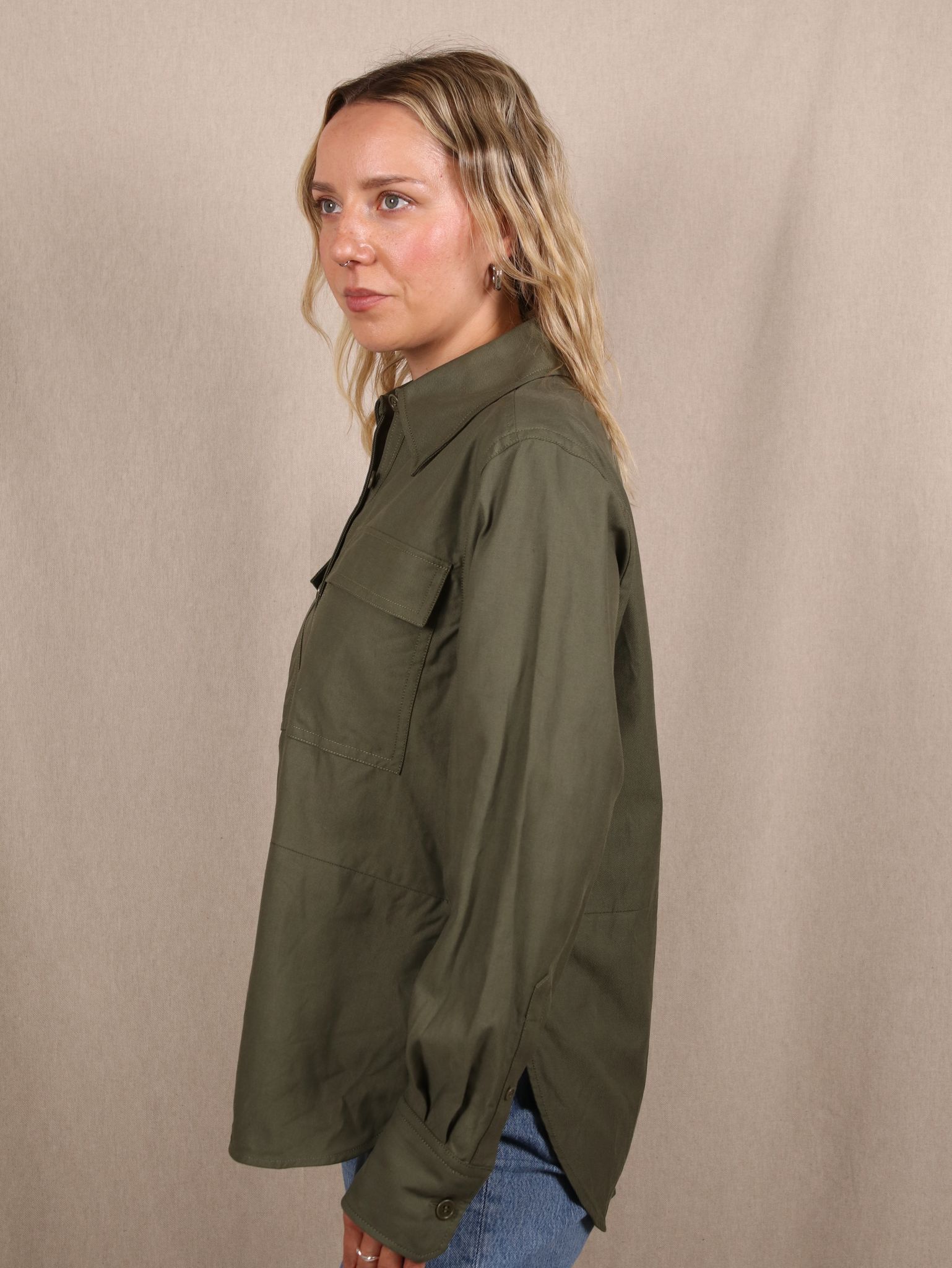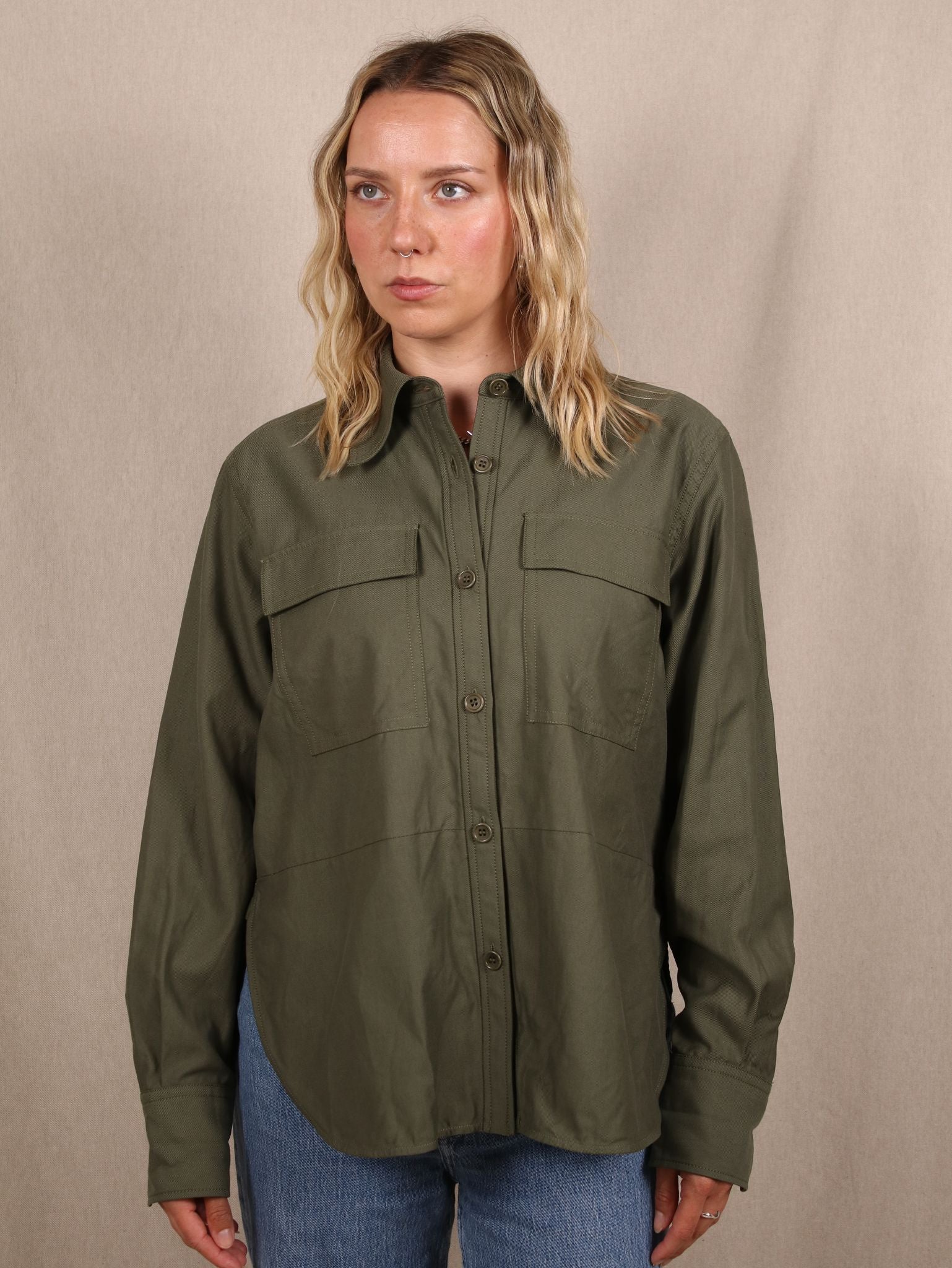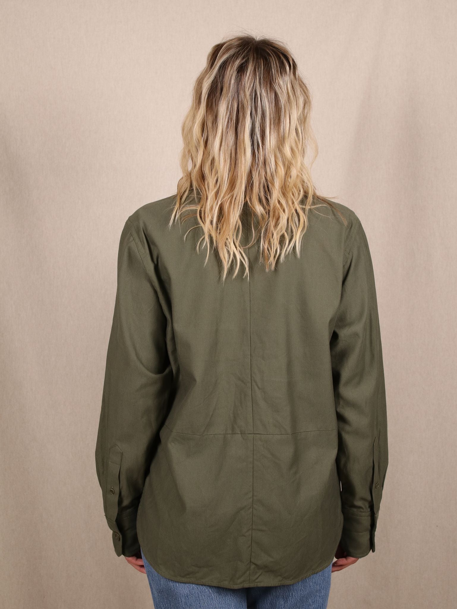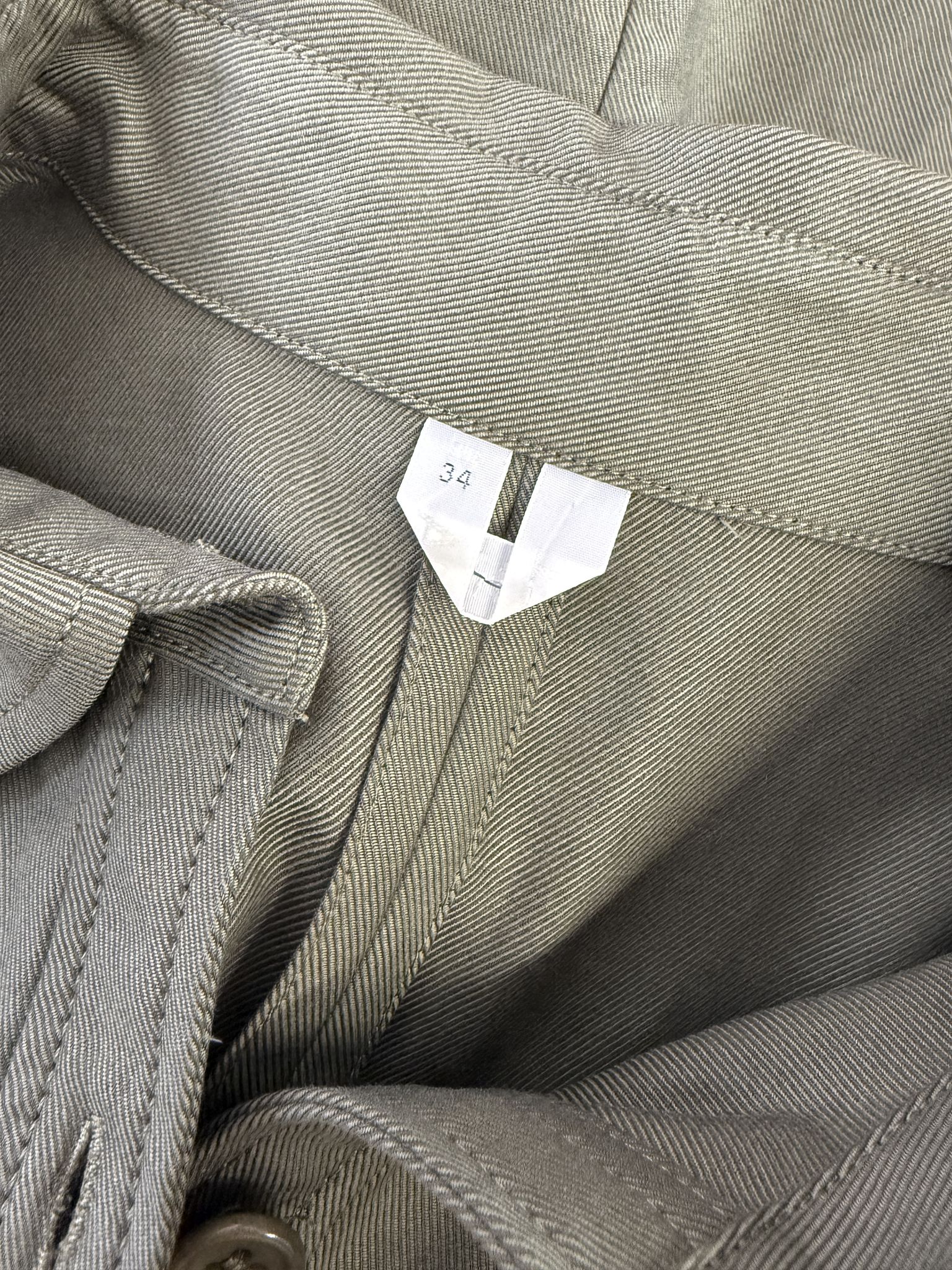 Dieses oversized Hemd von Arket in sattem Olive bringt britischen Charme in deine Garderobe. Die robuste Gabardine-Struktur trifft auf minimalistisches Utility-Design – ein vielseitiger Secondhand Klassiker für Layering-Looks mit Charakter.