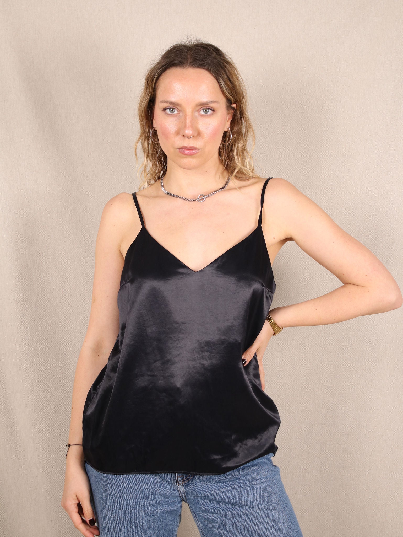 Elegant, zeitlos und mit einem Hauch von Lingerie-Vibes - dieses Secondhand-Satin-Top in Nachtblau ist dein neuer Go-To für effortless Chic. Der glänzende Stoff fällt fließend, die schmalen Träger sorgen für eine feminine Silhouette. Ob mit Jeans für den coolen Kontrast oder unter einem Blazer für einen edlen Touch – dieses Top macht immer eine gute Figur!