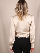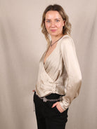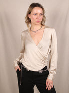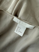 Diese Secondhand Bluse von H&M bringt mit ihrem cremefarbenen Satin und dem tiefen Wickelausschnitt genau die Art von Eleganz, die aussieht, als würdest du gleich eine Filmszene ruinieren, weil alle nur auf dein Outfit starren. Die lockere Passform fällt weich und schmeichelnd, während die feinen Knopfdetails an Ärmel und Seite dem Look subtilen Glam verleihen. Ein Piece für elegante Abende, die gern ein bisschen Drama vertragen.