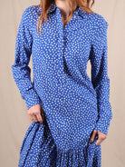 Dieses locker fallende Blusenkleid von H&M in kräftigem Blau mit weißem Punktemuster ist ein echtes Everyday-Essential. Der leichte Webstoff aus Viskose sorgt für fließende Bewegungen, die oversized Passform bringt lässige Eleganz – ob mit Boots, Sneakern oder Sandalen gestylt.