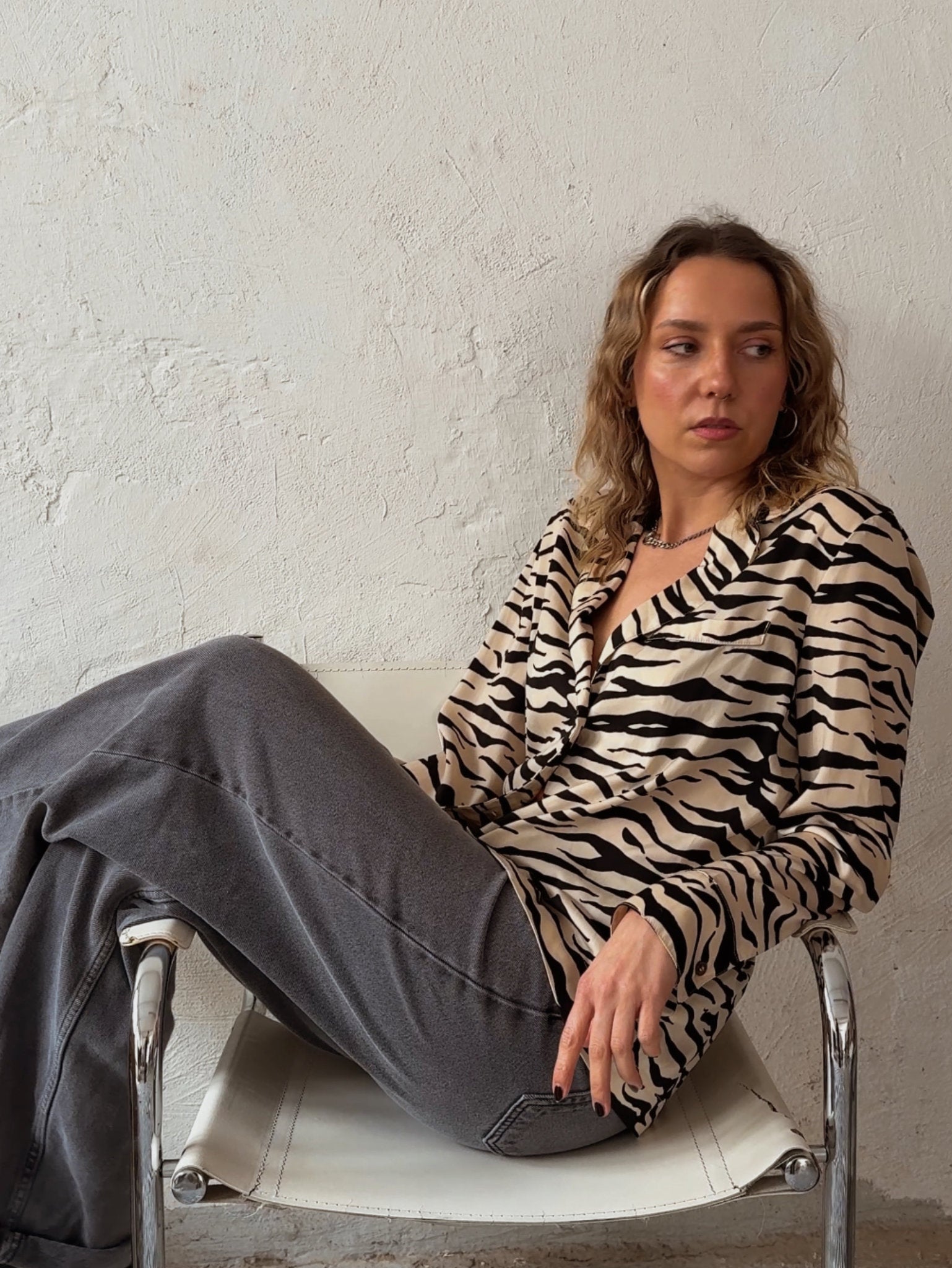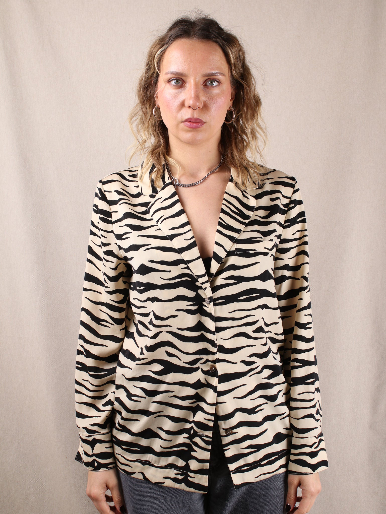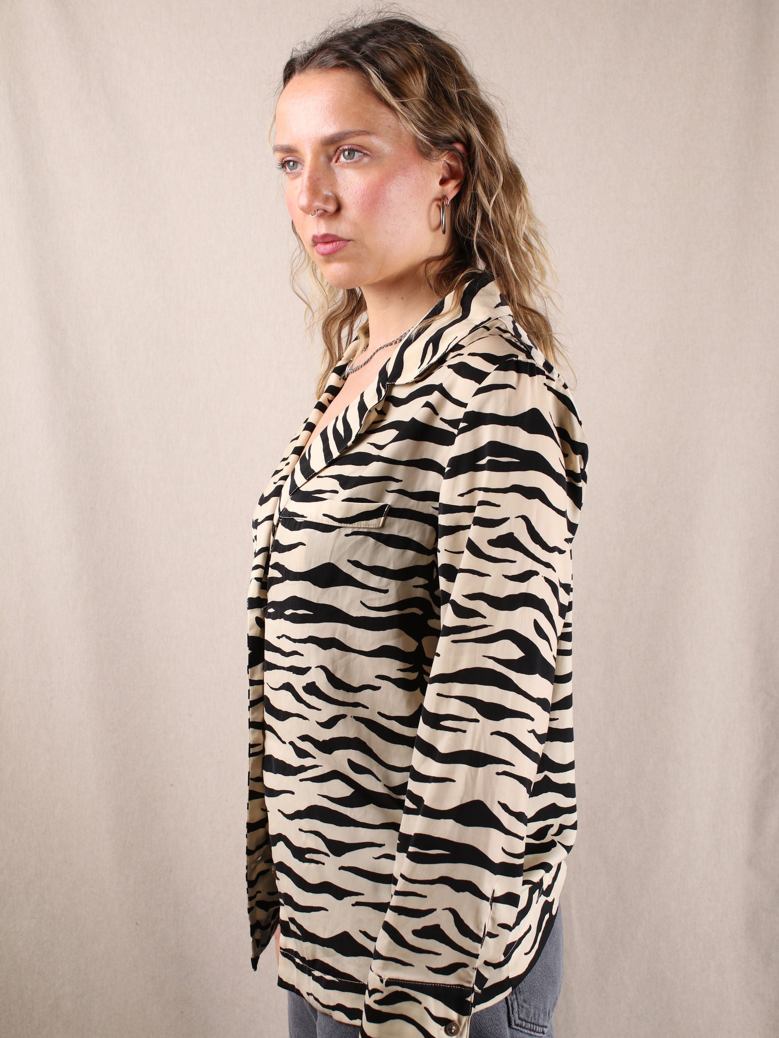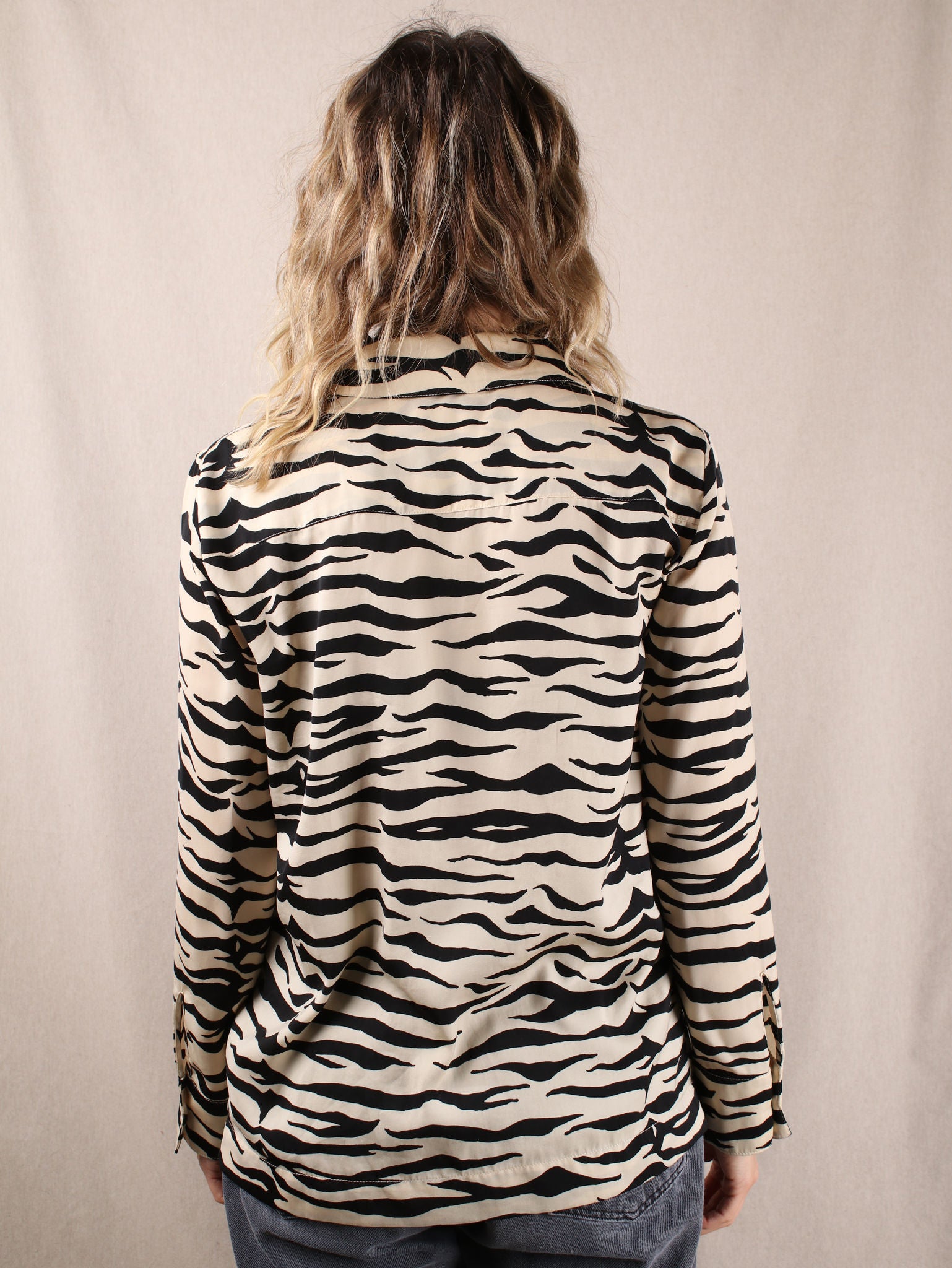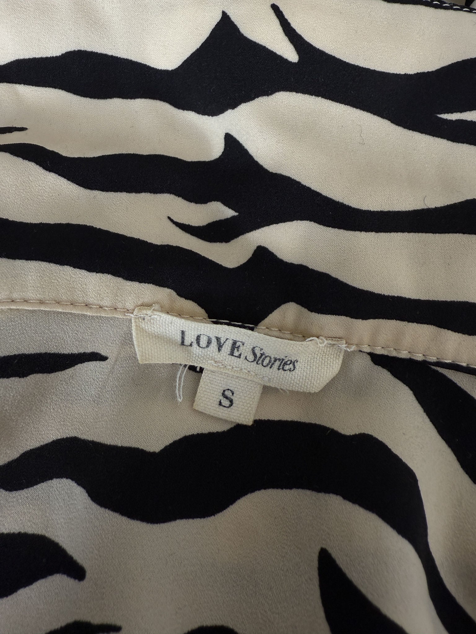 Zebra Crossing Chic Diese preloved Bluse von Love Stories ist dein neuer Style-Partner in Crime! Der luxuriöse Satin in Creme mit wildem Zebra-Muster verleiht jedem Outfit einen Hauch von Abenteuer. Die langärmelige Bluse lässt sich perfekt mit deiner Lieblingsjeans oder einem schicken Rock kombinieren und ist ein absolutes Must-have für alle, die ihren Look mit einem Hauch von Wildheit aufpeppen wollen.