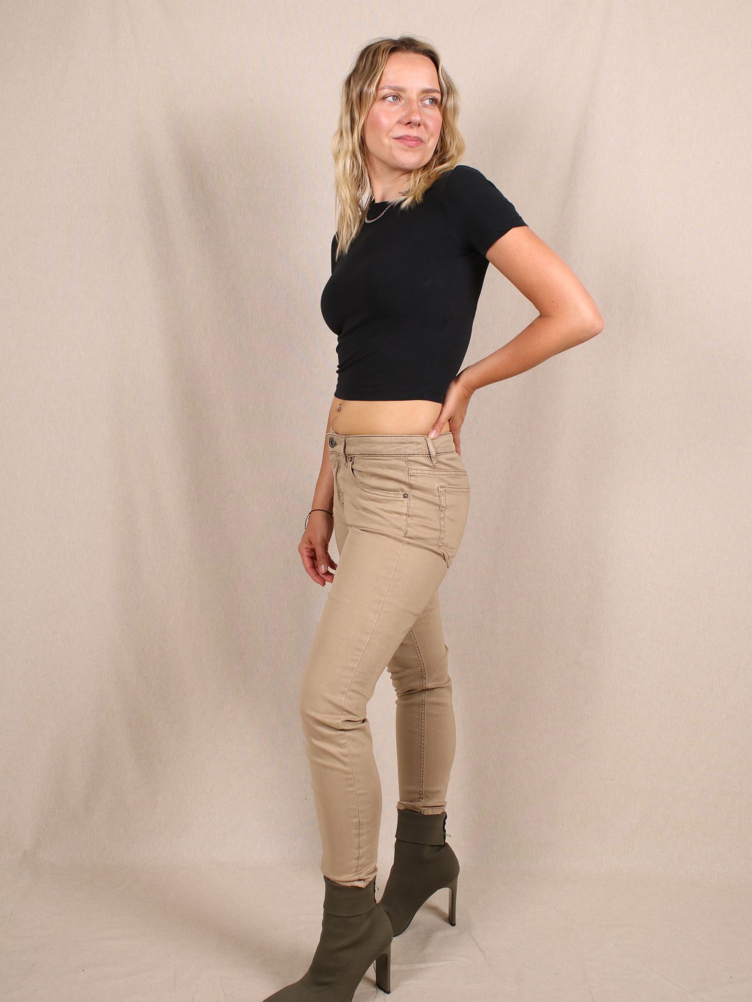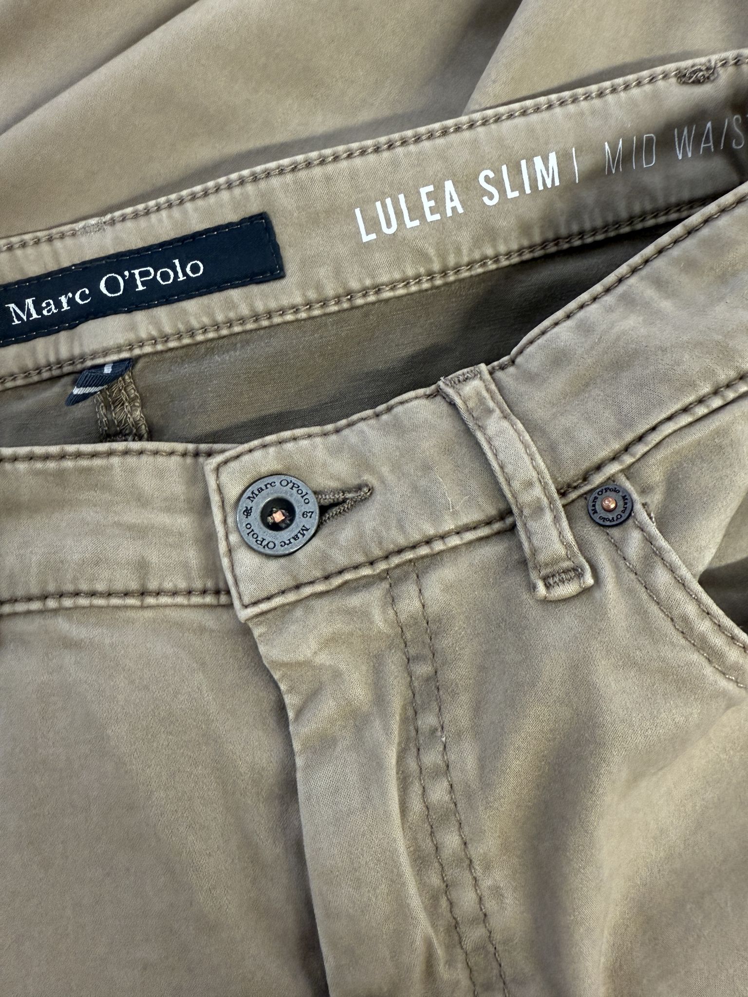 Diese Mid Waist Slim Fit Jeans in einem warmen Beigeton von Marc O'Polo bringt minimalistischen Utility-Vibe in deinen Alltag. Durch das stretchige Lyocell-Material sitzt sie bequem und formt zugleich. Ein echtes Secondhand-Lieblingsteil, das du easy mit Crop-Top oder Oversize-Hemd kombinieren kannst – von Büro bis Brunch bereit.