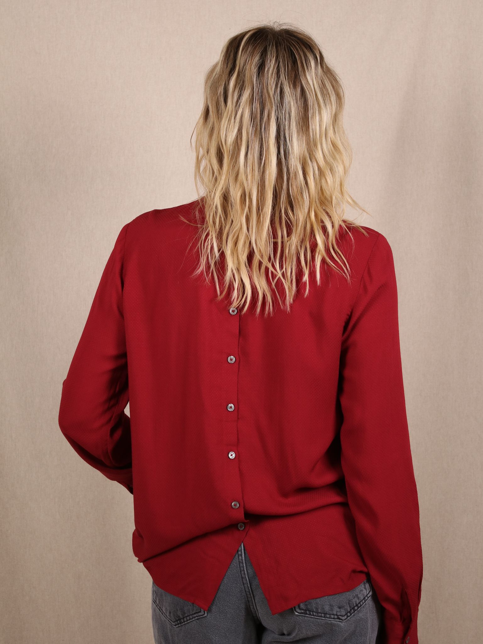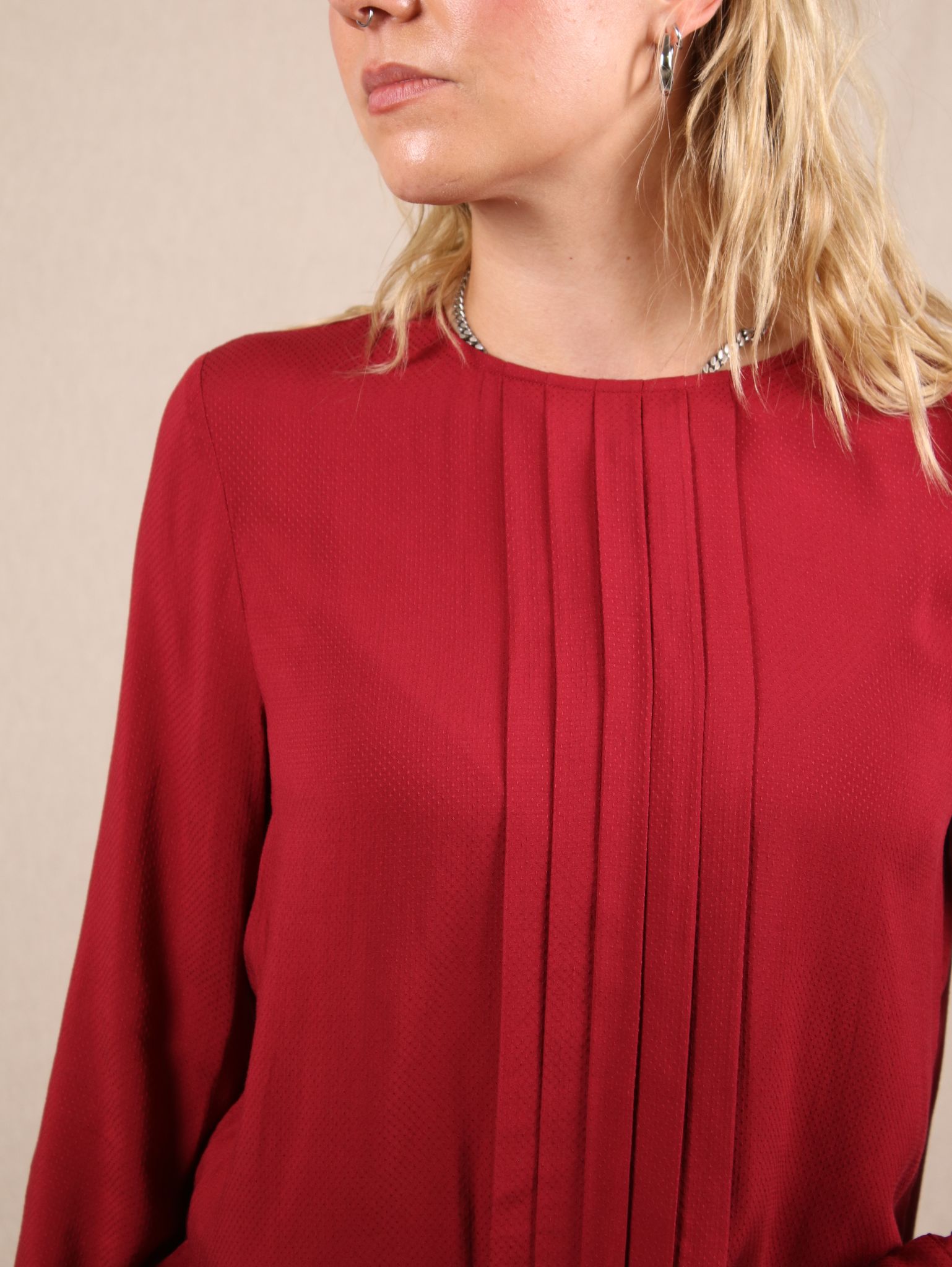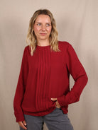 Dieses tiefrote Longsleeve von Marc O’Polo ist ein echtes Statement – und das ganz ohne Muster. Die feinen Falten und der fließende Schnitt verleihen dem Jersey-Oberteil eine elegante Note. Als Secondhand-Fundstück bringt es herbstliche Romantik in deinen Kleiderschrank – stilvoll, bequem und verantwortungsvoll.