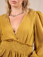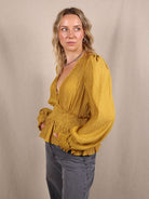 Diese ockerfarbene Bluse von NA-KD ist ein echtes Statement – von der tiefen Taille mit Schößchen bis zu den dramatisch gerafften Ärmeln. Der plissierte Stoff bringt Struktur, die Farbe bringt Stimmung. Perfekt für goldene Herbsttage, Dinner-Dates oder einfach einen Look mit Wow-Faktor.