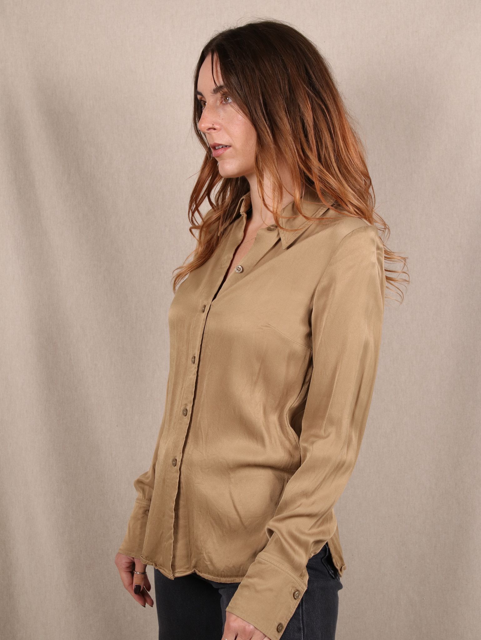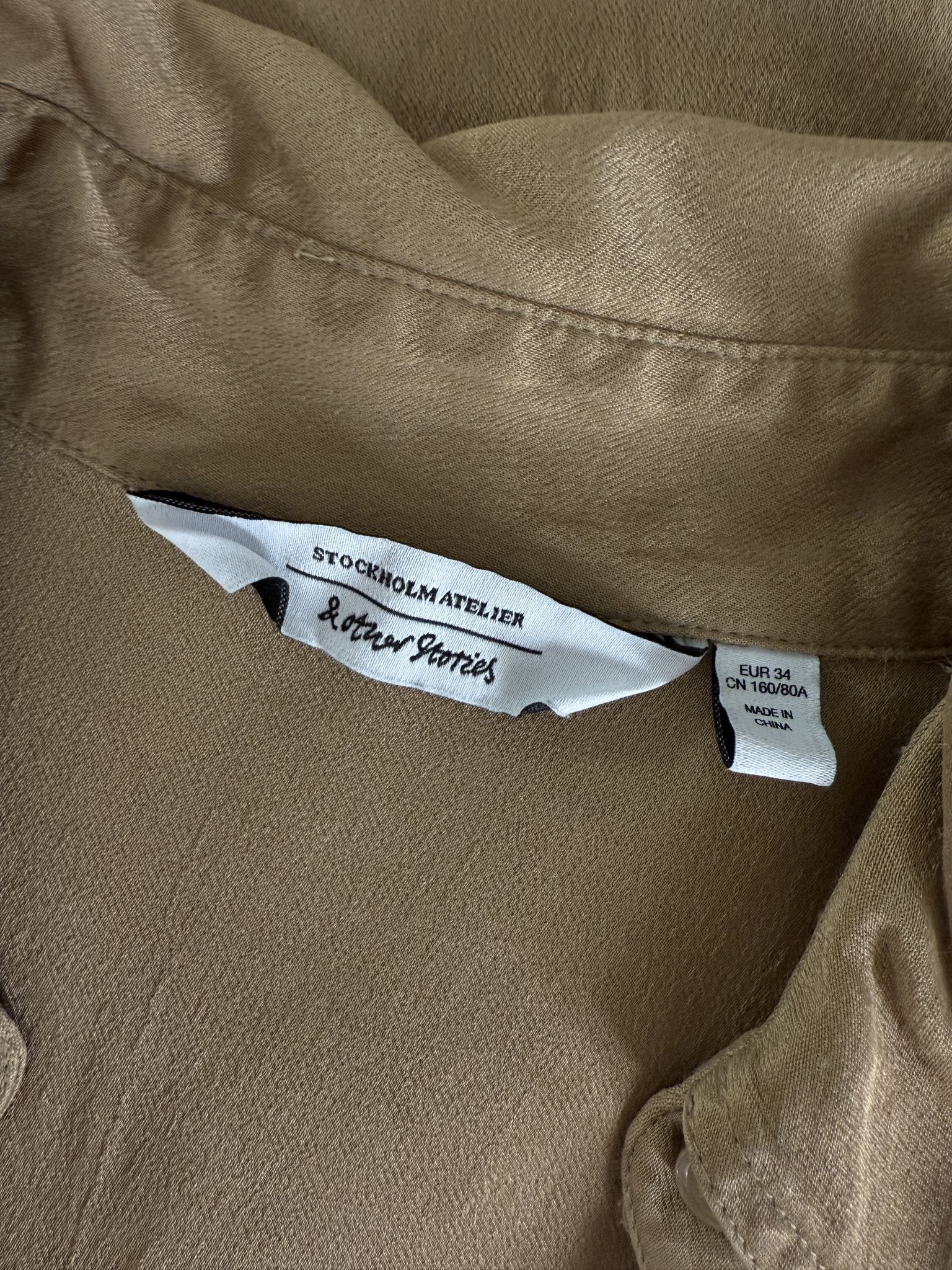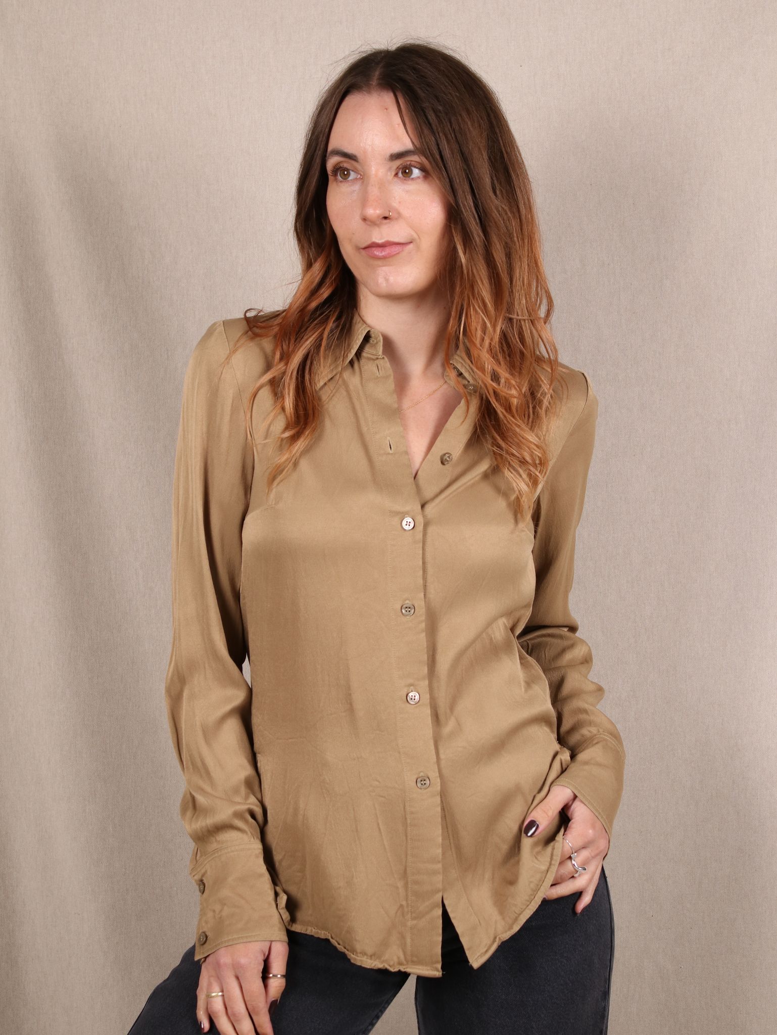 Diese taillierte Bluse von & Other Stories schreit nach britischem Chic mit Mocha-Mousse-Flair. Der fließende Satin aus Viskose legt sich soft auf die Haut und gibt deinem Look einen Hauch Hugh-Grant-Romcom – nur smarter. Ob Office-Meeting oder Café-Date in der Nachmittagssonne: Dieses Piece passt immer. Und weil sie Secondhand ist, trägst du Stil mit Haltung.