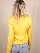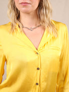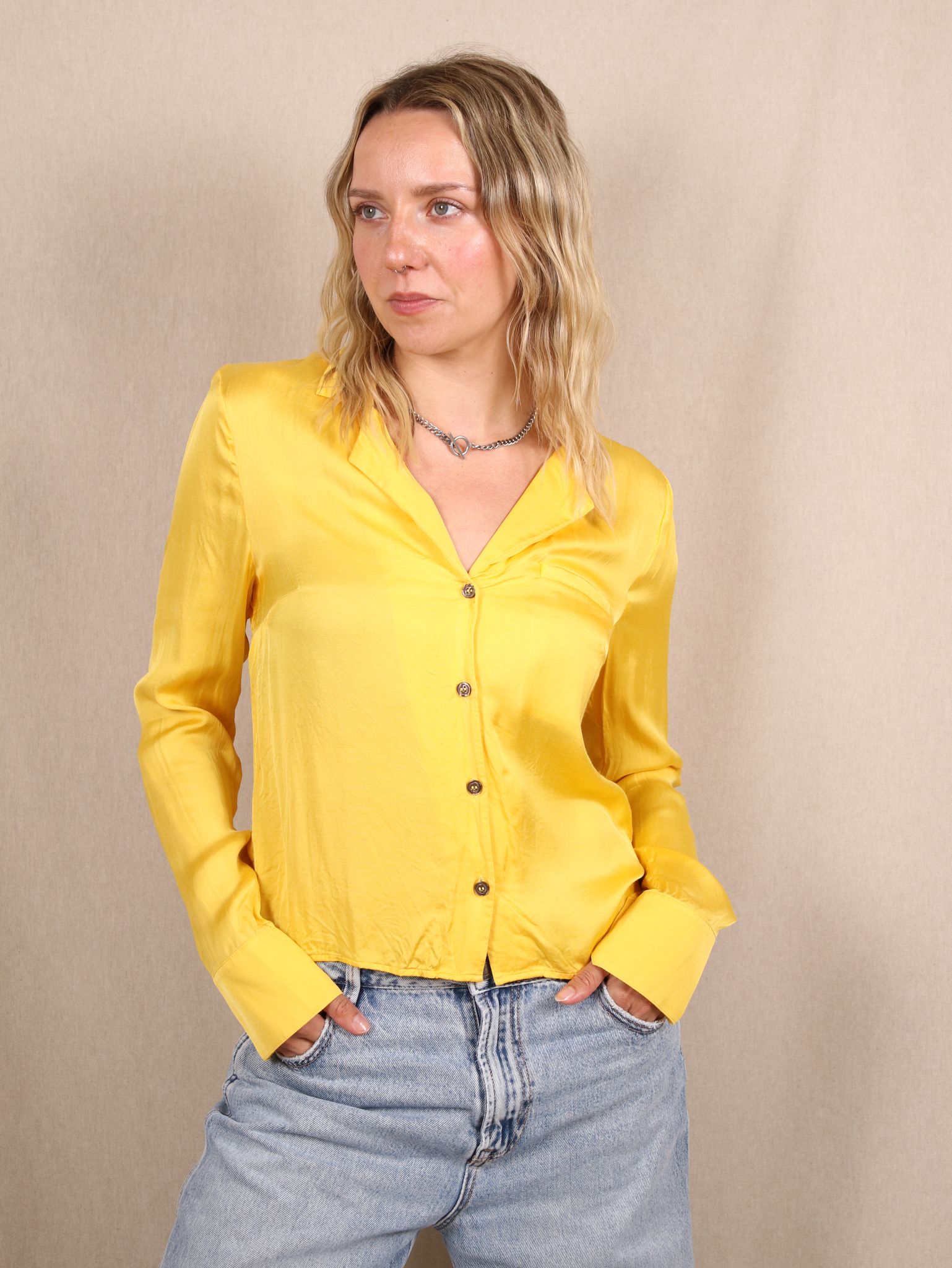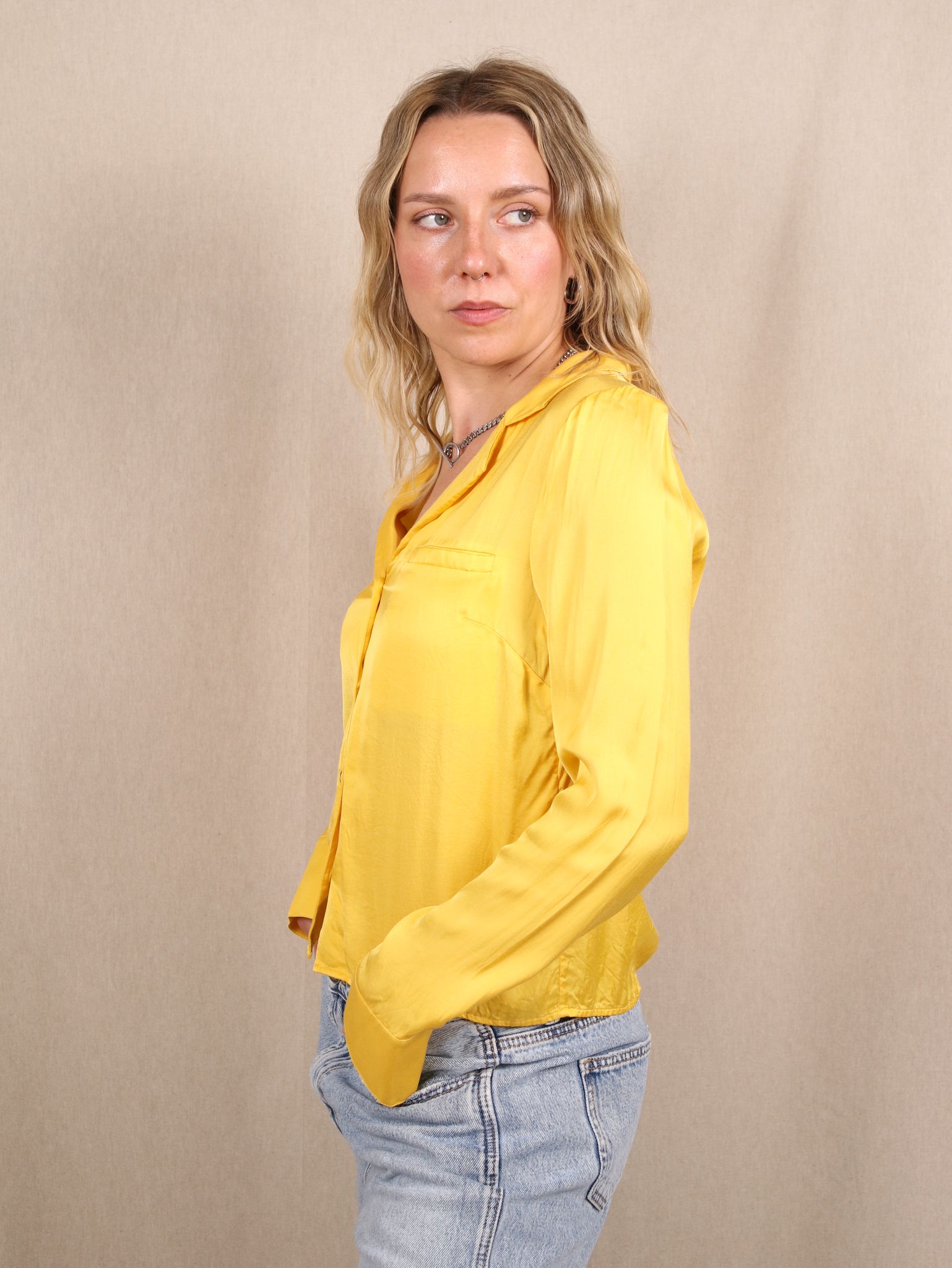 Diese taillierte Bluse von & Other Stories bringt Eleganz in strahlendem Gelb. Der glänzende Viskosestoff fällt fließend, breite Manschetten setzen Akzente. Lässt sich easy hochgeschlossen stylen oder lässig offen tragen – ein vielseitiger Secondhand Hingucker mit Boho-Vibe.