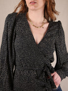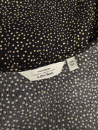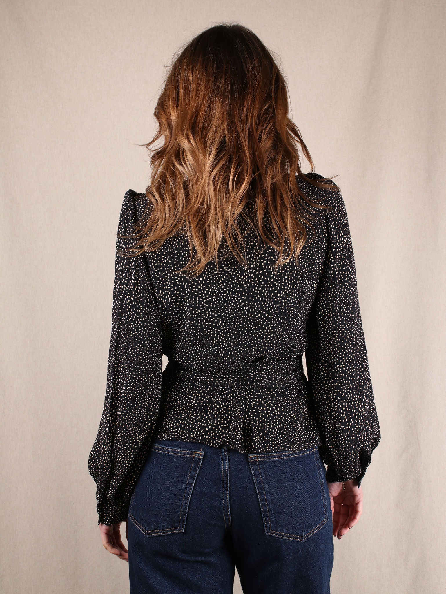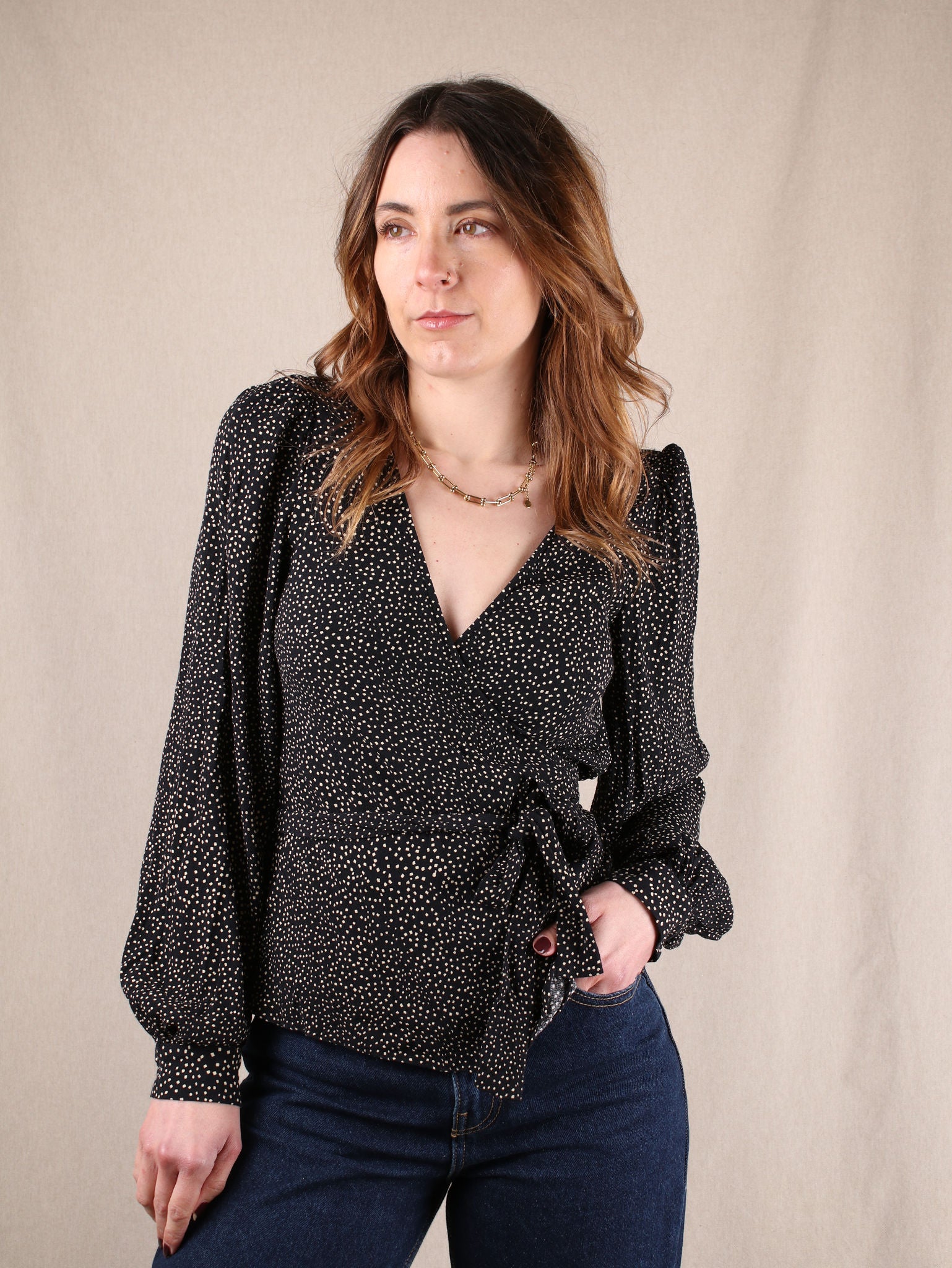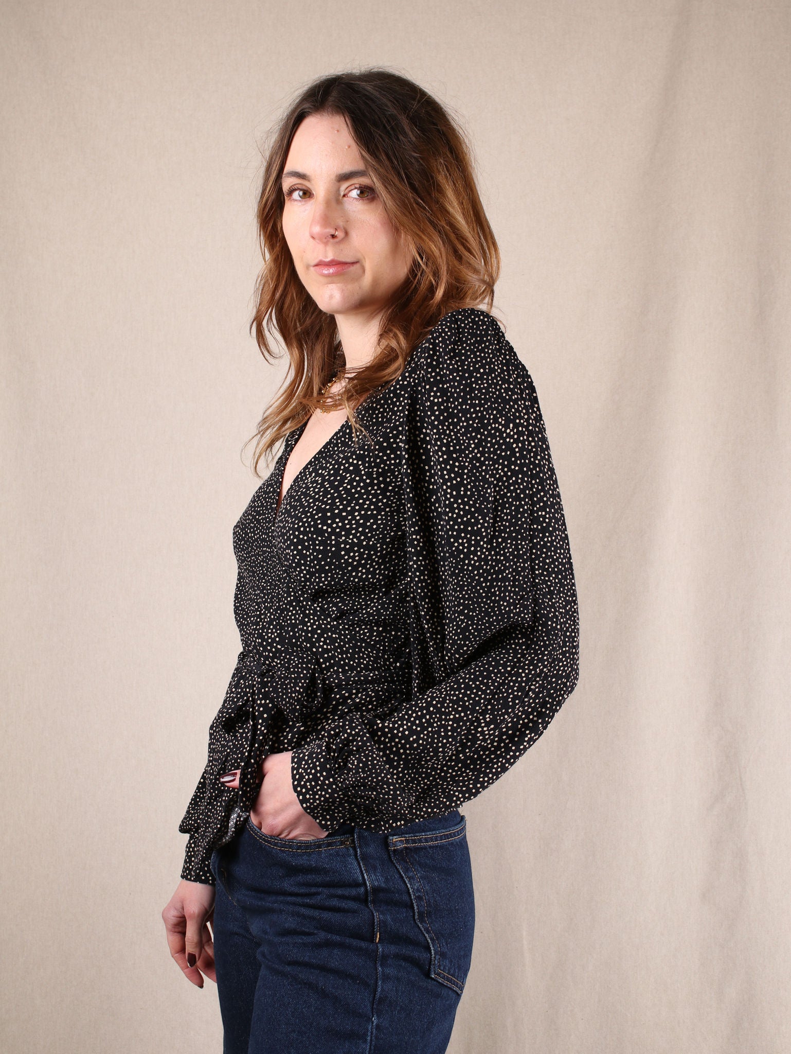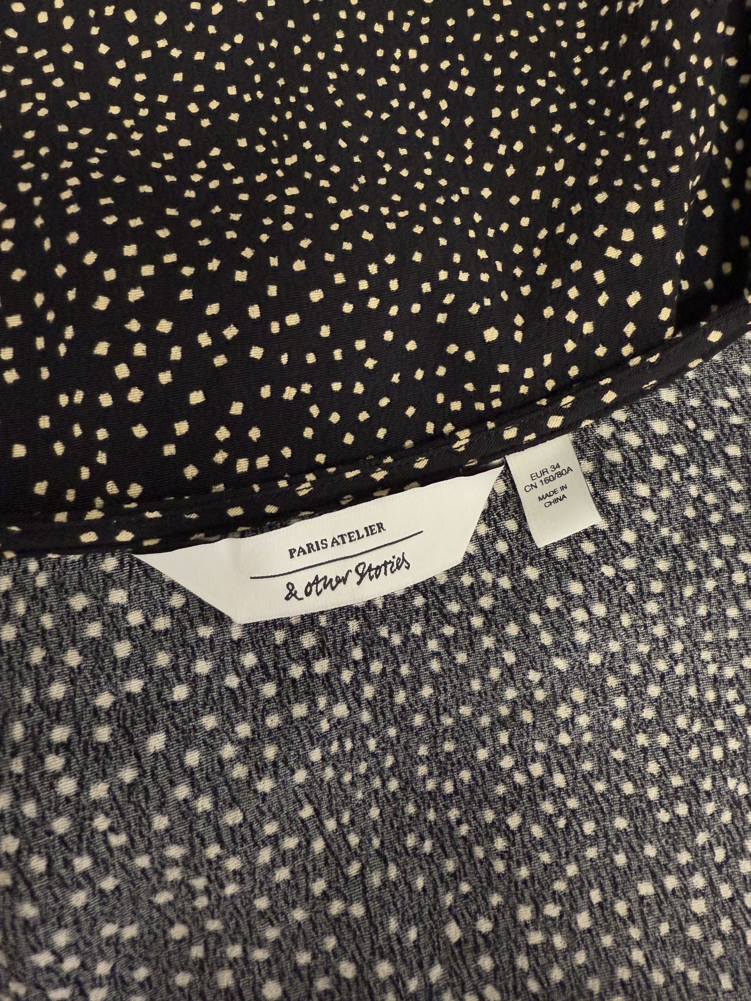 Secondhand Wickel-Bluse von & Other Stories aus Crêpe mit Pünktchen in Schwarz-Weiß, Puffärmeln und Schleife.