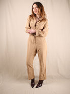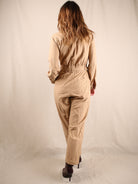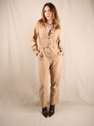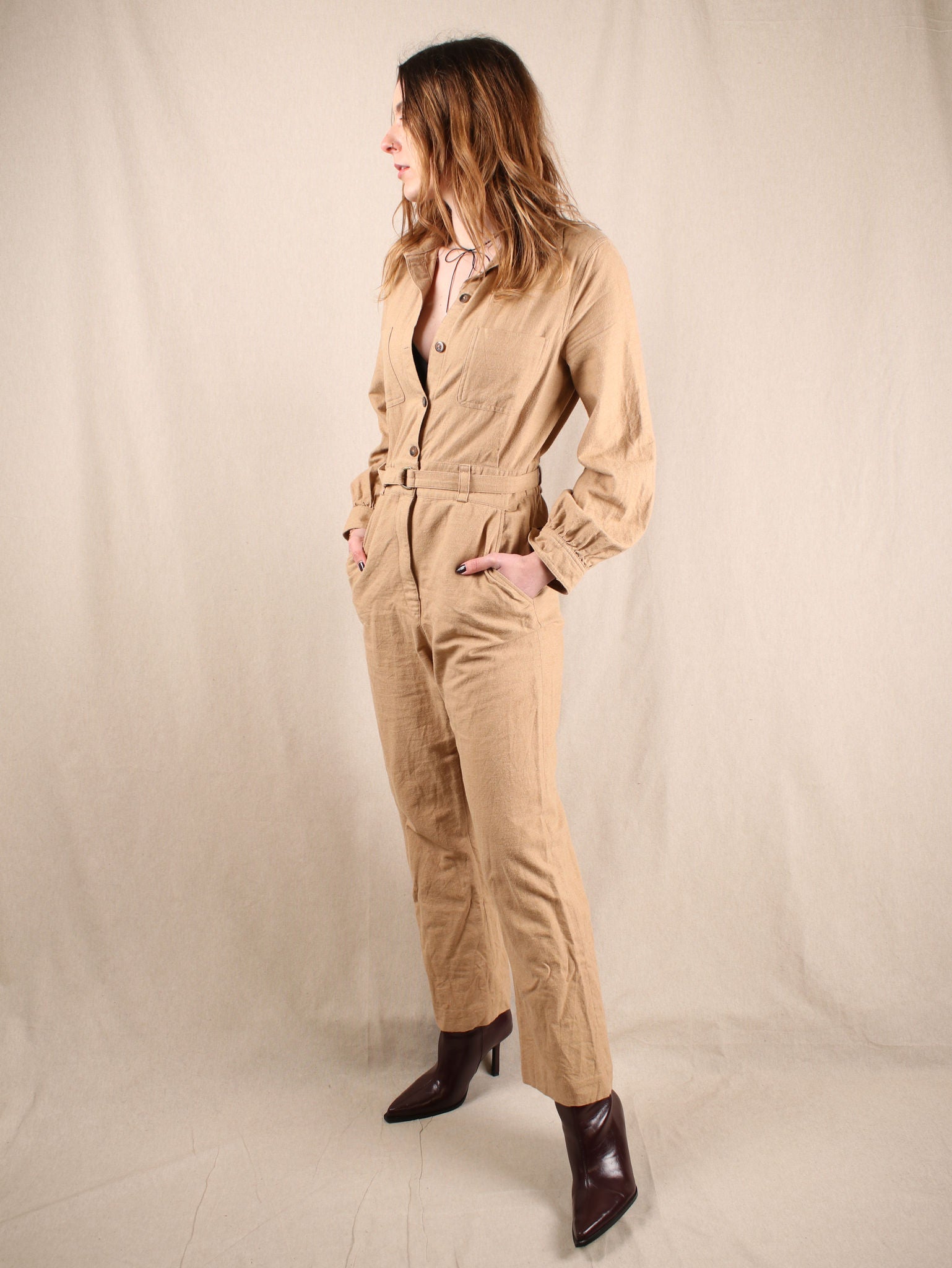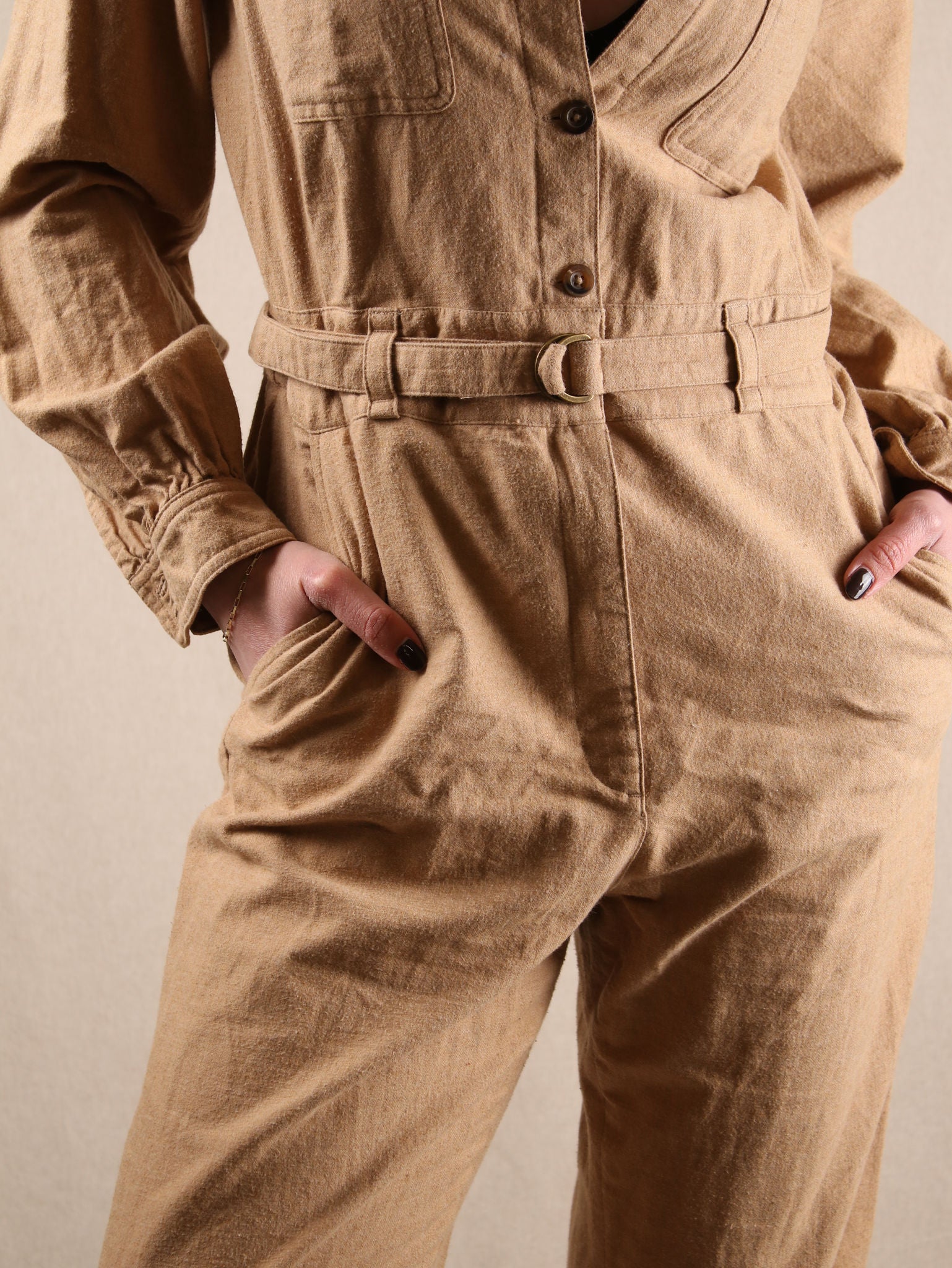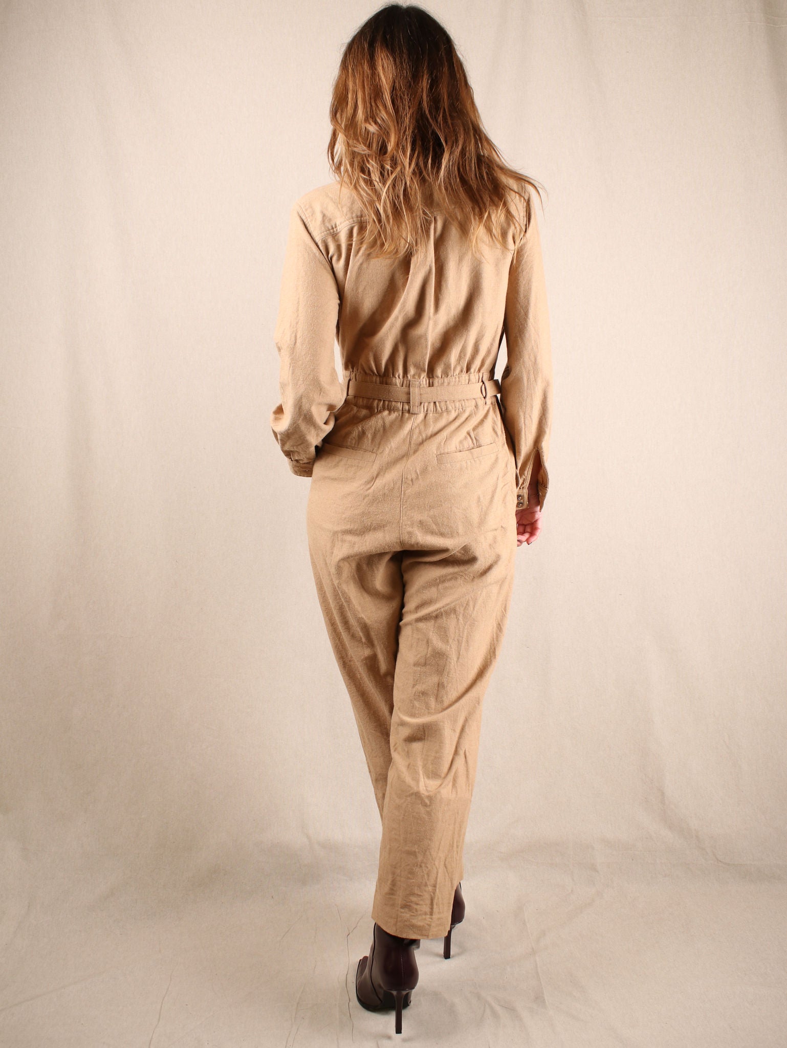 Ein Preloved-Jumpsuit aus hochwertiger Baumwolle, der mühelos Lässigkeit und Stil vereint. Die robuste, aber weiche Wolloptik sorgt für einen authentischen Workwear-Vibe, während die taillierte Silhouette mit Gürtel deine Figur perfekt in Szene setzt. Egal, ob mit Chunky Boots für einen edgy Look oder mit Heels für einen modernen Twist – dieses Teil ist ein echtes Multitalent für deine nachhaltige Garderobe.