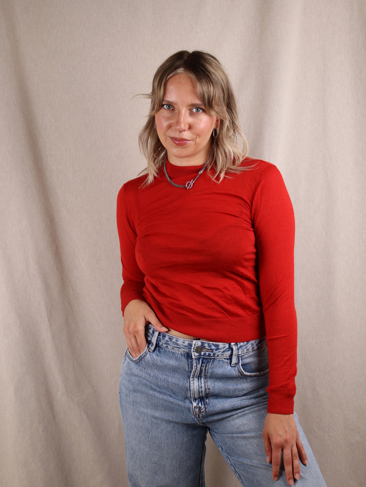 Der Artikel wurde gerne getragen, befindet sich aber weiterhin in gutem Zustand. Kleinere Gebrauchsspuren wie leichtes Pilling oder dezente Reparaturen können vorkommen, auffälligere Mängel listen wir selbstverständlich explizit auf.